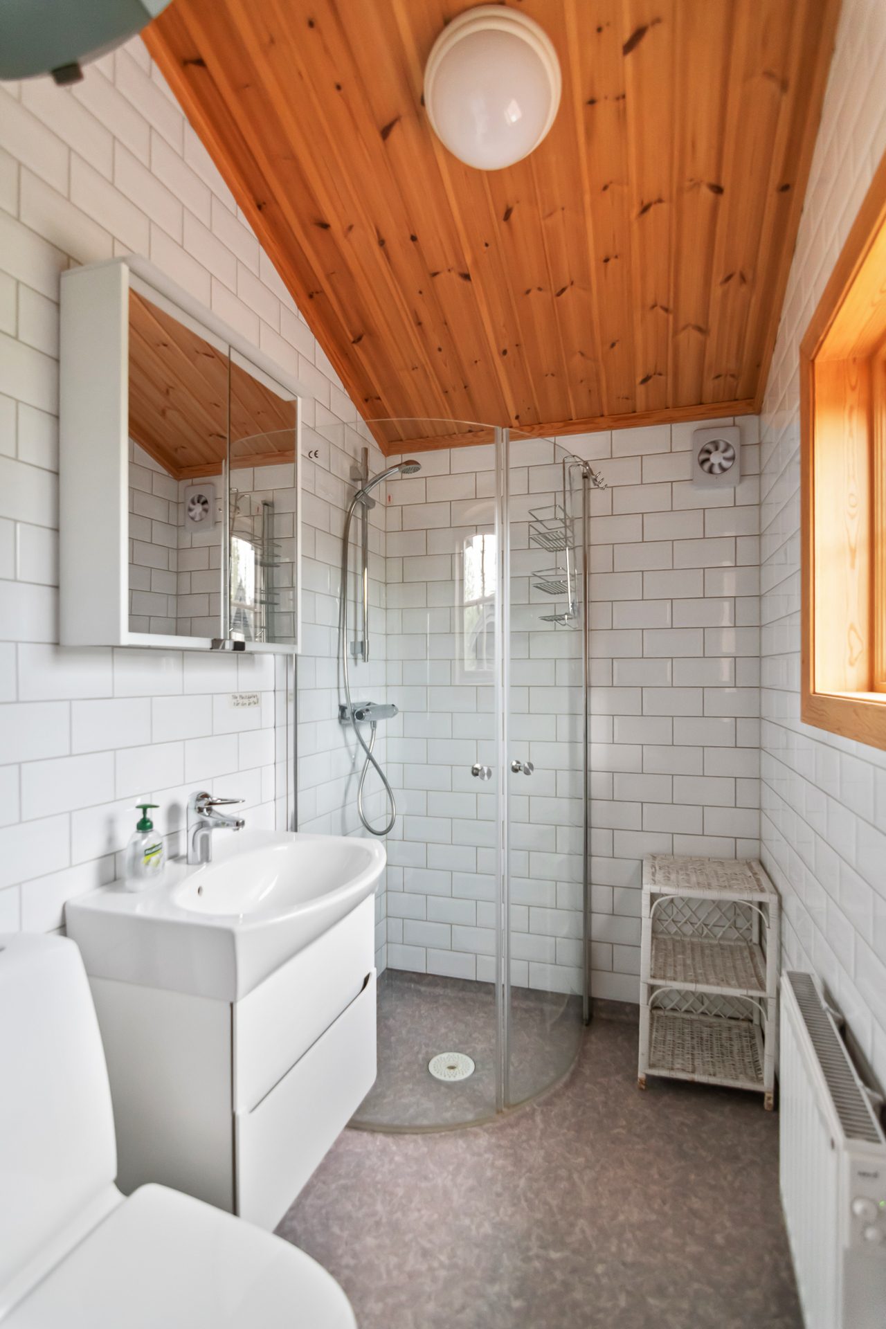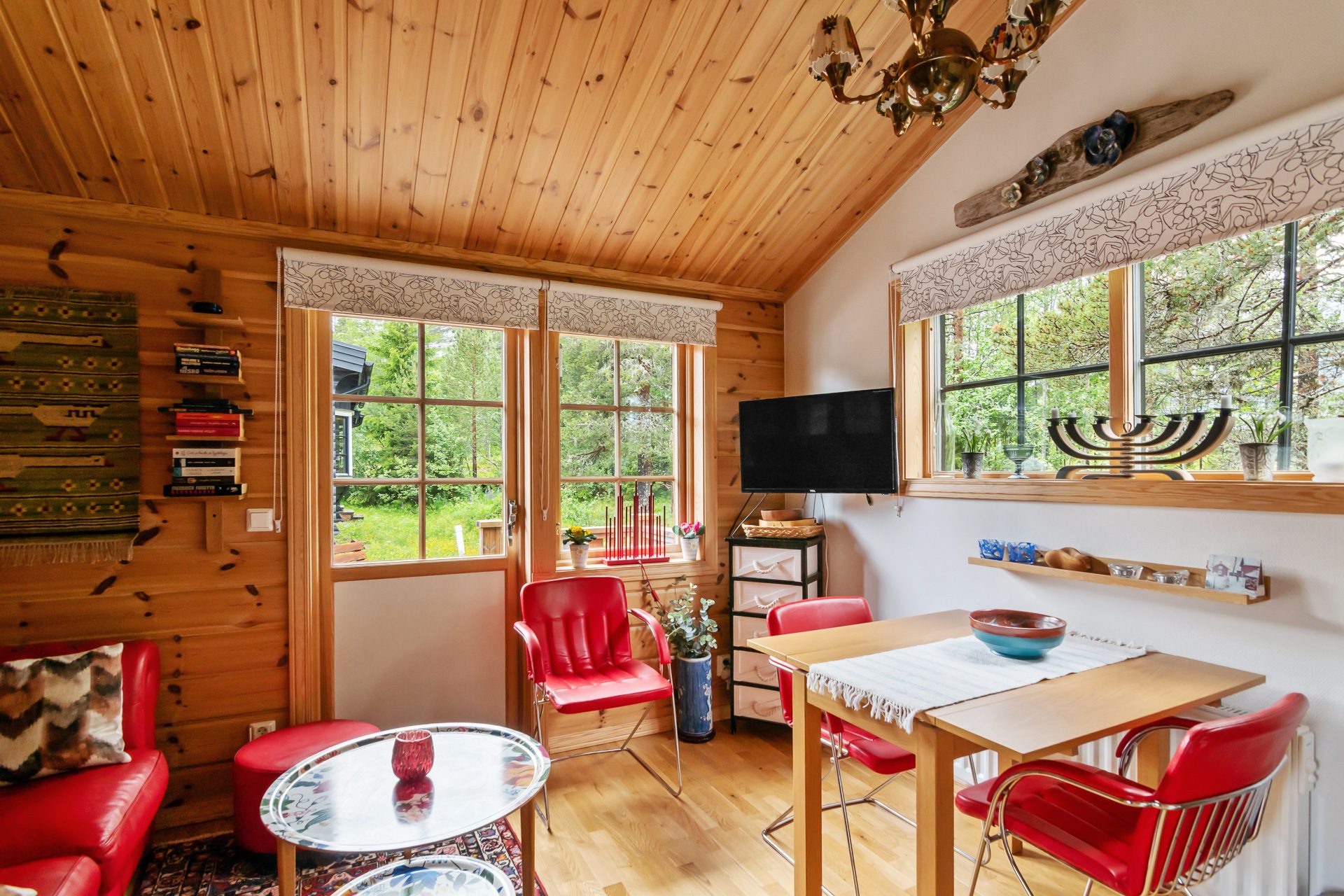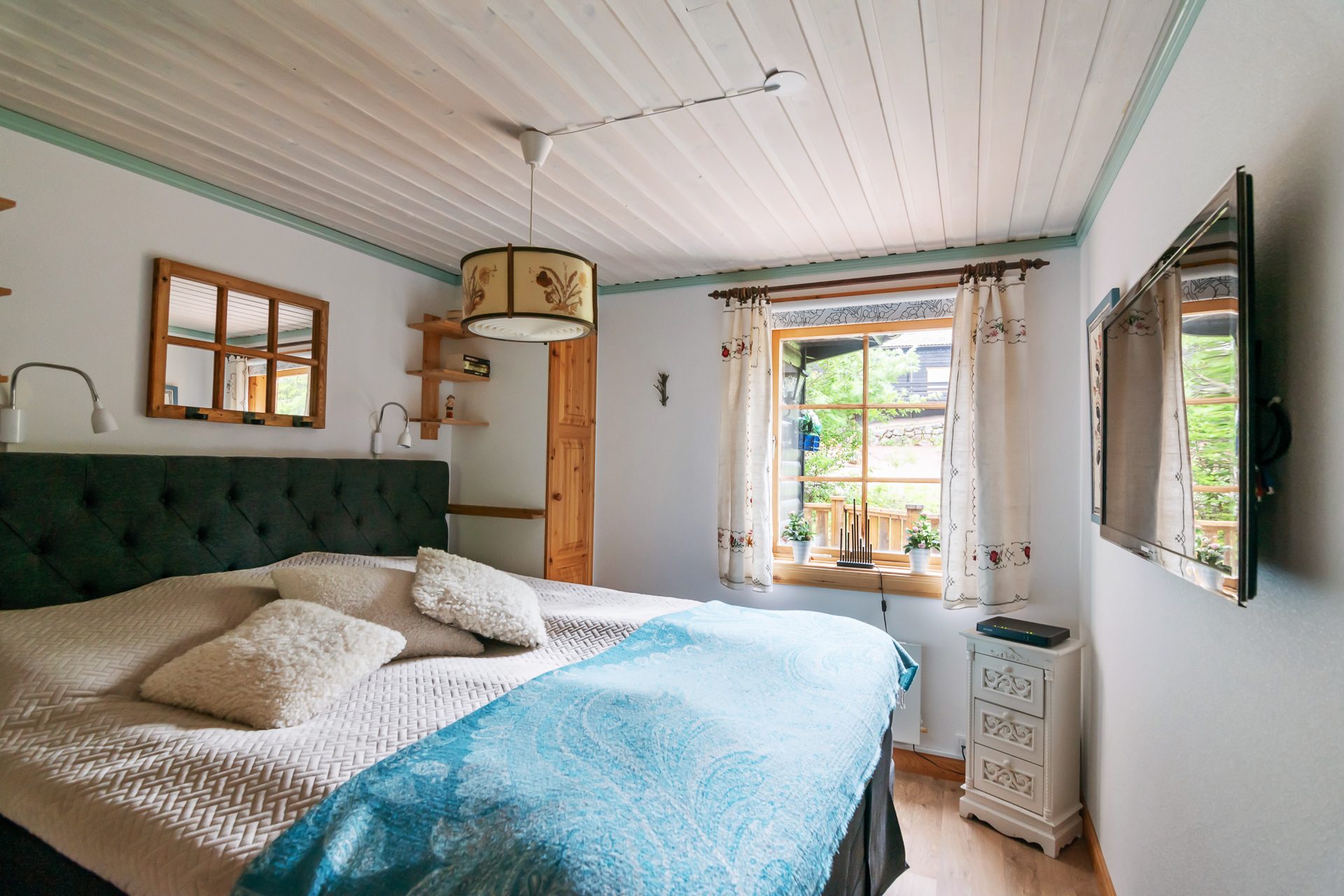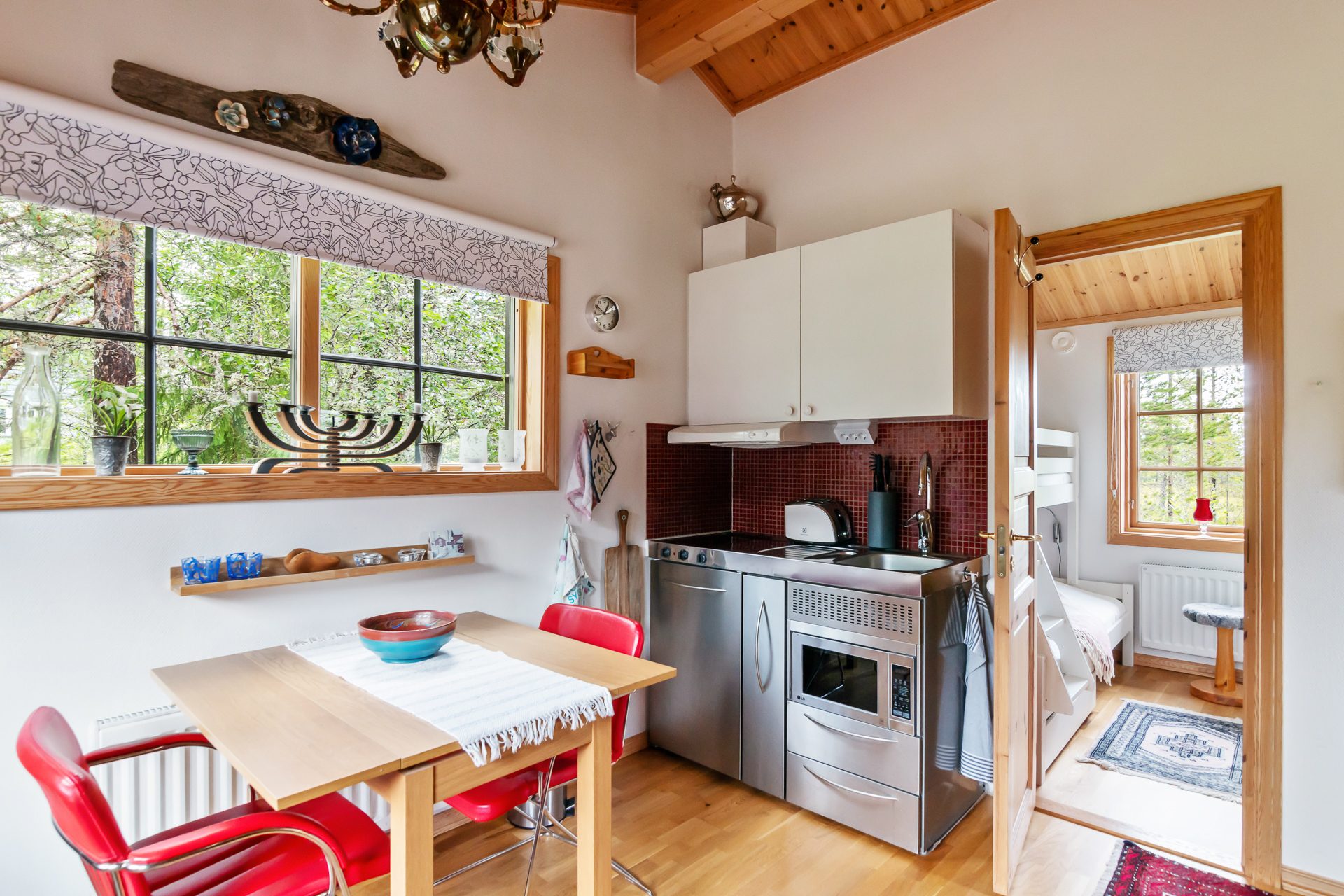 Liten hall med avhängningsdel öppnar upp mot allrummet med öppen planlösning mot köket. Här samsas soffhörna, kök och matplats. Köket har full maskinell utrustning som håller bra standard. Badrum med ingång från hallen utrustat med wc, dusch och tvättställ. Sovrum med familjesäng och utrymme för tre sovplatser. Det går utmärkt att använda allrummet och soffan för ytterligare bäddar för den som önskar.