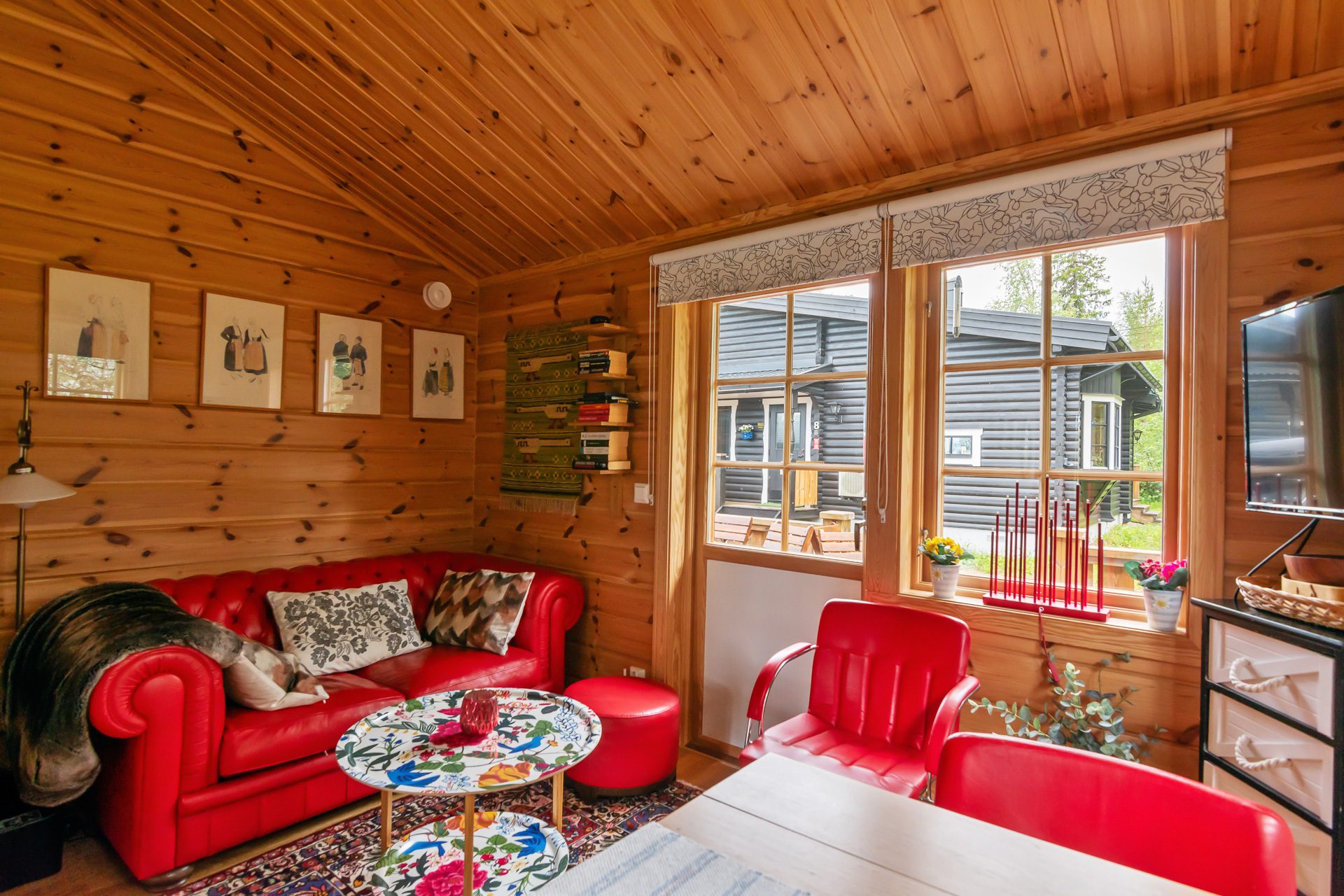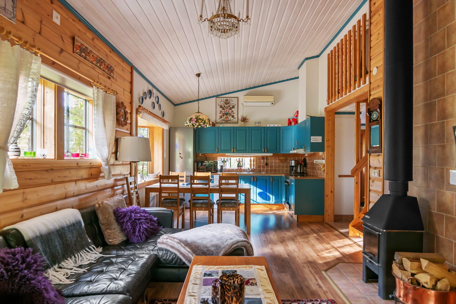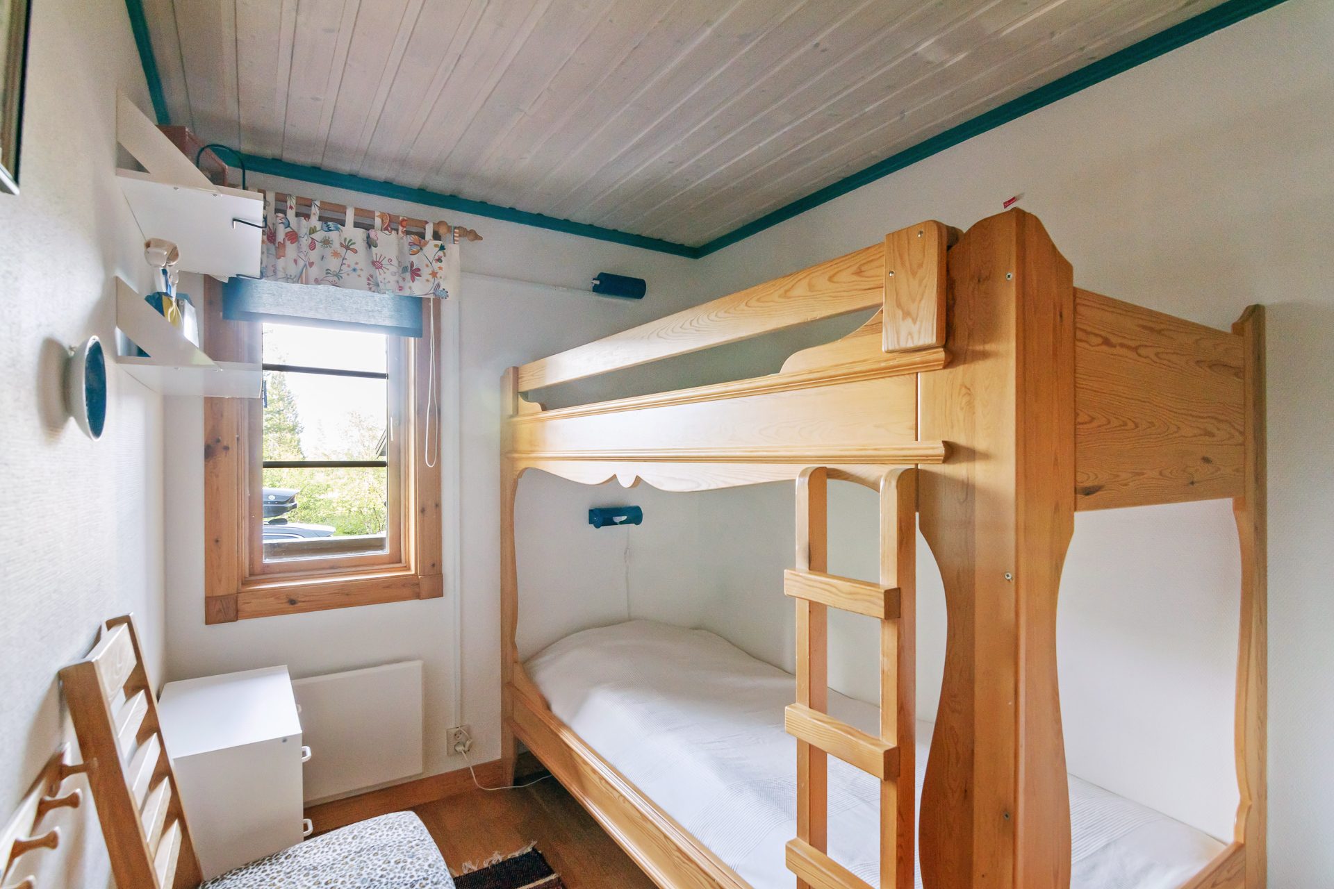 På entréplanet hittar du en välkomnande hall med plats för avhängning och garderober. Kök med goda arbetsytor, bra förvaring, nedsänkt diskho och spishäll i bänkskiva av trä, kyl/frys, diskmaskin och mikro. Matplats för 6-8 personer. Vardagsrummet har öppen planlösning med köket och är generöst med goda sällskapsytor, burspråk, trevlig braskamin och utgång till den trädäckade altanen med soligt läge. Vidare på samma våningsplan finns det två sovrum varav ett är master bedroom med plats för dubbelsäng och fasta garderober. Det andra sovrummet är något mindre inrett med våningssäng i den ena delen och klädvårdsrum i den andra delen. Vidare finns ett helkaklat badrum med duschhörna, handfat med kommod, wc och bastu för skön avkoppling efter en dag full med aktiviteter.