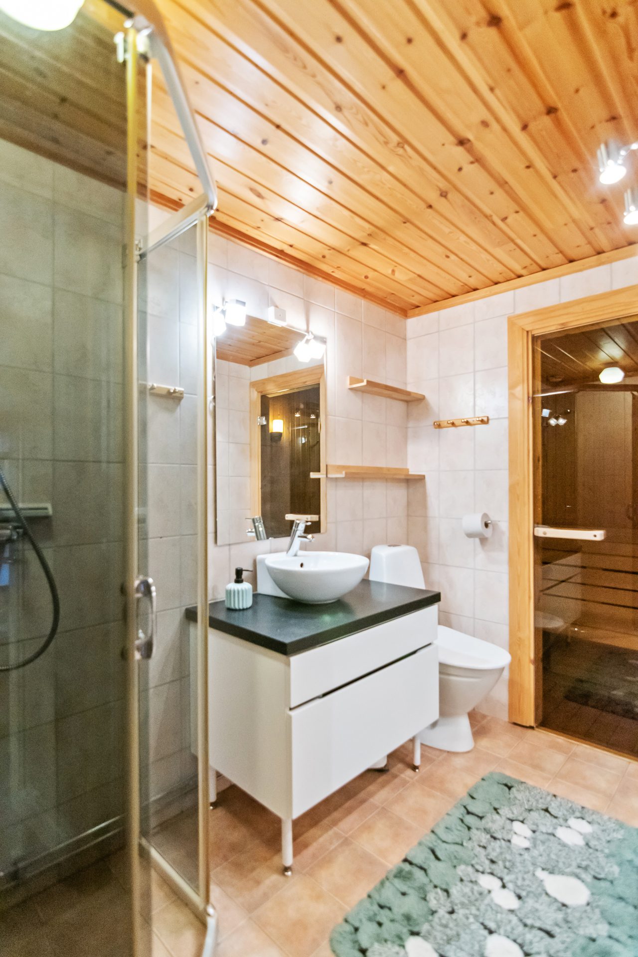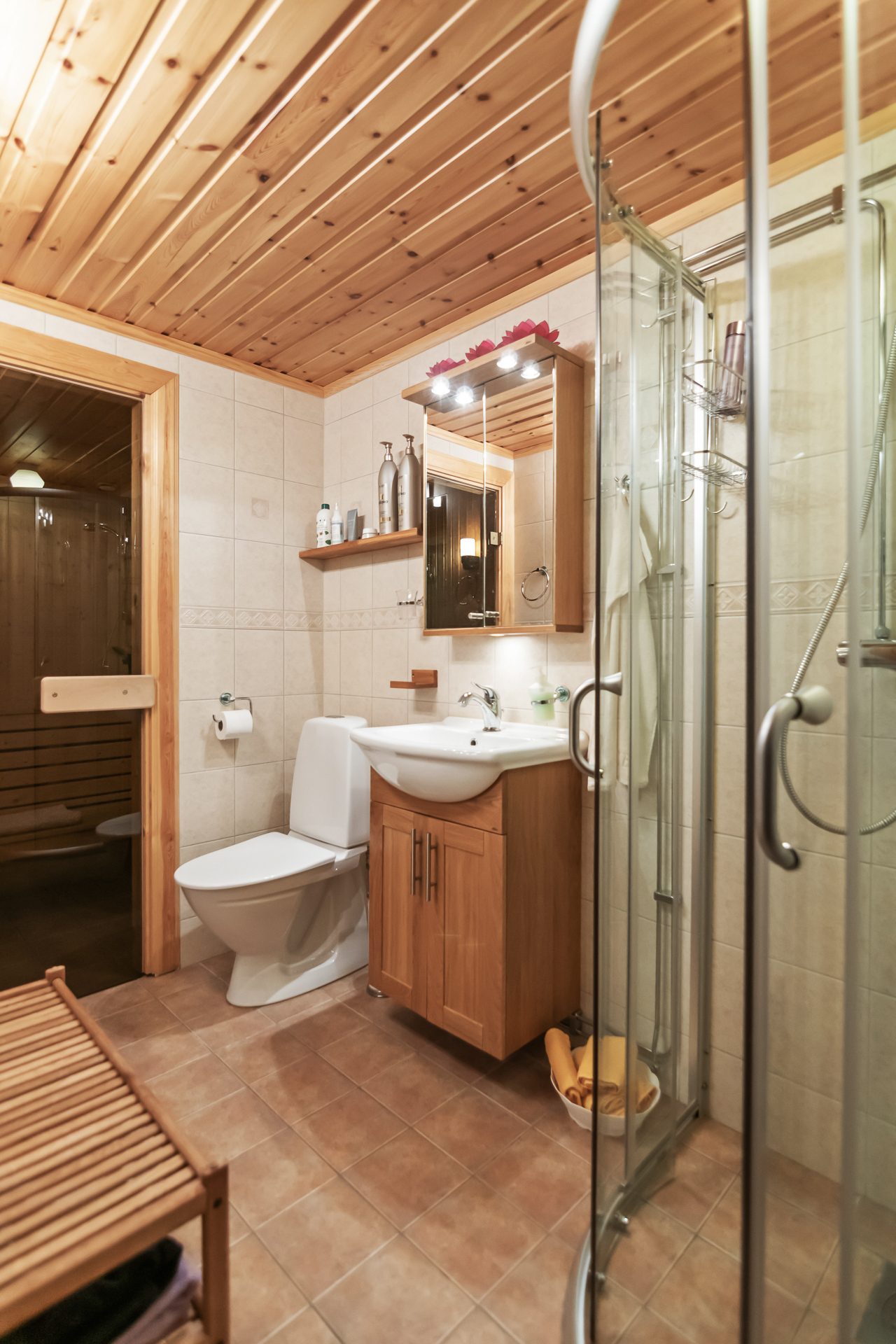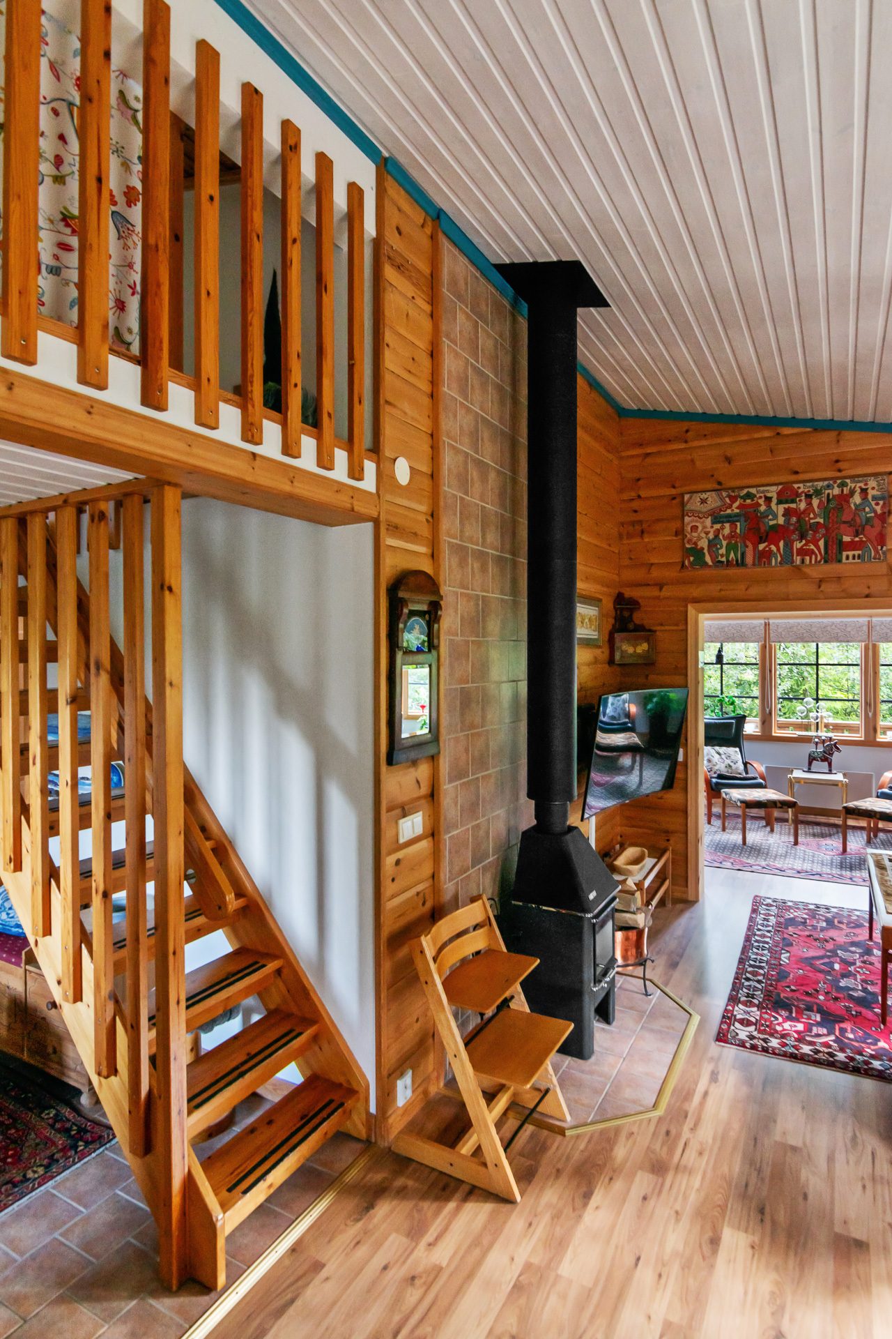 På entréplanet hittar du en välkomnande hall med plats för avhängning och garderober. Kök med goda arbetsytor, bra förvaring, nedsänkt diskho och spishäll i bänkskiva av trä, kyl/frys, diskmaskin och mikro. Matplats för 6-8 personer. Vardagsrummet har öppen planlösning med köket och är generöst med goda sällskapsytor, burspråk, trevlig braskamin och utgång till den trädäckade altanen med soligt läge. Vidare på samma våningsplan finns det två sovrum varav ett är master bedroom med plats för dubbelsäng och fasta garderober. Det andra sovrummet är något mindre inrett med våningssäng i den ena delen och klädvårdsrum i den andra delen. Vidare finns ett helkaklat badrum med duschhörna, handfat med kommod, wc och bastu för skön avkoppling efter en dag full med aktiviteter.