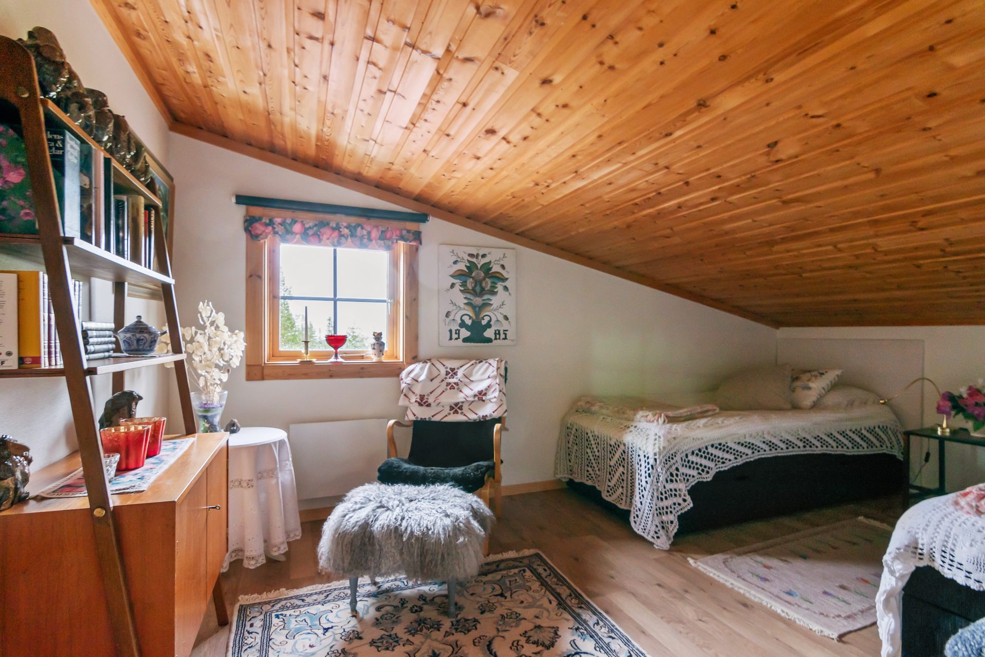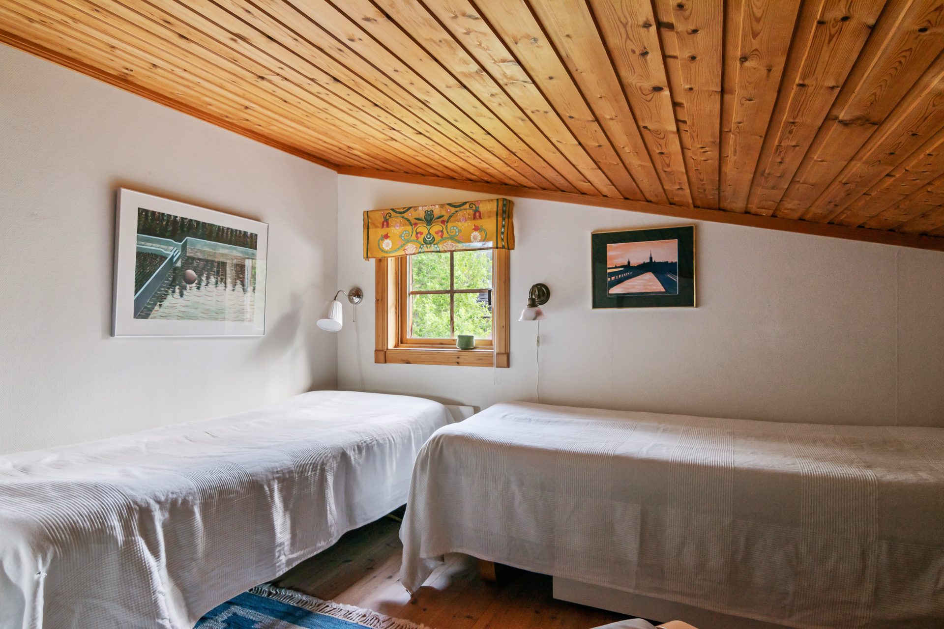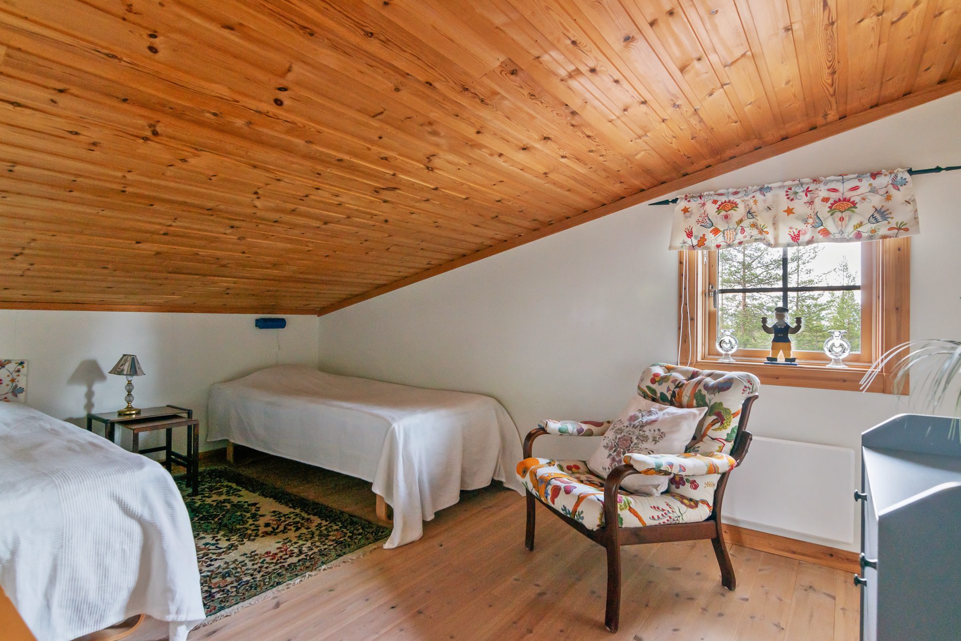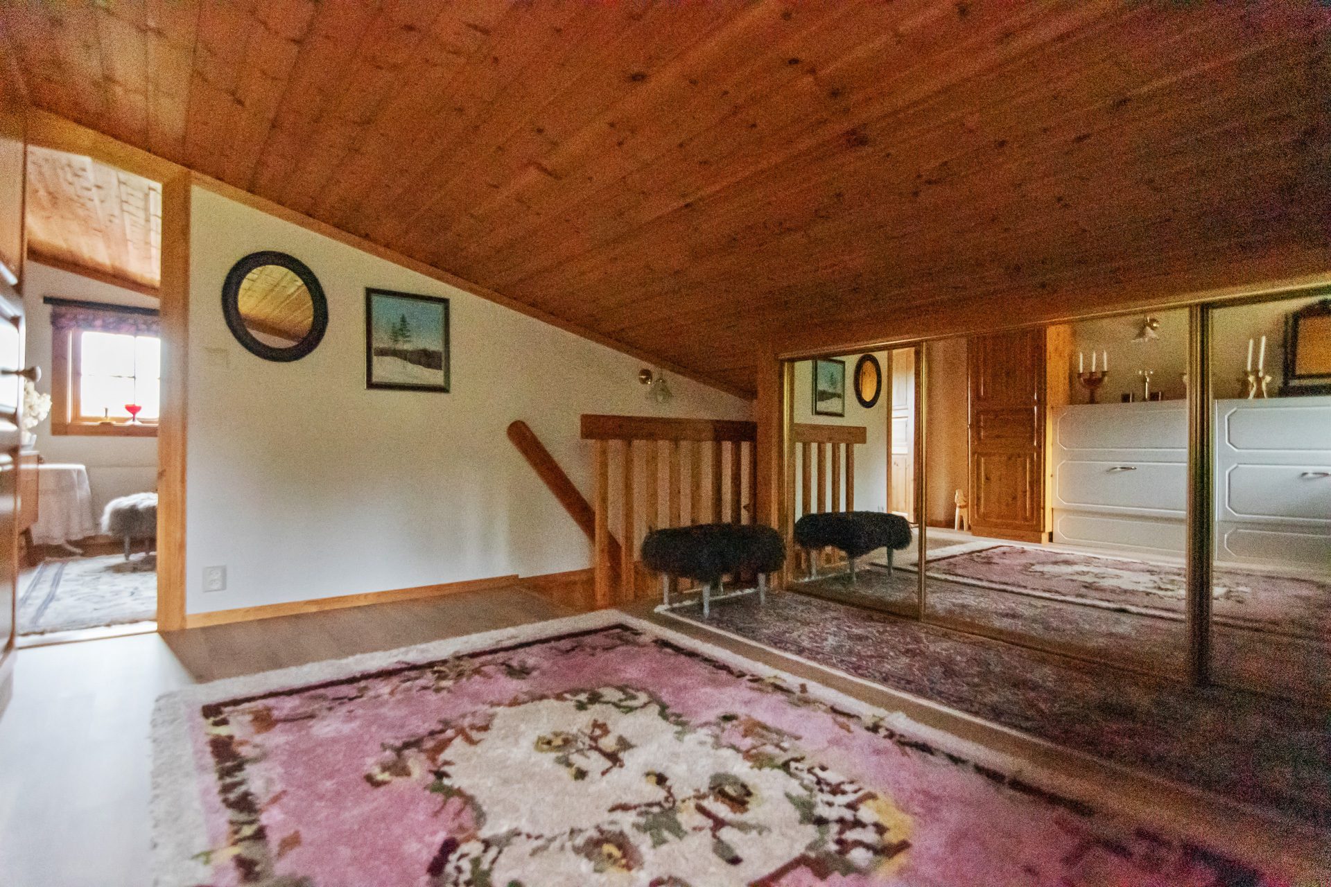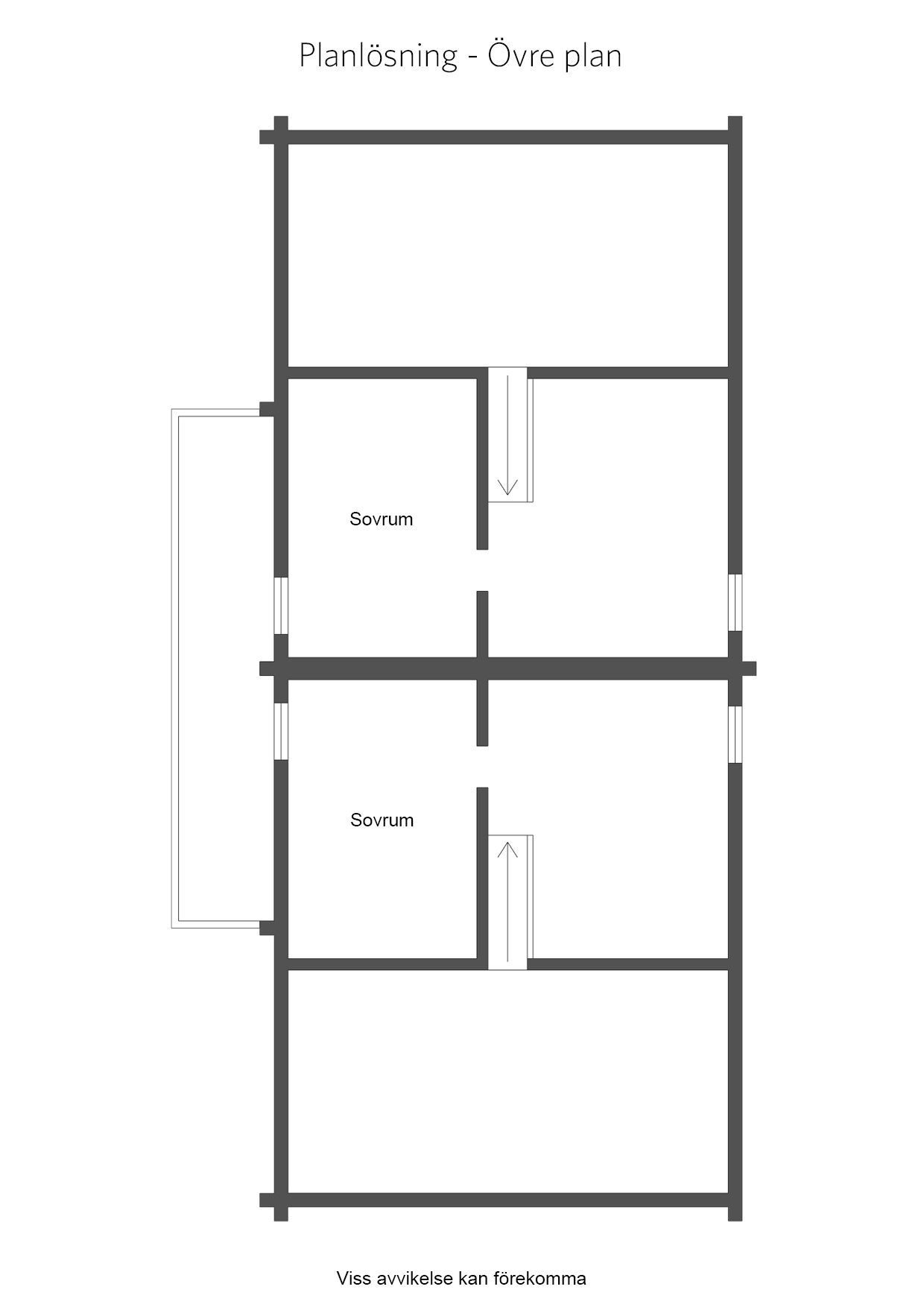 På det övre våningsplanet finns ett rymligt allrum som med fördel används som ett extra sovrum eller tv-hörna. Intill allrummet har vi ett stort sovrum med fönster mot entrésidan.