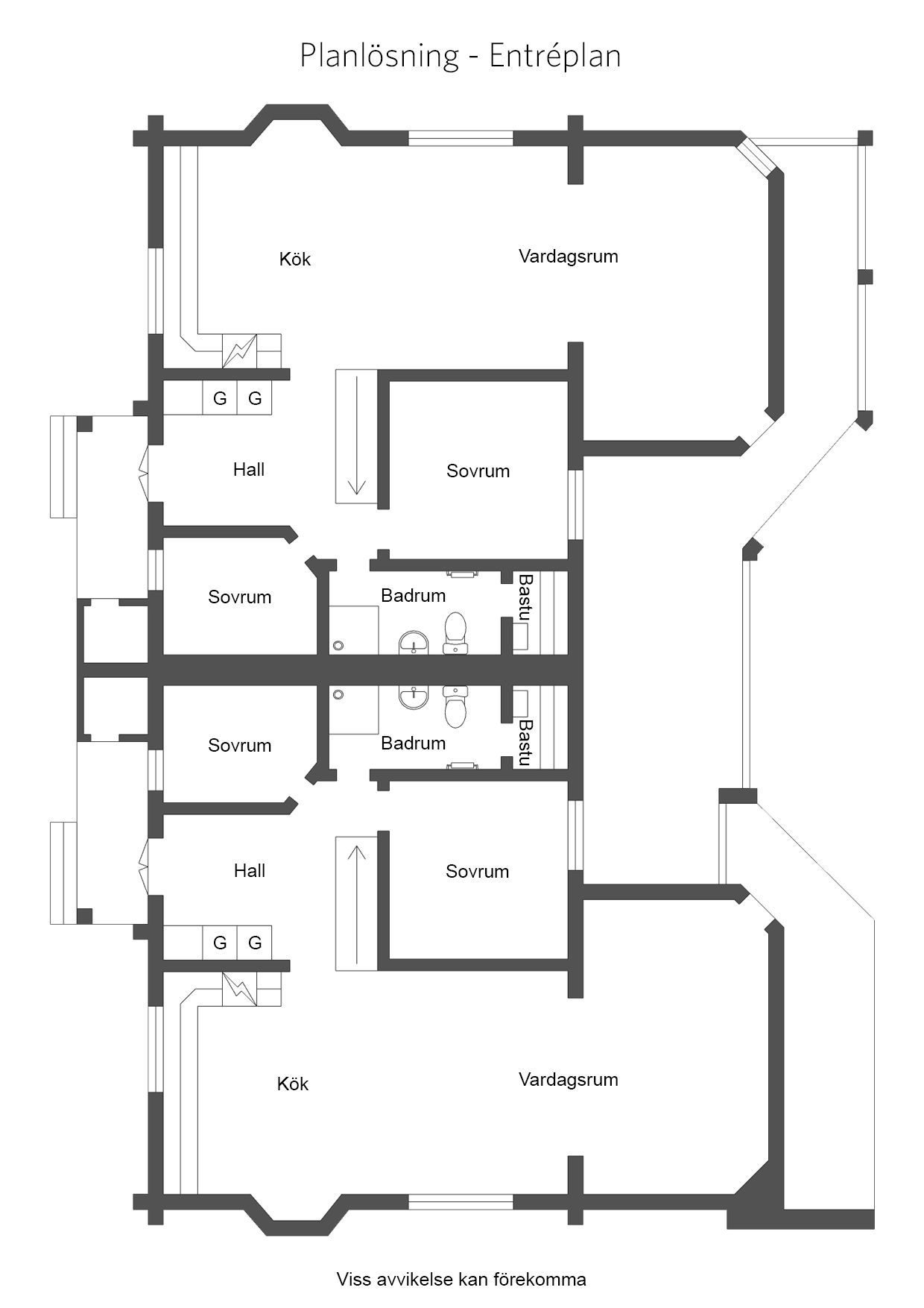 - Allmän beskrivning: Två separata lägenheter om fem rum och kök med öppen planlösning. Varje lägenhetsdel har kök, vardagsrum, badrum och tre sovrum fördelat på två våningsplan.