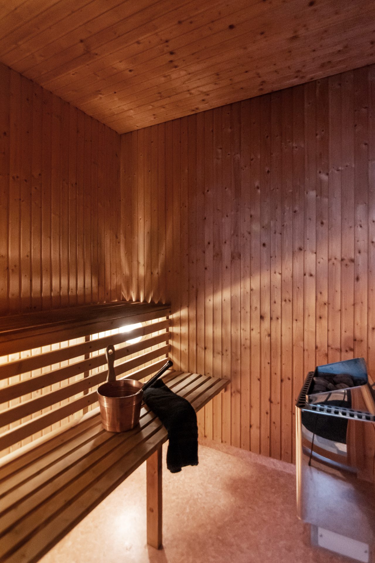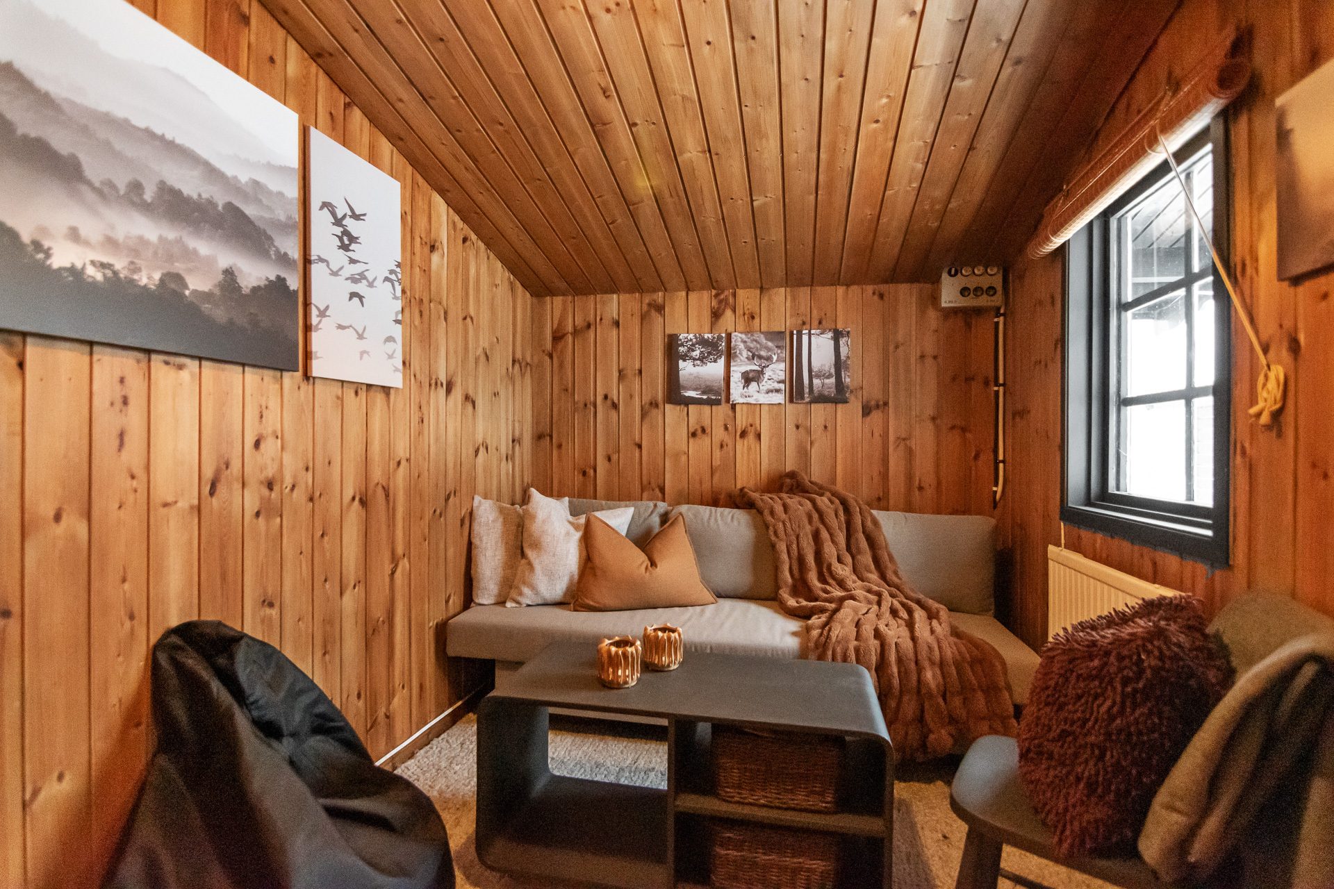 Huvudstugan omfattar 63 kvm boarea och har ett öppet kök och vardagsrum med högt i tak, vilket skapar en ljus och rymlig känsla. Här finns två sovrum, varav ett med dubbelsäng och ett med våningssäng. Ovanför finns ett sovloft med två dubbelsängar och ett förråd. Tillsammans ger detta åtta bäddar i huvudstugan. Förrådet har används som "koja" till barnen, men har mycket lagringsplats under skråtak.