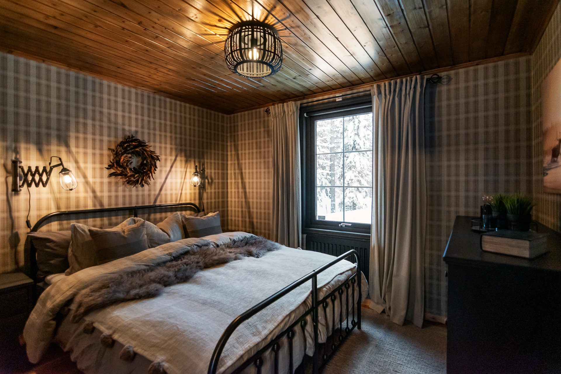 Sovrum med plats för dubbelsäng. Trägolv, tapetserade väggar samt paneltak. Här finns också en större byrå och två sängbord.