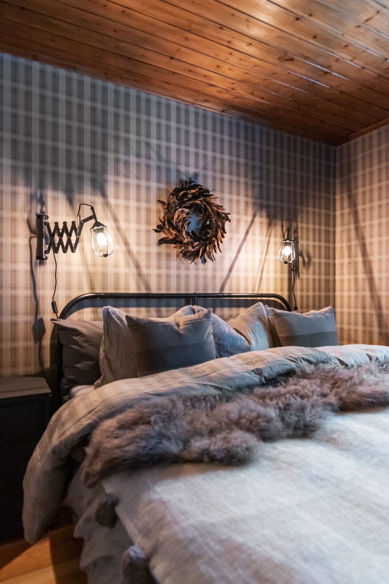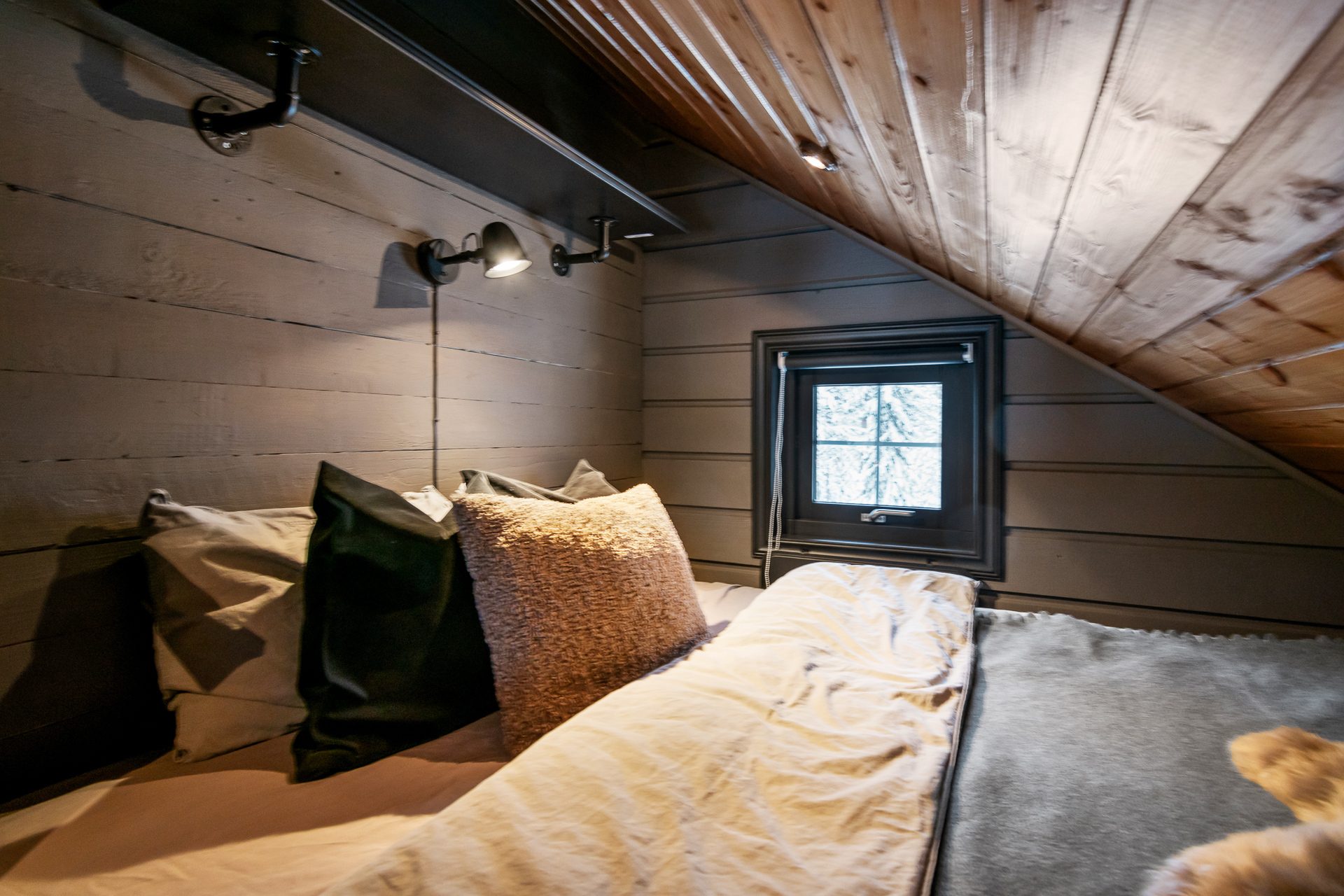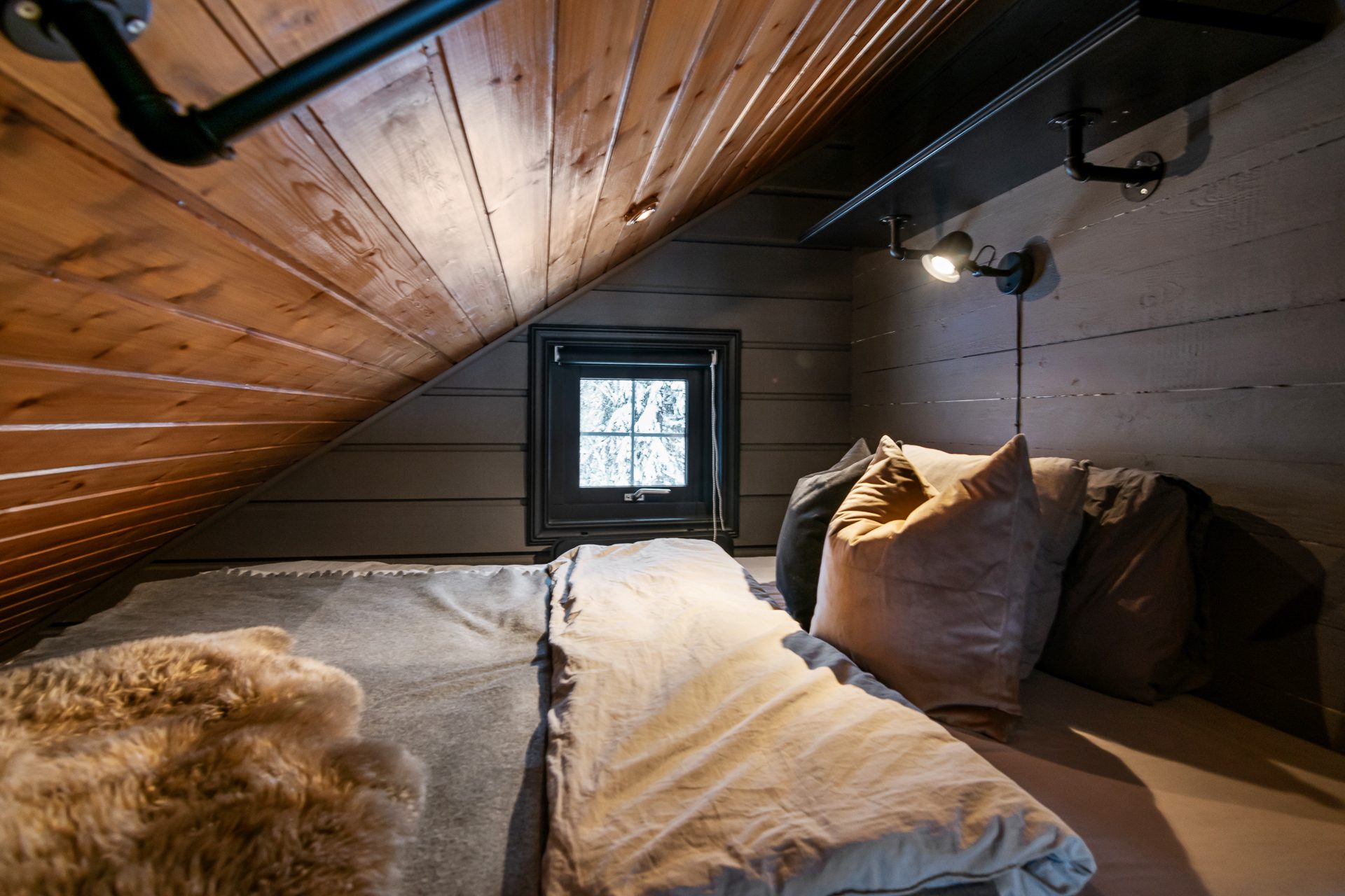 Stort sovloft med 2 platsbyggda dubbelsängar och en vägg som fungerar som rumsavdelare och sänggavel. Här ligger trägolv och väggar och tak har panel. På sovloftet finns också en rymlig förrådsdel.