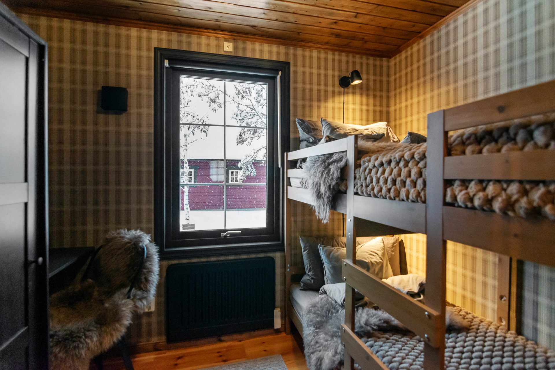 Sovrum med plats för en våningsäng. Trägolv, tapetserade väggar och paneltak. Här finns idag ett skåp och ett skrivbord.