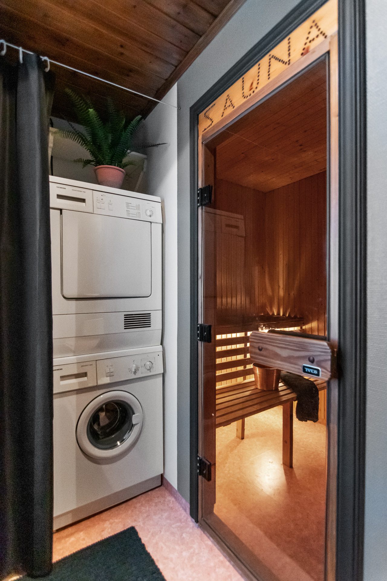 Stort badrum med våtrumsmatta, våtrumstapet och paneltak. Här hittar du wc, handfat, dusch, tvättmaskin, torktumlare, VVD samt en bastu. Utgång till den bakre altanen med inglasat uterum.
