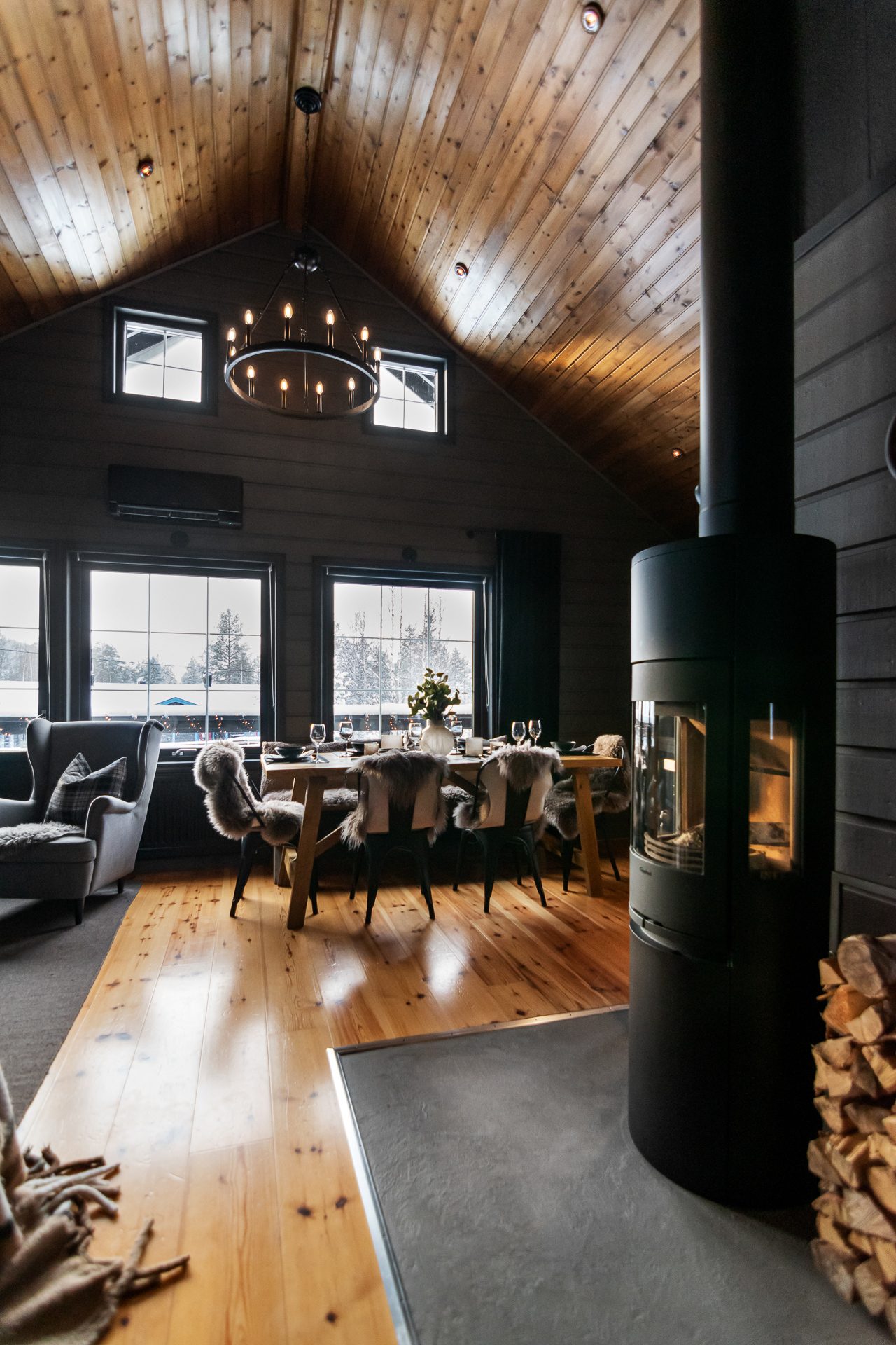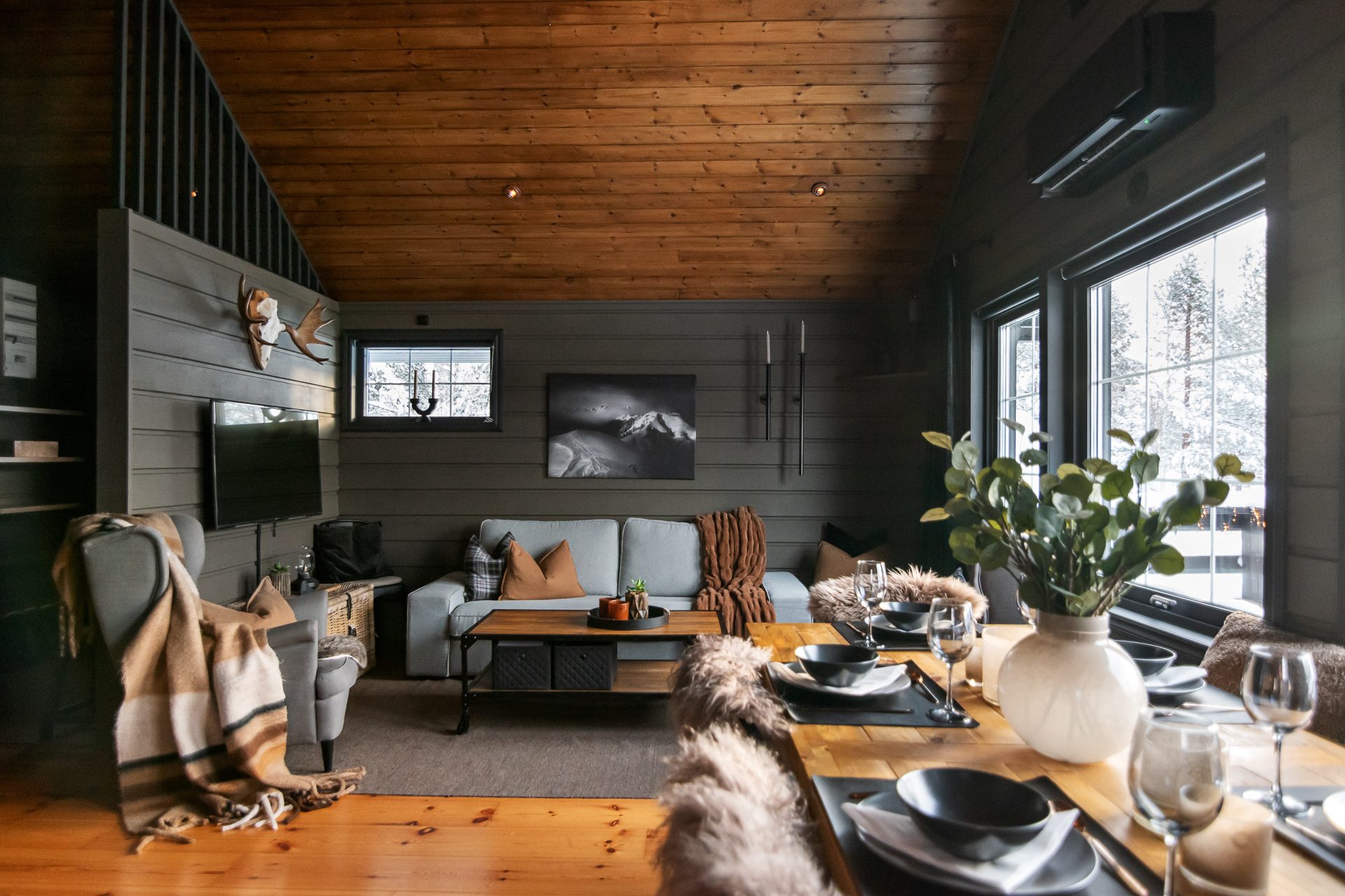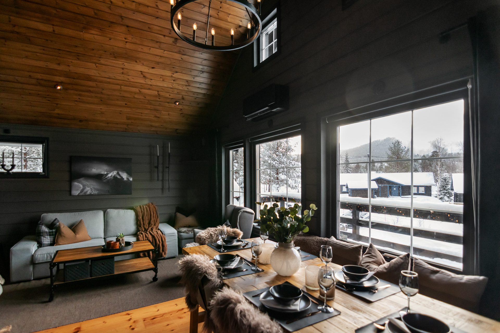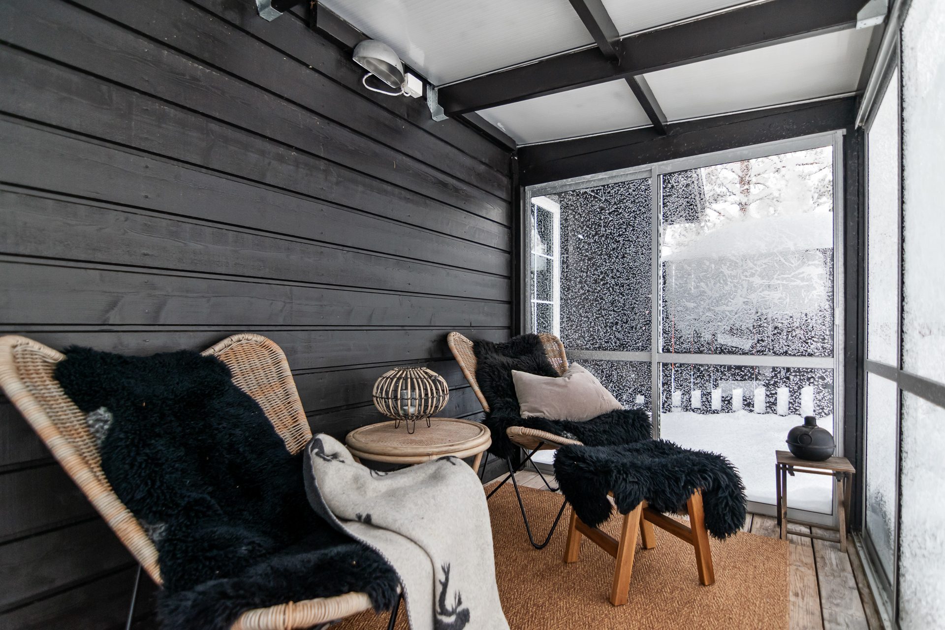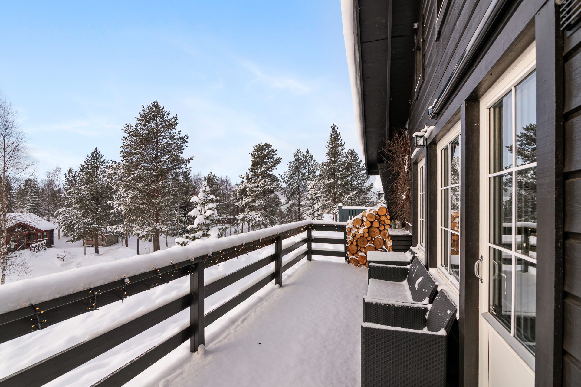 De sociala ytorna förlängs via ett inglasat uterum på baksidan av huvudstugan samt en stor terrass i sydläge med goda solförhållanden och fri utsikt mot backarna.