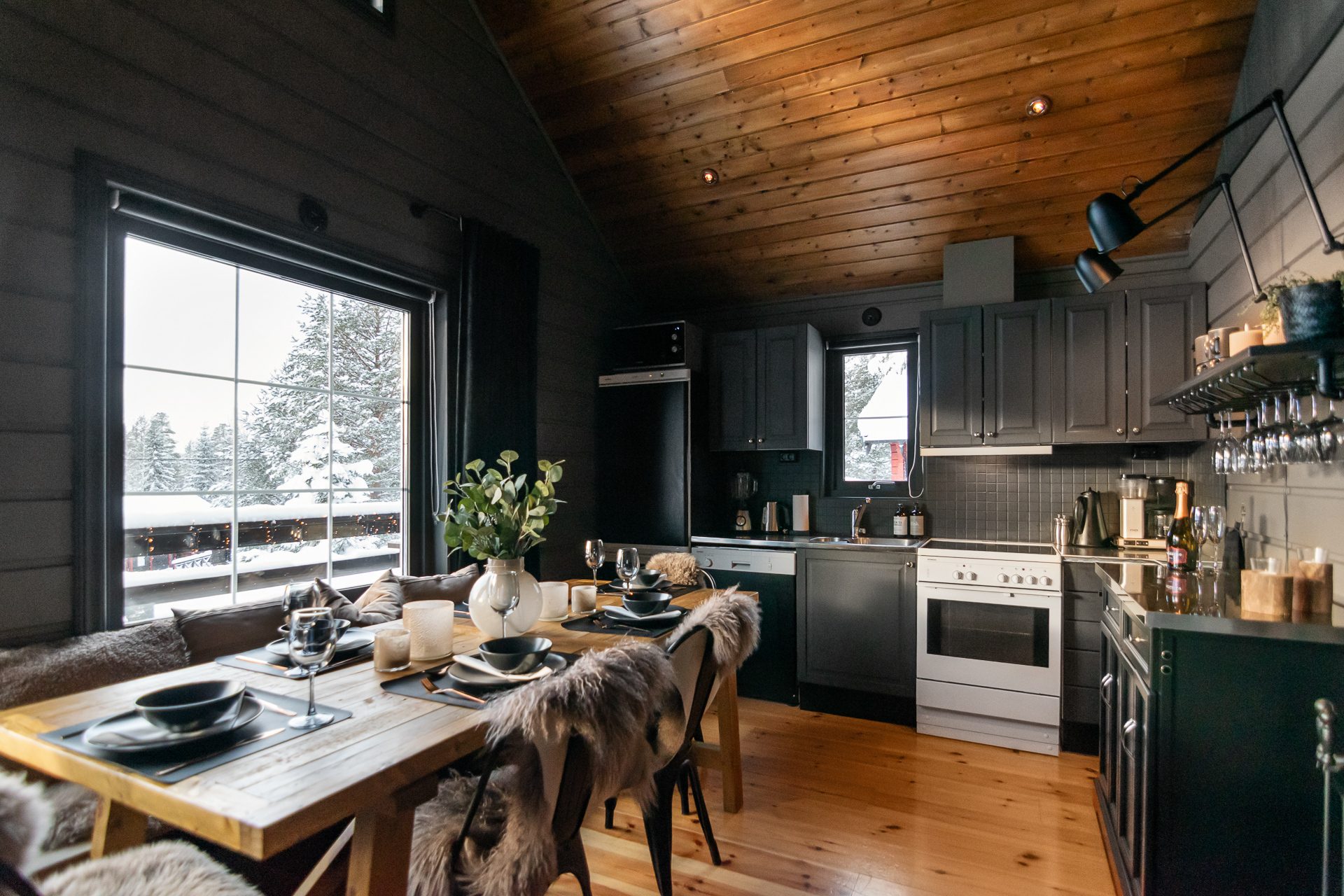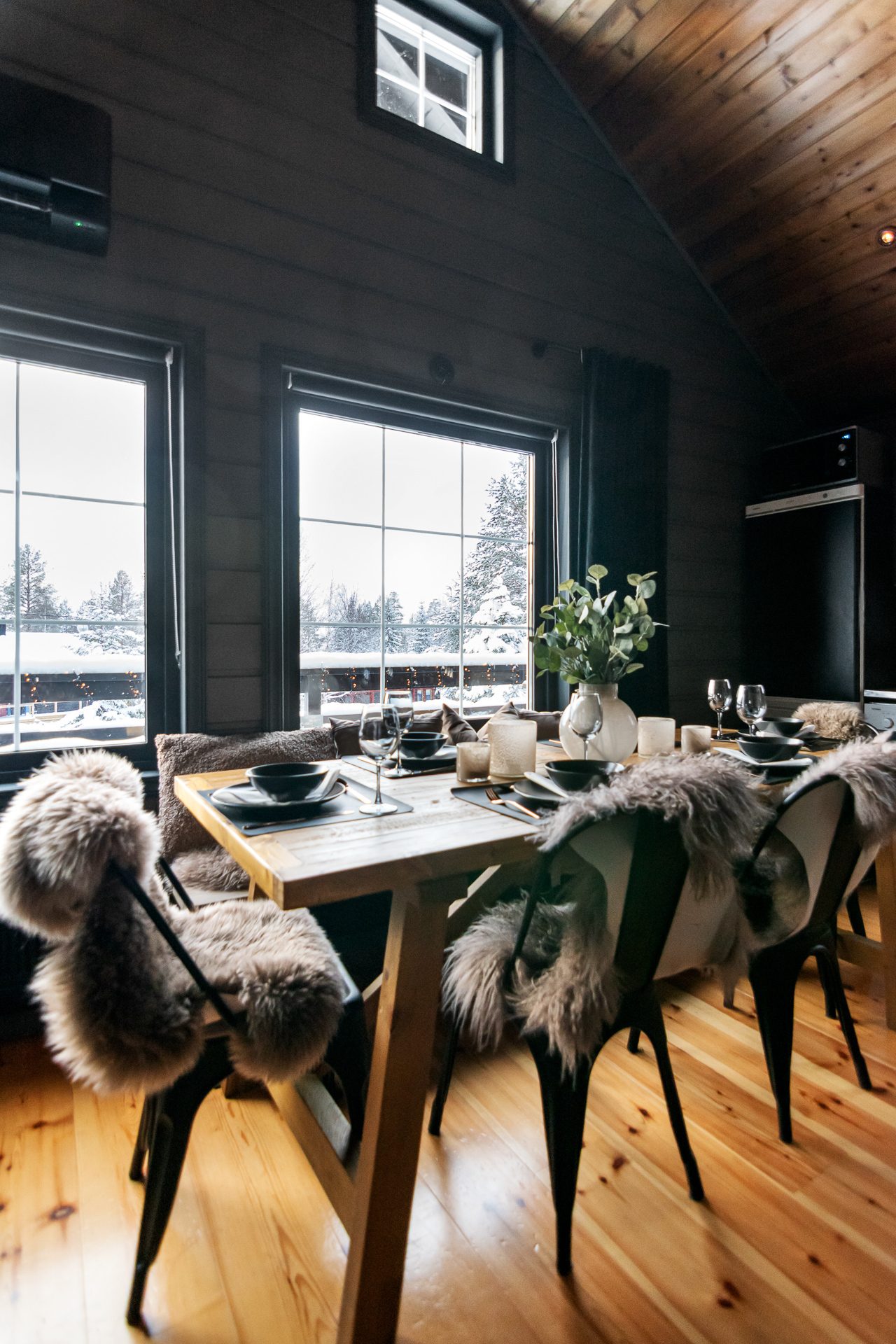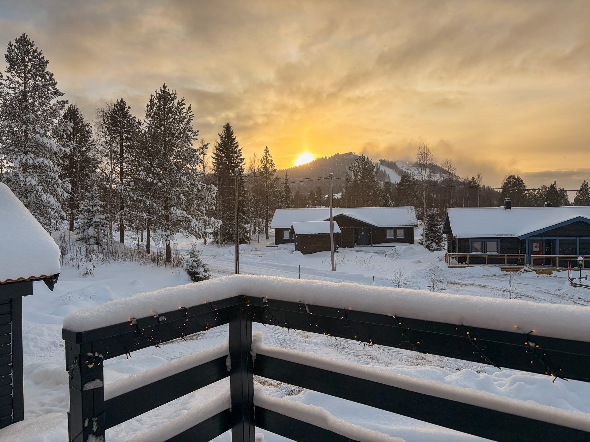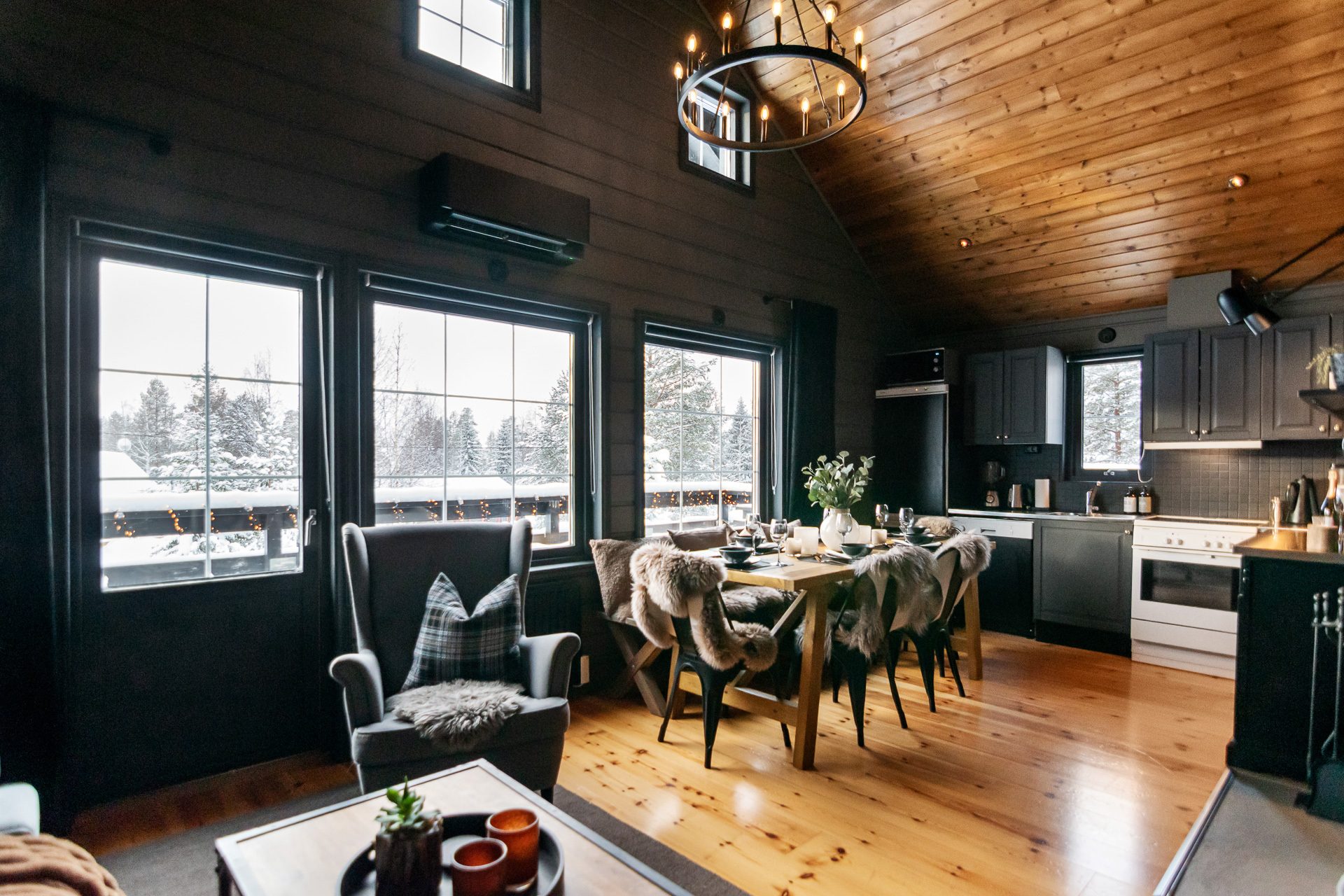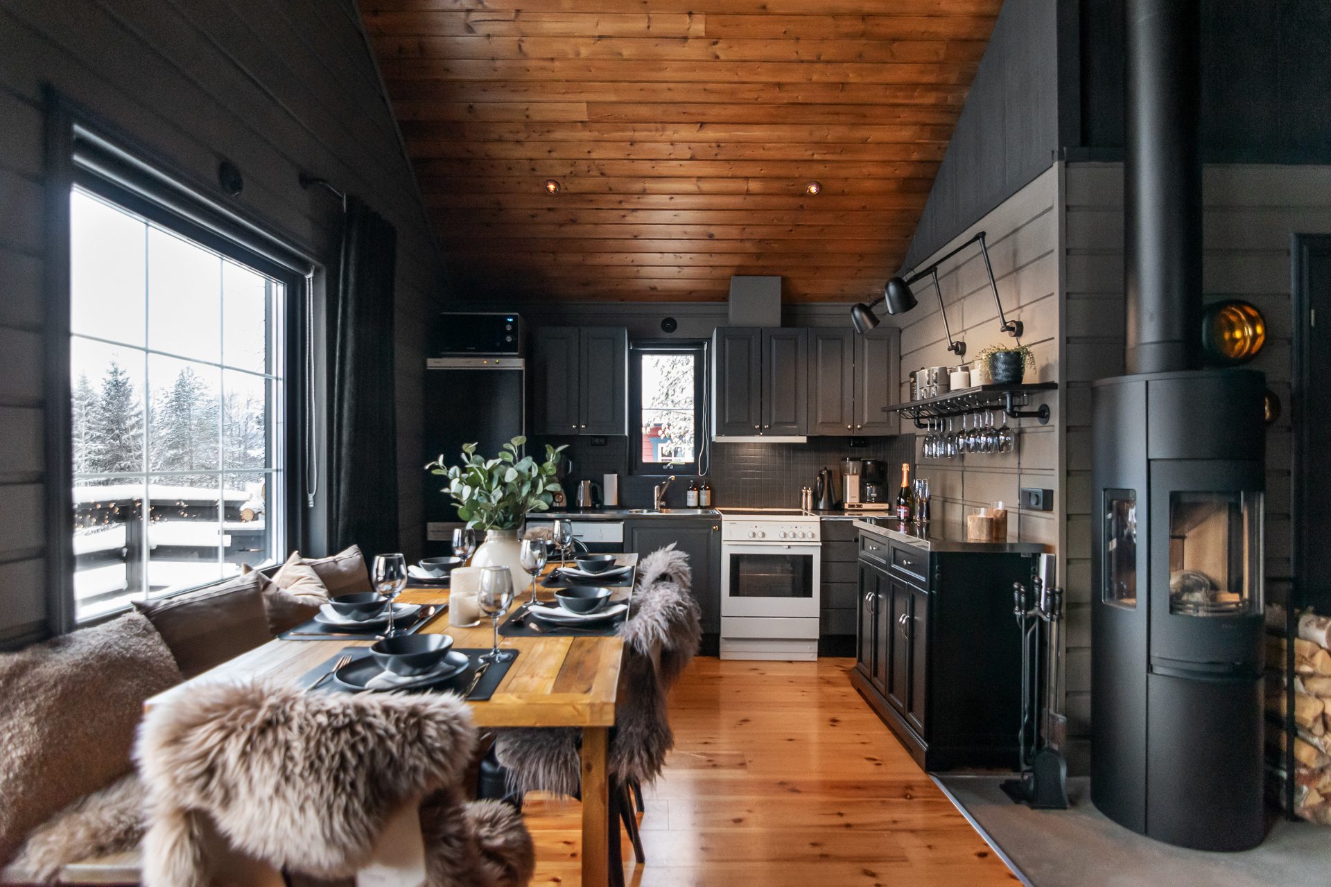 De sociala ytorna förlängs via ett inglasat uterum på baksidan av huvudstugan samt en stor terrass i sydläge med goda solförhållanden och fri utsikt mot backarna.