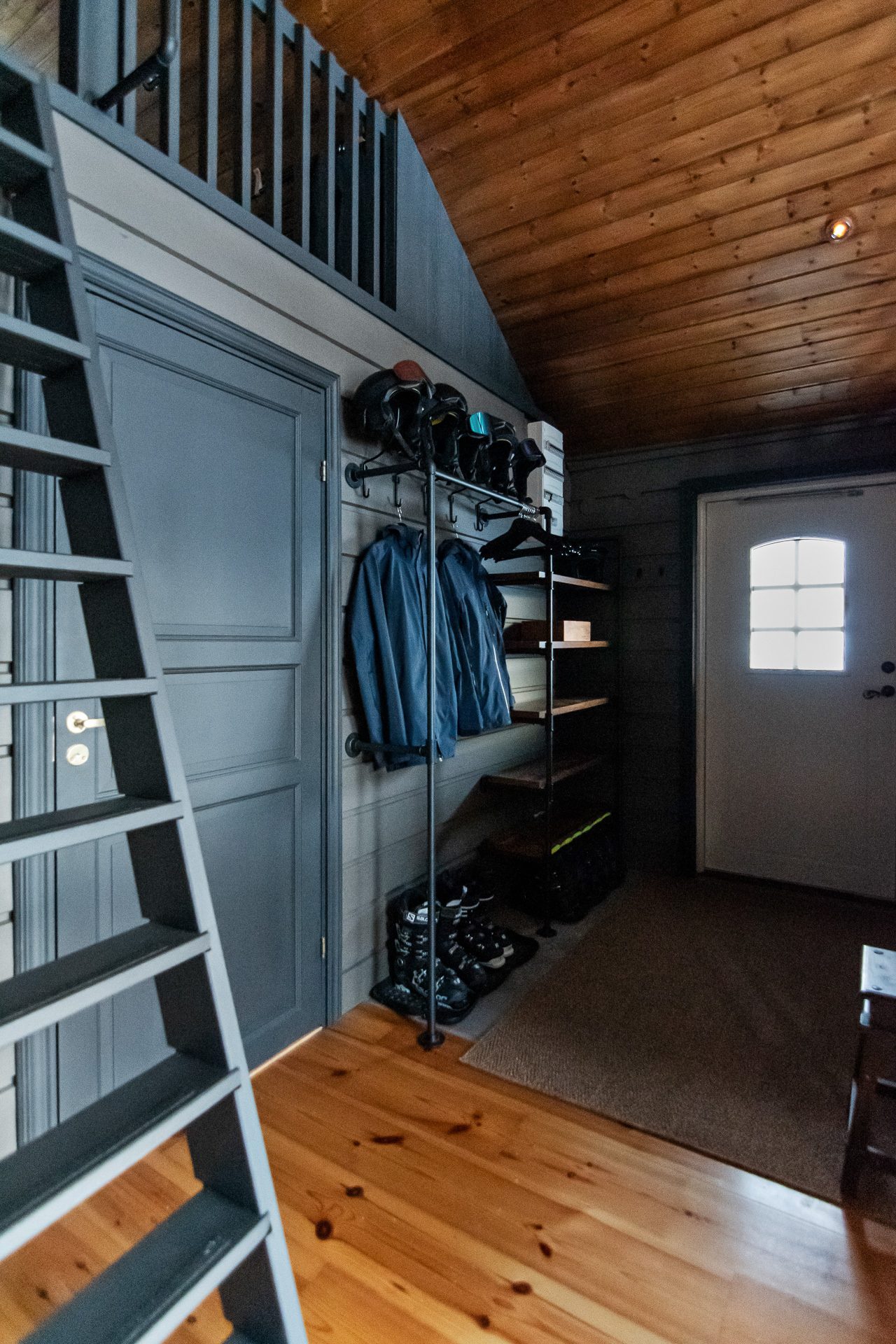 Hall med plats för klädavhänging samt förvaring i lådor och öppna hyllor. Betong på golvet samt väggar och tak är klätt i panel.