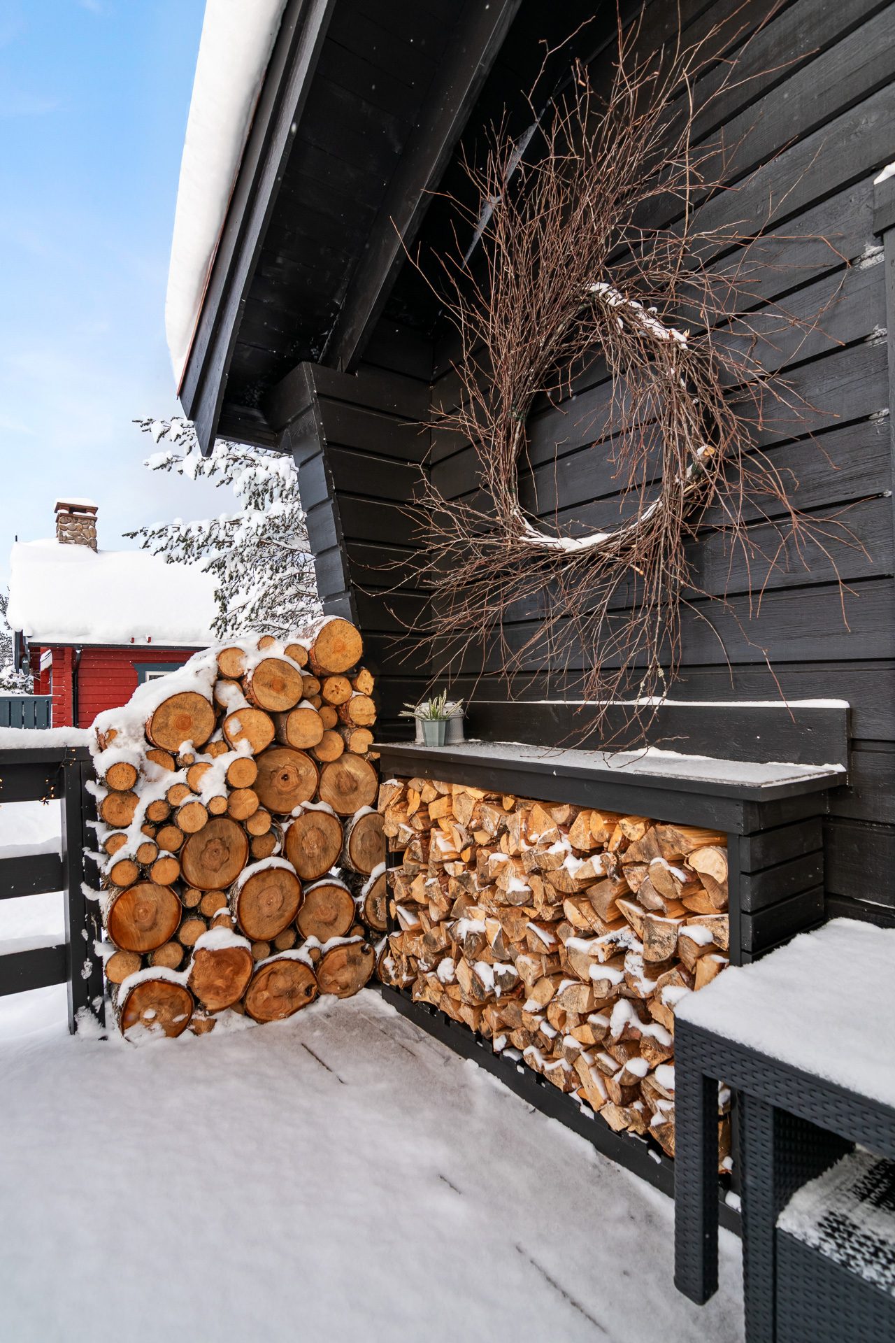 Fristående vedförråd med taksten