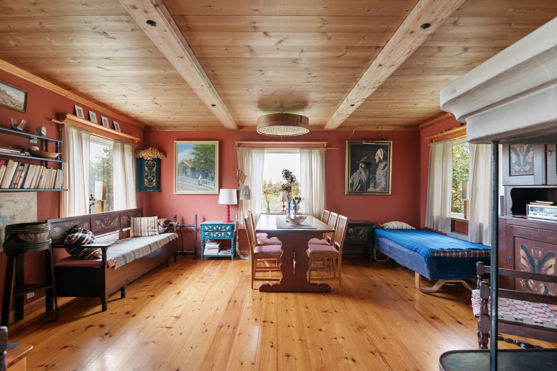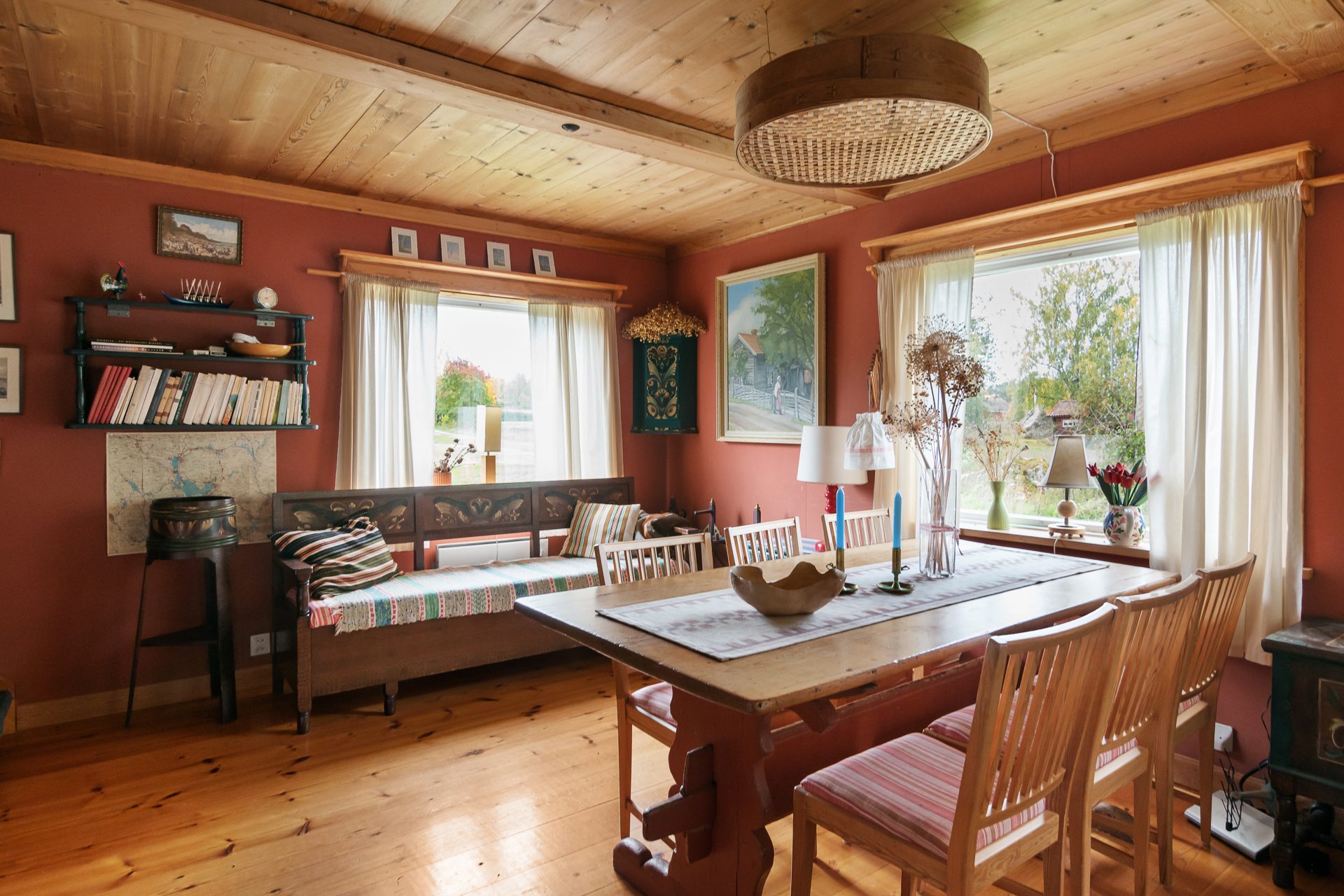 Här visas ett fint timmerhus med naturskönt och lugnt läge. Huset har en härlig karaktär såväl invändigt som utvändigt. Det utvändiga timret tillsammans med tegeltaket och det rödfärgade väggarna skapar en välkomnande känsla. Väl inne i huset möts man av en rejäl öppen spis, grova plankgolv, handsmidda spikar i takpanelen och en inredning som väl följer med tiden. Tomten är lättskött och ligger trevligt med närhet ner till Siljan.