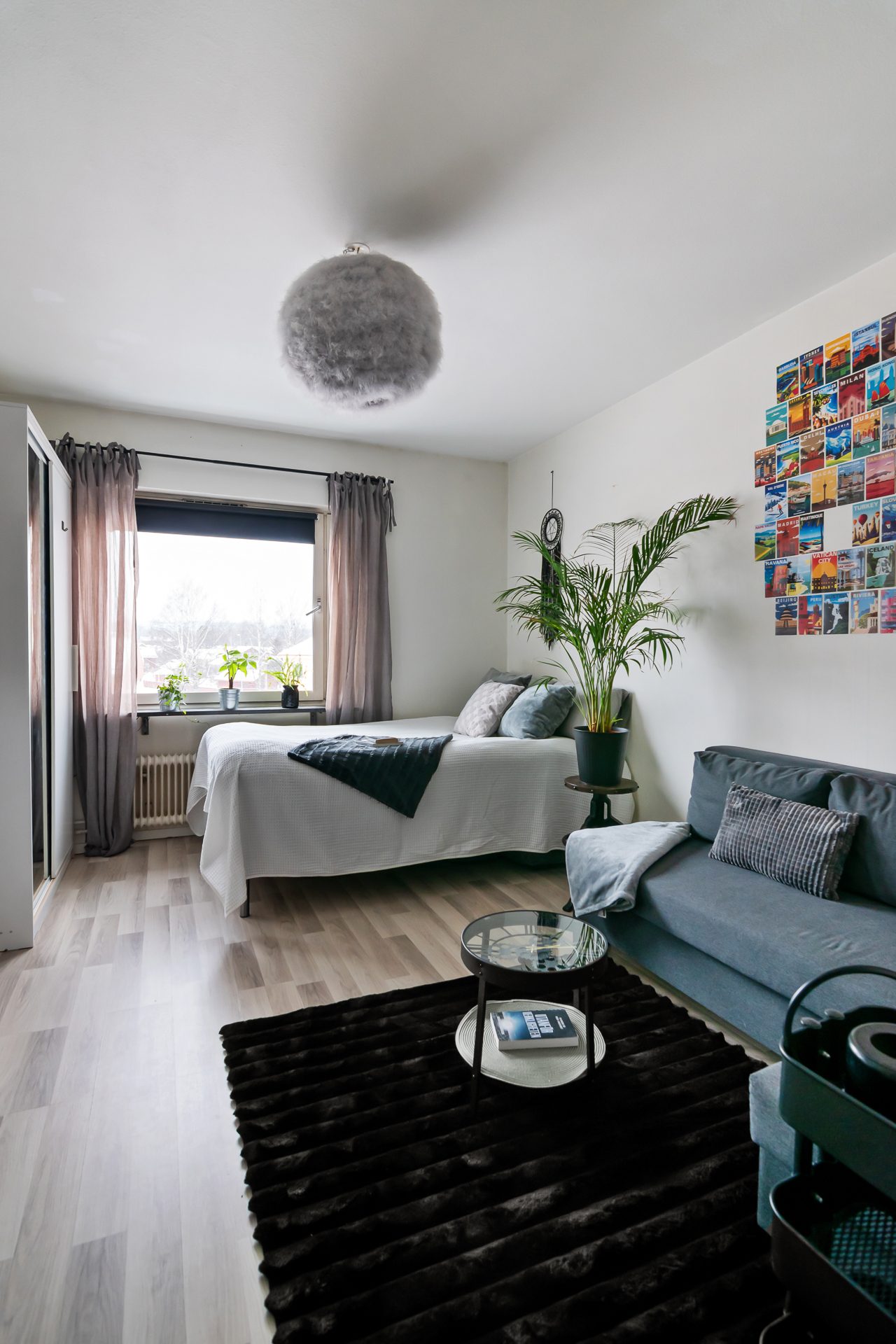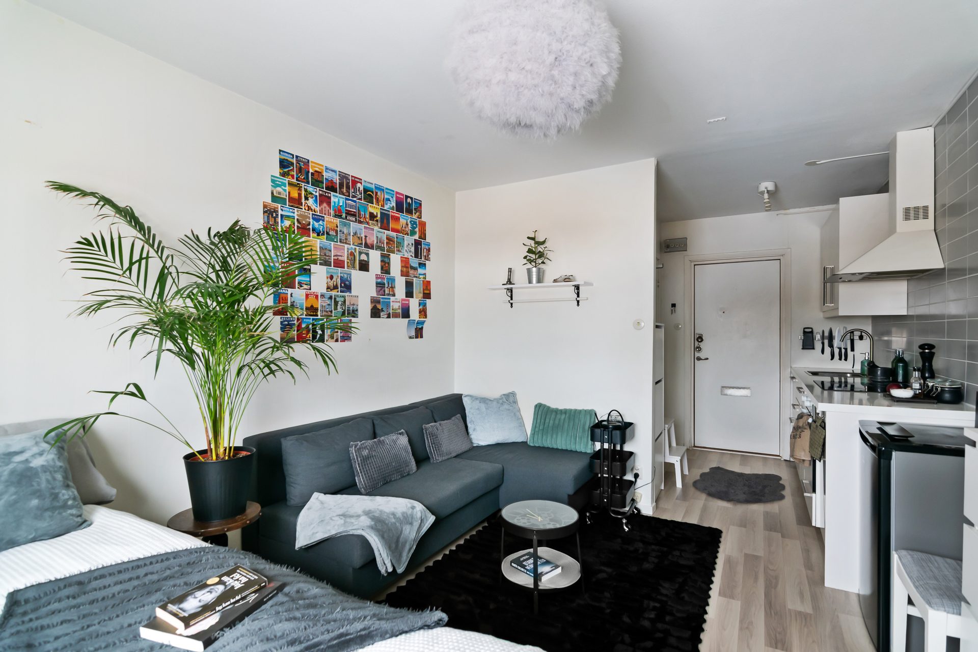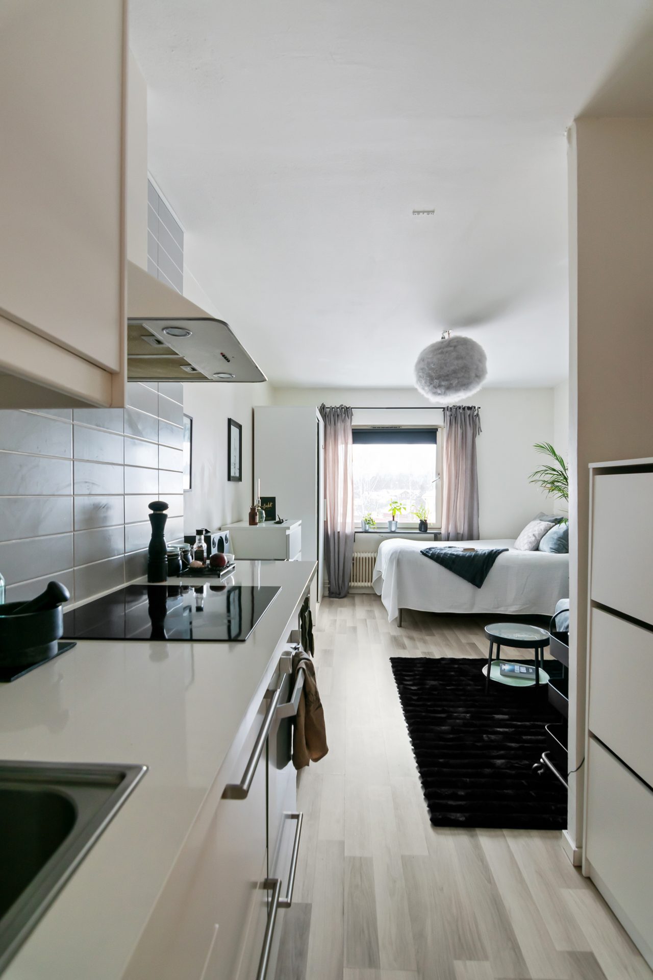 Lägenheten är optimalt planerad med fokus på funktion och rymd. Varje kvadratmeter är väl utnyttjad och skapar en luftig och hemtrevlig känsla. De ljusa färgsättningarna tillsammans med fina ytskikt ger ett modernt och enhetligt intryck. Här möts du av ett lättmöblerat allrum med plats för både säng, soffa och matplats – en flexibel yta som enkelt kan anpassas efter behov.