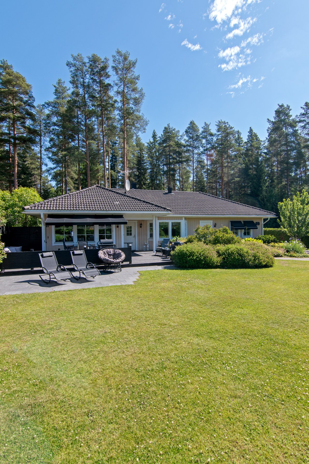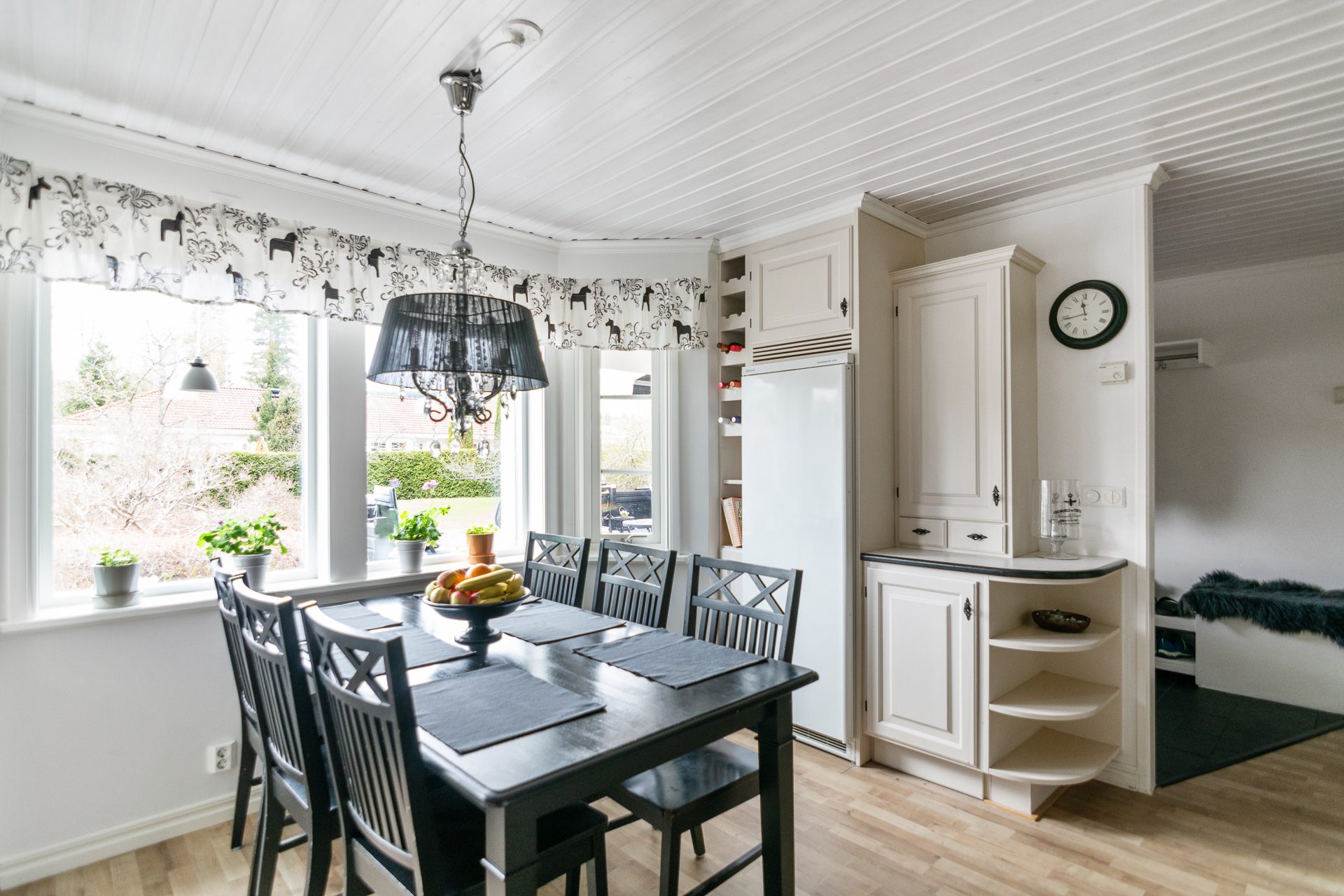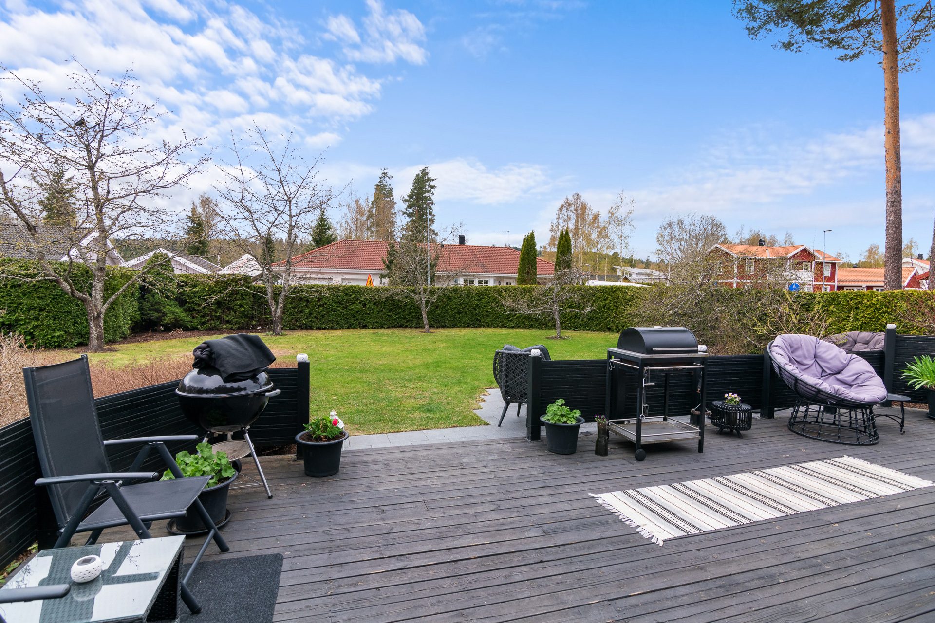 Här visas en trevlig enplans villa med attraktivt läge i uppväxta villakvarter. Här får du stora sällskapsdelar, genomgående fina ytskikt, generösa fönsterpartier med mycket ljusinsläpp, insynsskyddad trädgårdstomt som gränsar mot allmänning och ett separat garage. Huset har ett stort kök med matplats och öppen planlösning mot allrummet med burspråk. Vidare finns ett separat vardagsrum med fönsterpartier mot gården samt 4 sovrum varav ett av sovrummen med egen ingång och kan med fördel användas som hemmakontor. Två badrum varav ett med bastu samt separat tvättstuga. Stor altan på entrésidan som förlänger vardagsrummet inifrån och ut. Fin trädgårdstomt med plattsatta gångar, rabatter, fruktträd, flertal bärbuskar och en inramande häck med insynsskydd mot den lugna återvändsgatan.