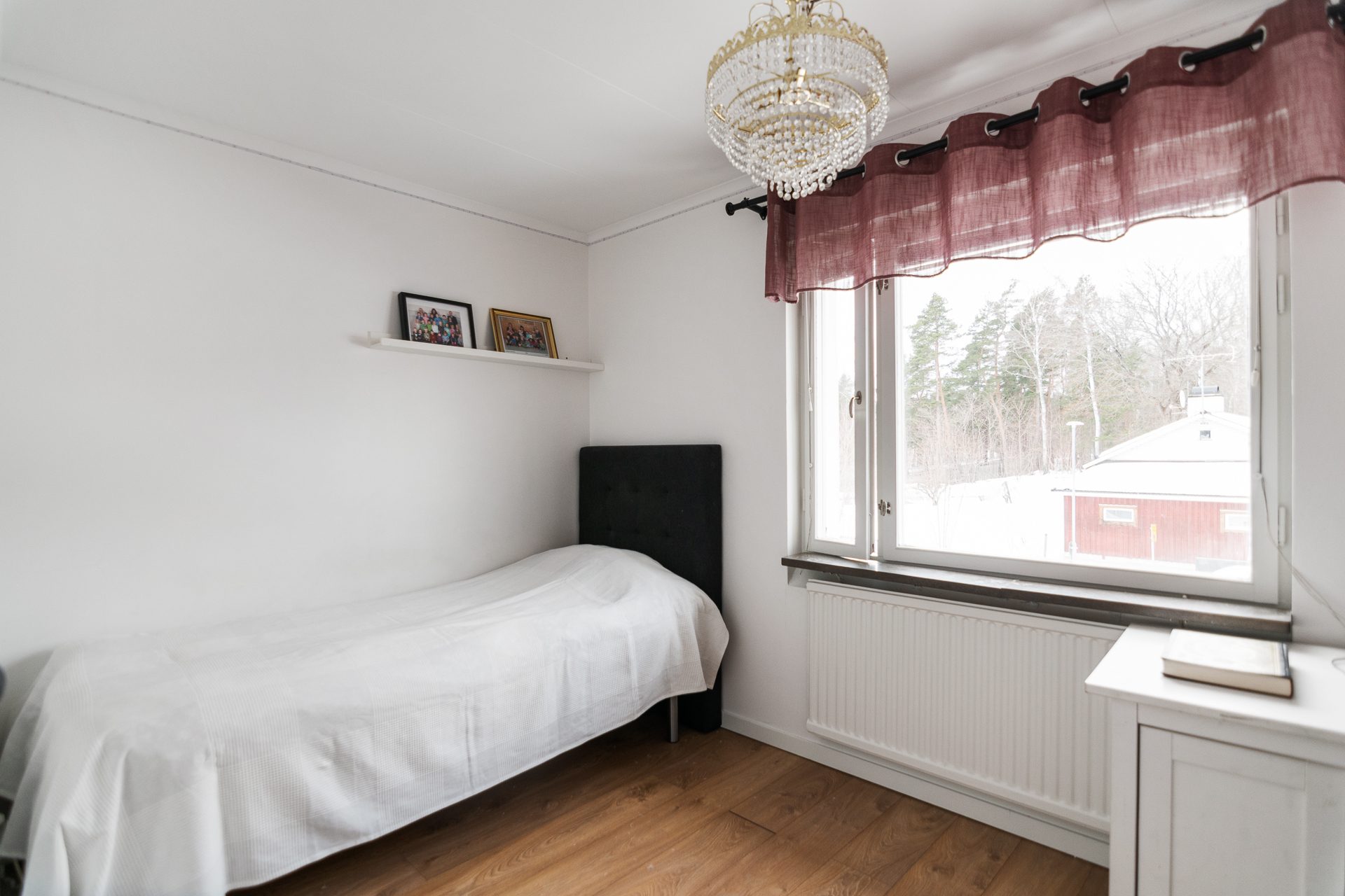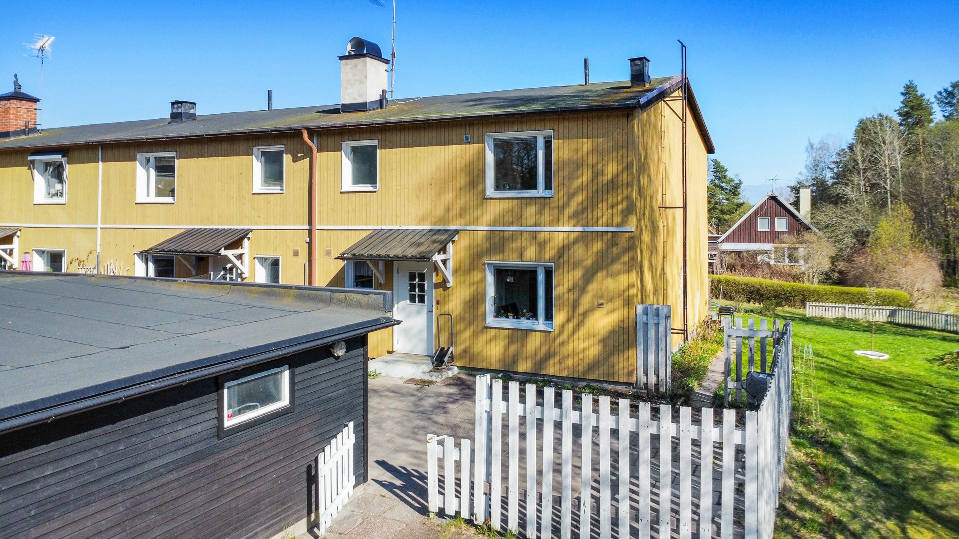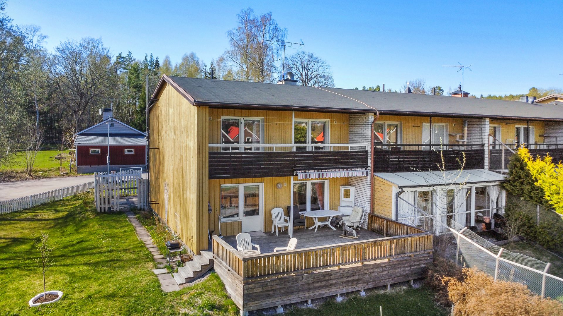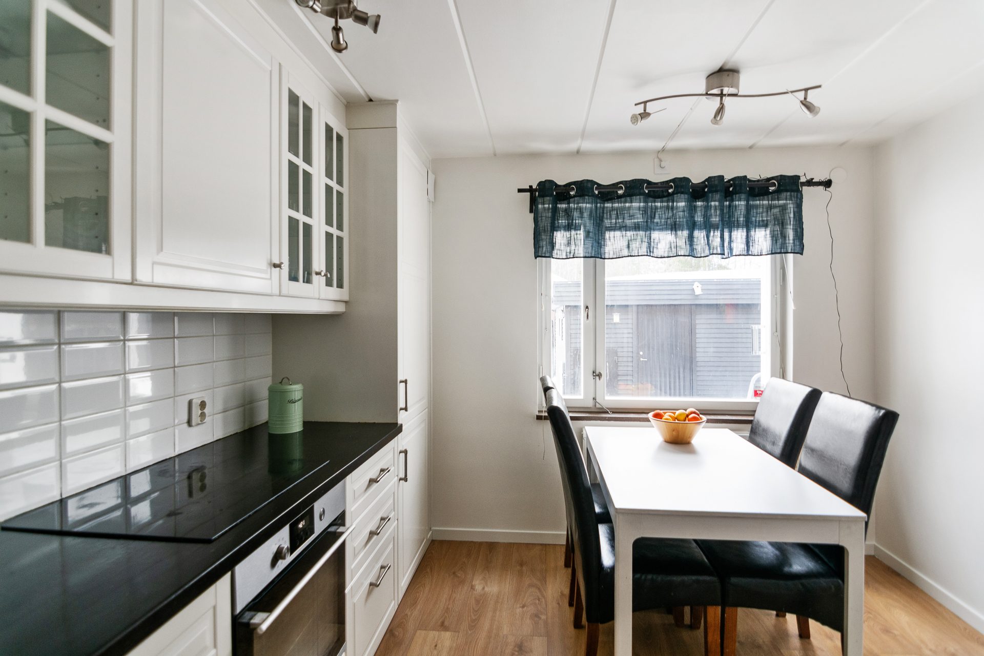 - Allmän beskrivning: Välkomnande hall med plats för avhängning. I hallen finns en wc samt tvättstuga. Hallen öppnar upp mot köket och vardagsrummet. Köket är renoverat och fullt utrustat med spishäll, ugn, kyl, frys samt diskmaskin. Köket har matplats för 6-8 personer och fönster mot entrésidan. Vardagsrummet är generöst med plats för både soffgrupp och matplats. Från vardagsrummet är det vidare utgång till den stora altanen mot trädgårdssidan. Trappan från hallen leder upp till övervåningen. Här finns tre sovrum som samtliga håller bra storlek. Två av sovrummen har platsbyggda garderober och utgång till den takade balkongen mot trädgårdssidan. Vidare finns ett badrum som är renoverat med kakel och klinker. Badrummet är utrustat med wc, tvättställ och dusch.