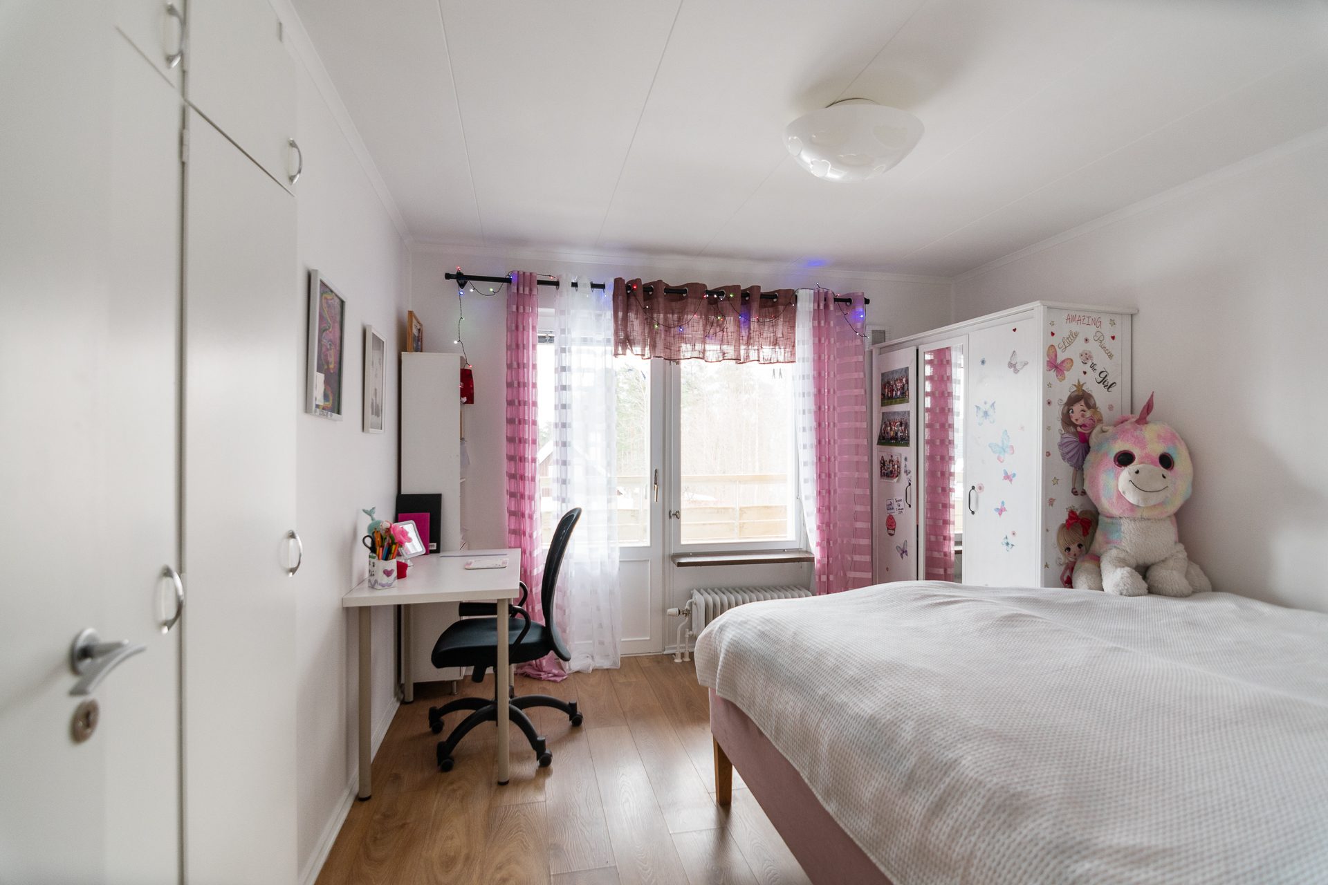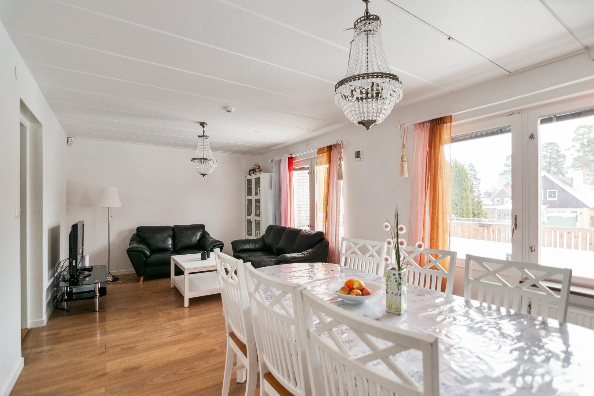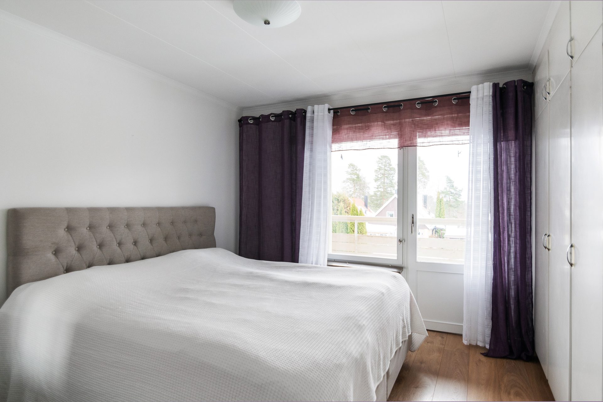 - Allmän beskrivning: Välkomnande hall med plats för avhängning. I hallen finns en wc samt tvättstuga. Hallen öppnar upp mot köket och vardagsrummet. Köket är renoverat och fullt utrustat med spishäll, ugn, kyl, frys samt diskmaskin. Köket har matplats för 6-8 personer och fönster mot entrésidan. Vardagsrummet är generöst med plats för både soffgrupp och matplats. Från vardagsrummet är det vidare utgång till den stora altanen mot trädgårdssidan. Trappan från hallen leder upp till övervåningen. Här finns tre sovrum som samtliga håller bra storlek. Två av sovrummen har platsbyggda garderober och utgång till den takade balkongen mot trädgårdssidan. Vidare finns ett badrum som är renoverat med kakel och klinker. Badrummet är utrustat med wc, tvättställ och dusch.