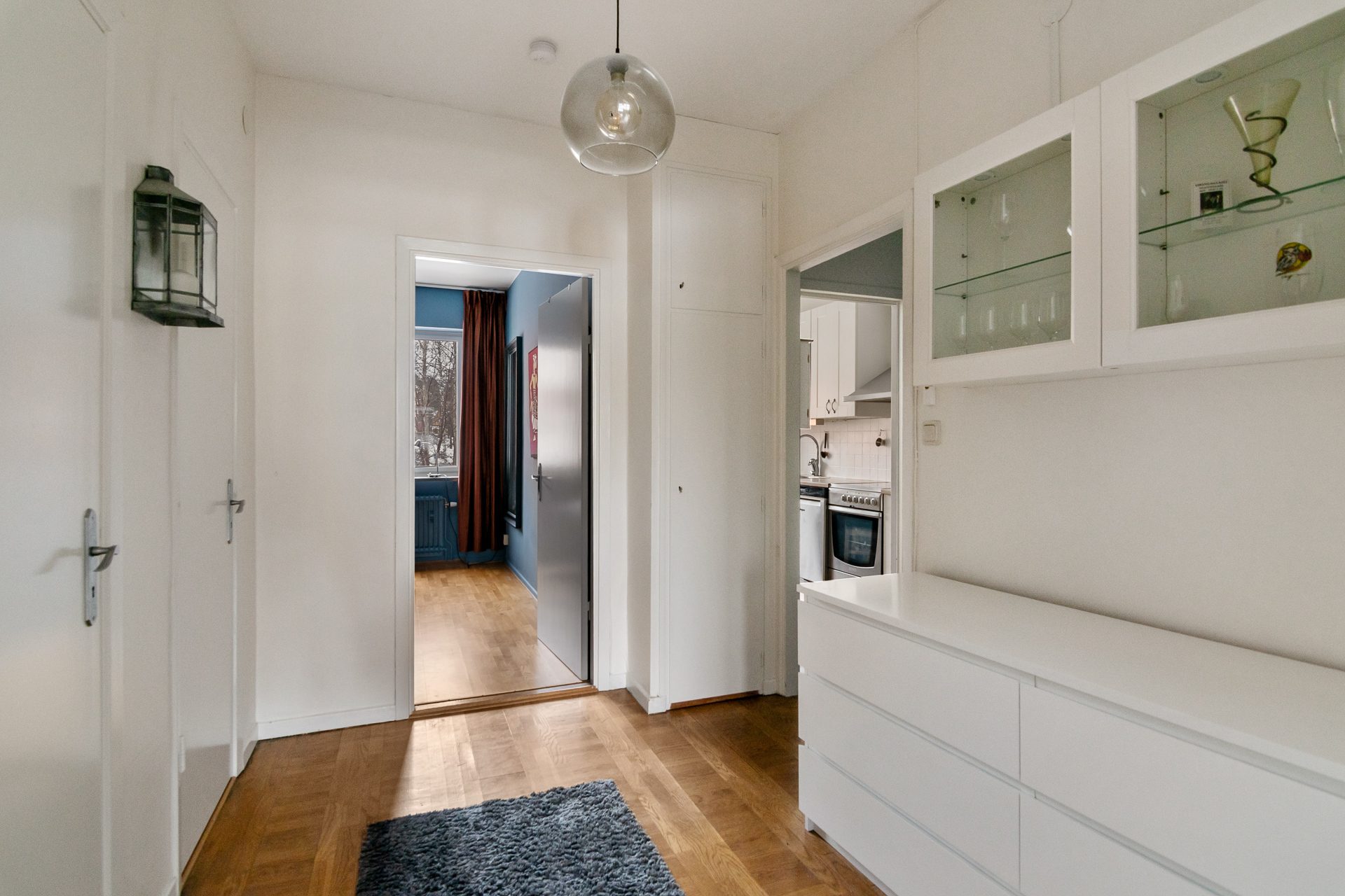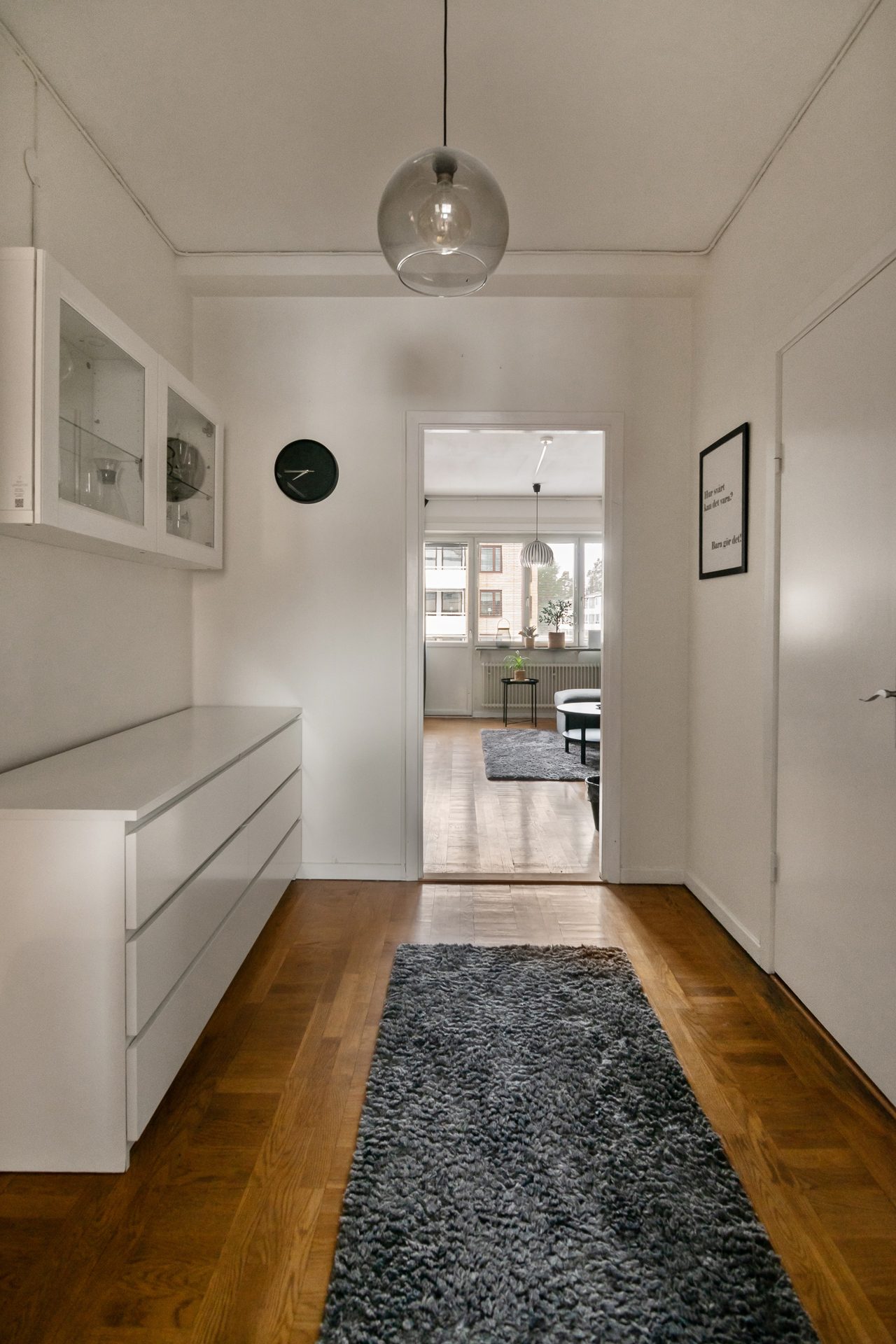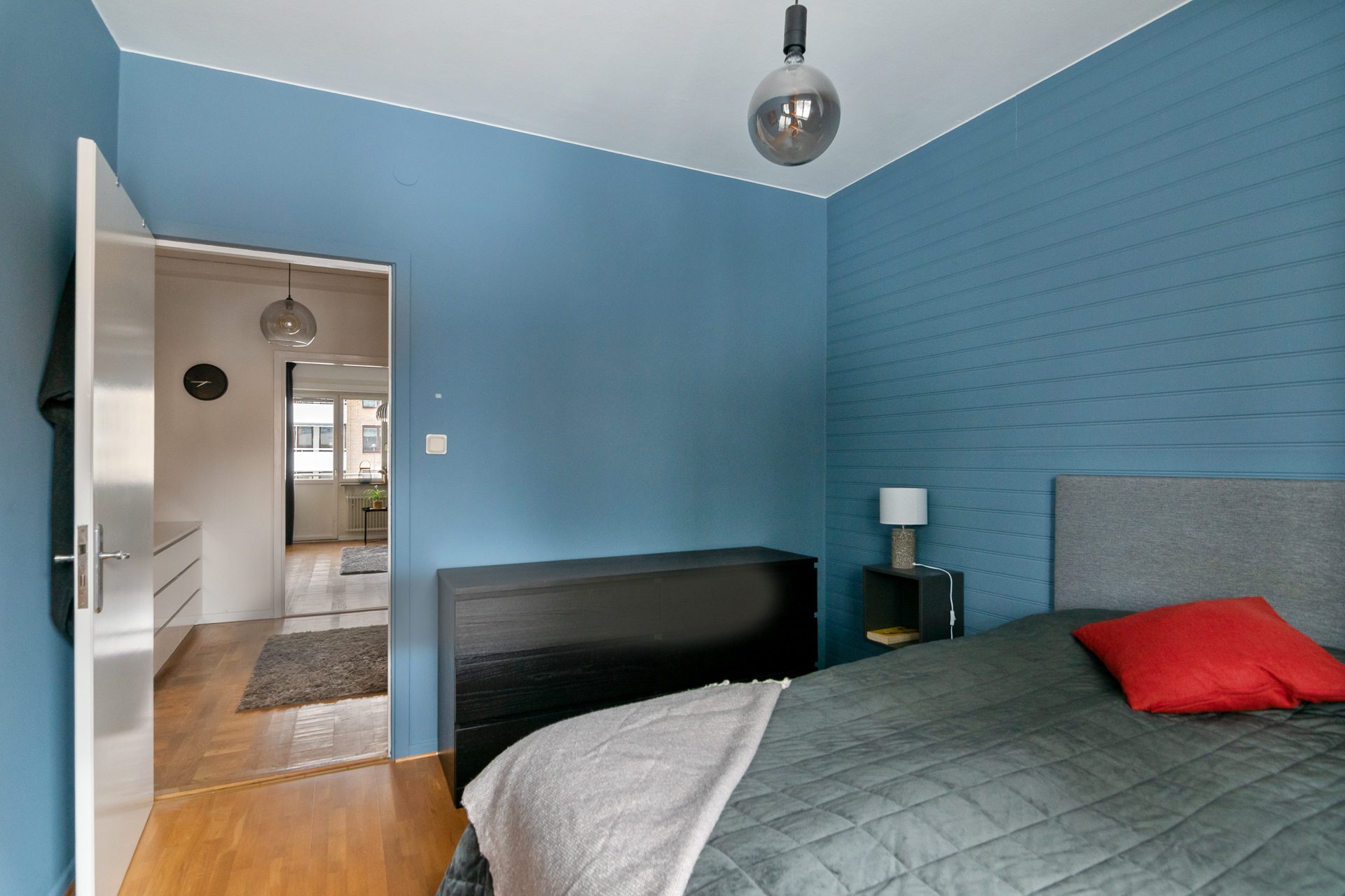 Hallen har även en klädkammare. Till höger finner ni sovrummet som håller bra storlek med plats för dubbelsäng och övrigt möblemang. Sovrummet är inrett på ena sidan med väggpanel samt en dov kulör för en mer lyxig känsla. Till vänster om den inre hallen är vardagsrummet placerat vilket är ljust och rymligt med utgång till balkong. Här finns plats för både soffgrupp och matplats.