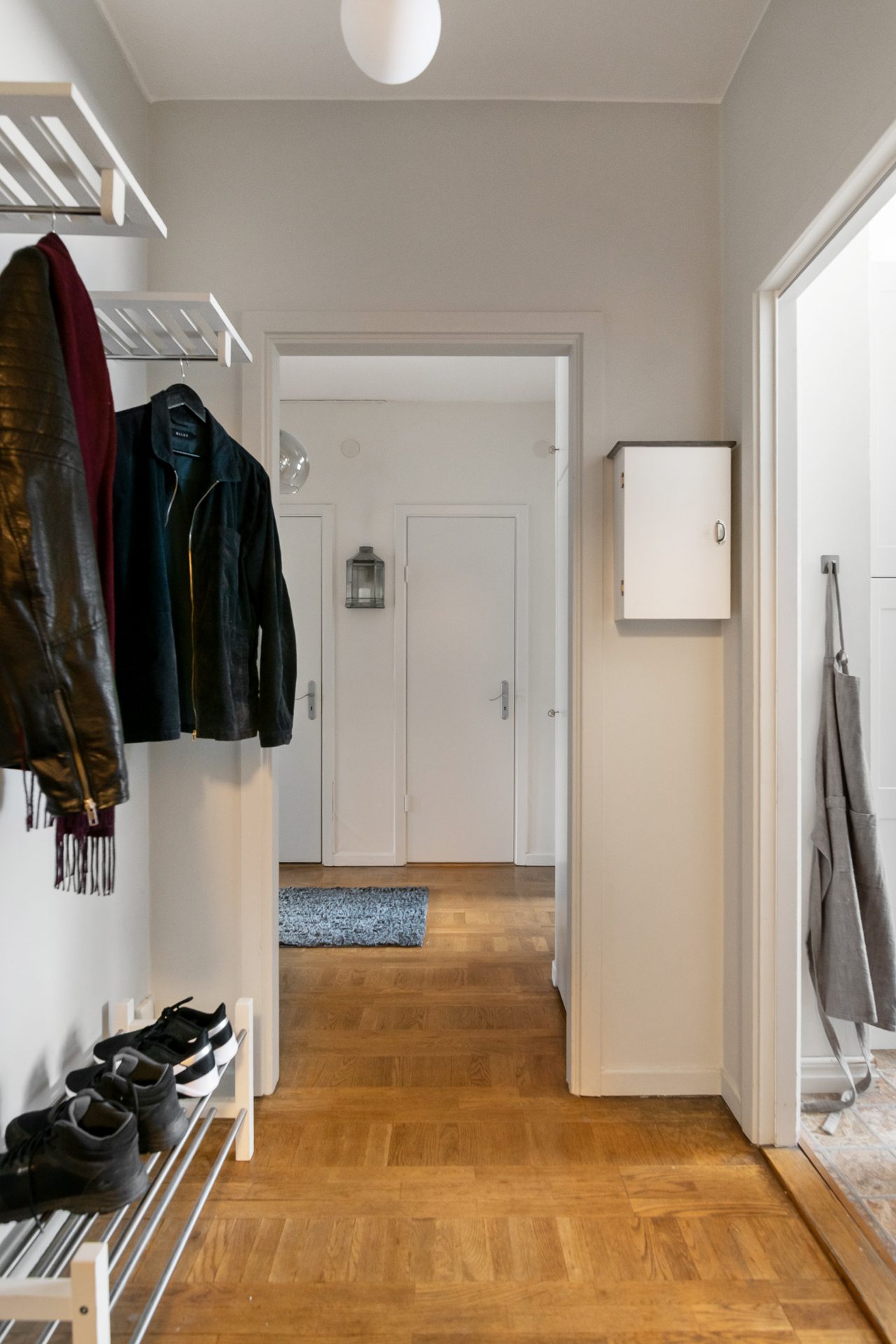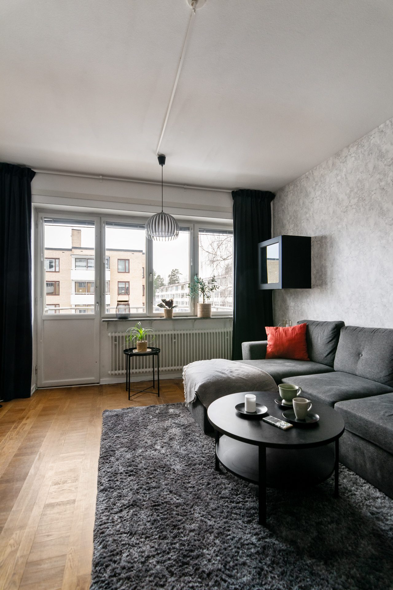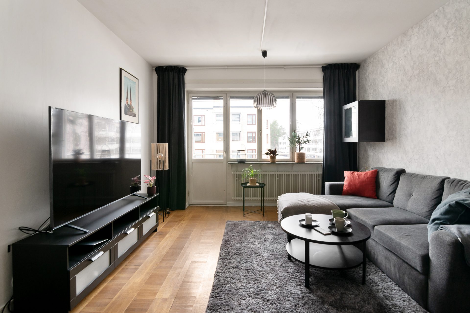 Hallen har även en klädkammare. Till höger finner ni sovrummet som håller bra storlek med plats för dubbelsäng och övrigt möblemang. Sovrummet är inrett på ena sidan med väggpanel samt en dov kulör för en mer lyxig känsla. Till vänster om den inre hallen är vardagsrummet placerat vilket är ljust och rymligt med utgång till balkong. Här finns plats för både soffgrupp och matplats.