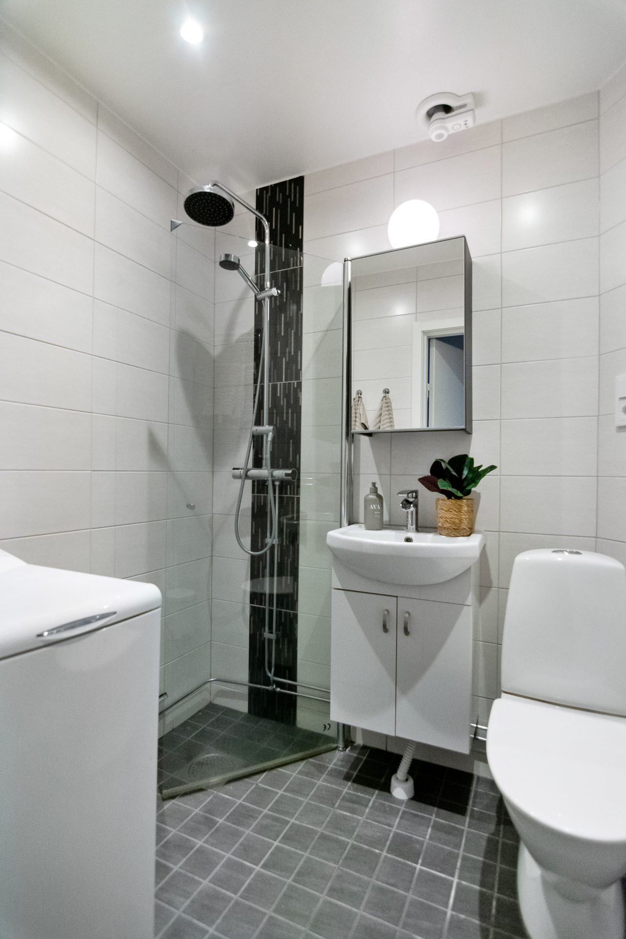 I anslutning till den inre hallen ligger badrummet som är helkaklat med klinkergolv, duschhörna med glasdörr, handfat med kommod, tvättmaskin och handdukstork samt golvvärme.