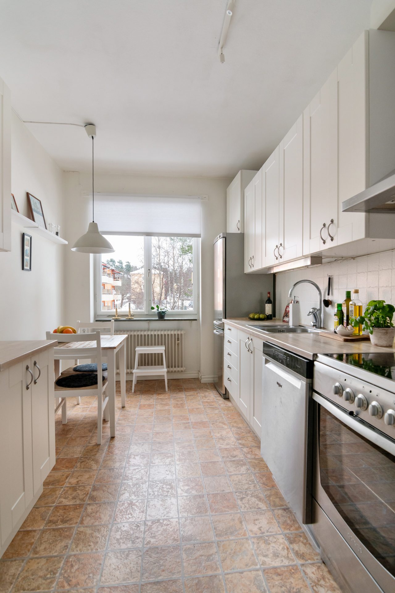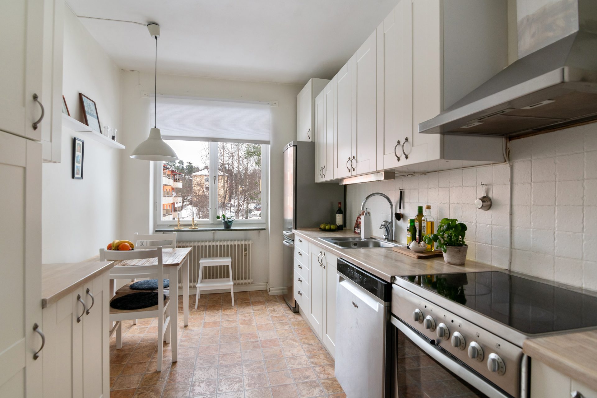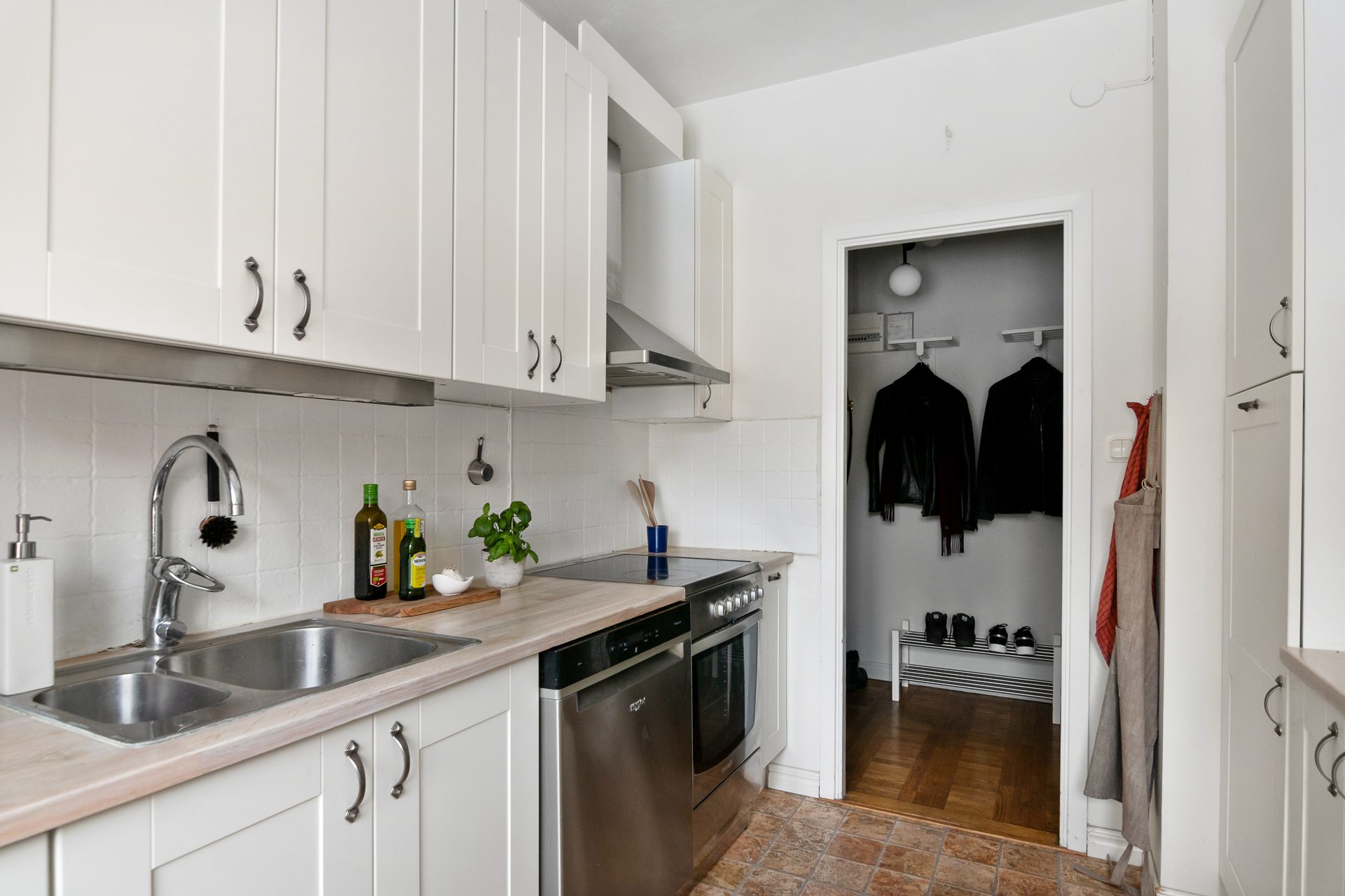 - Allmän beskrivning: Välkomnande hall med avhängningsmöjlighet. Inre möblerbar hall med plats för skrivbord eller läshörna. Direkt till höger om hallen ligger köket med modern inredning med matplats för 4 personer. Vit skåpinredning med profil, ljus bänkskiva i laminat med nedsänkt diskho. Vidare har köket full maskinell utrustning och bra förvaringsmöjligheter.