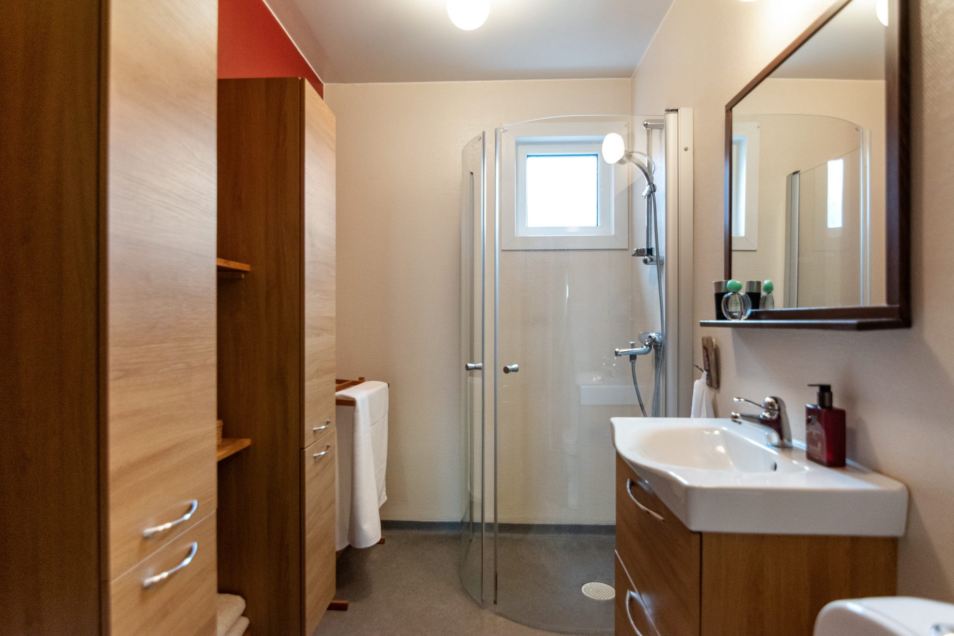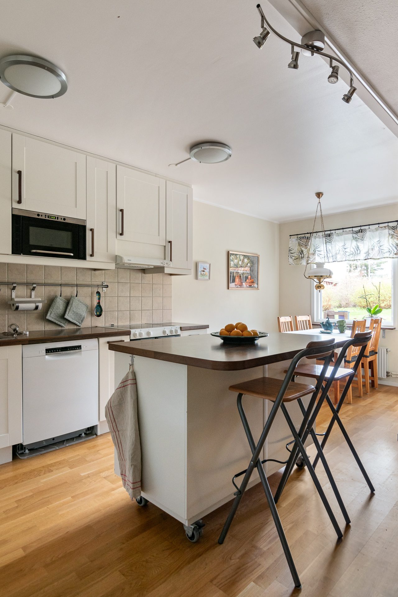 - Allmän beskrivning: Välkomnande hall med avhägningsmöjlighet. I anslutning till hallen ligger köket med matplats för 6-8 personer och fönster mot entrésidan. Vidare är köket utrustat med spis, spisfläkt, kyl, frys, ugn och köks-ö. Entrévåningen har ett sovrum med fönster mot sjösidan och ett stort vardagsrum med utgång till balkongen med sjöutsikt. Badrum i anslutning till hallen med dusch, wc och tvättställ. Sutterängvåning med två sovrum med skyddat läge som båda håller bra storlek. Vidare har sutterängvåningen ett badrum med wc, badkar och dusch. Rymlig klädkammare med ingång från nedre hallen.
