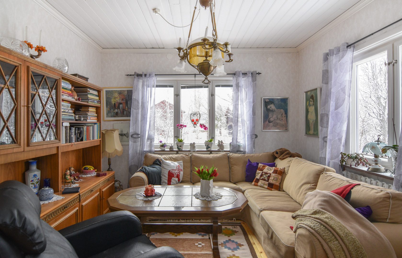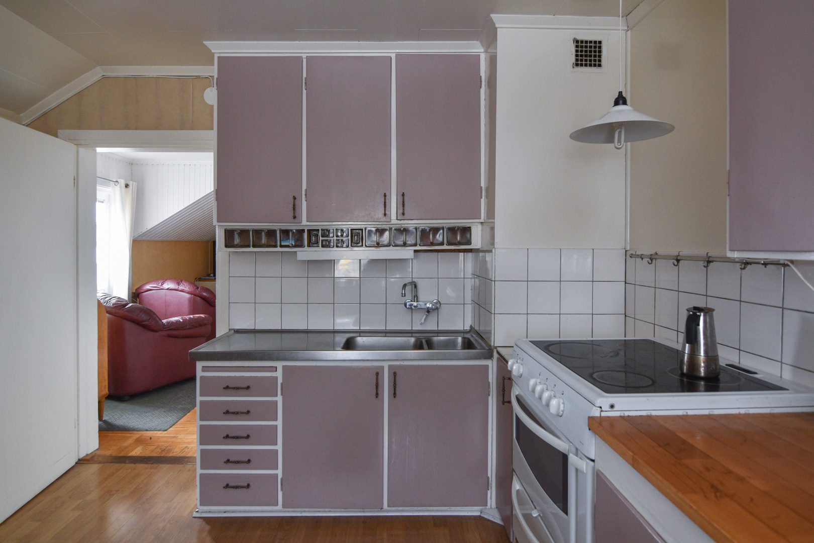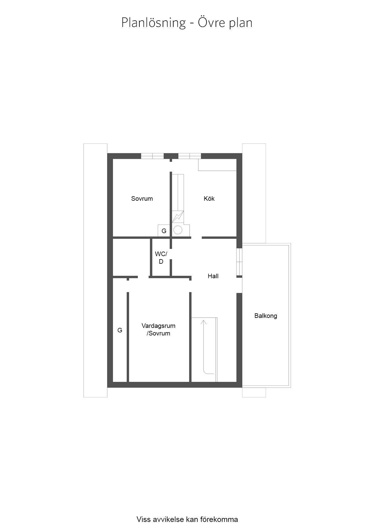 Trappan i hallen leder dig upp till övervåningen. Här kommer du upp till en möblerbar hall med utgång till balkongen mot entrésidan av huset samt ingång till vardagsrummet och köket. Vardagsrummet är stort och lättmöblerat samt har fönster mot gaveln. Kök är rymligt med matplats för 4-6 personer. Sovrum invid köket med plats för en dubbelsäng och mer därtill. Övre plan passar perfekt för generations boende eller för uthyrning med tanke på att det finns ett eget kök.