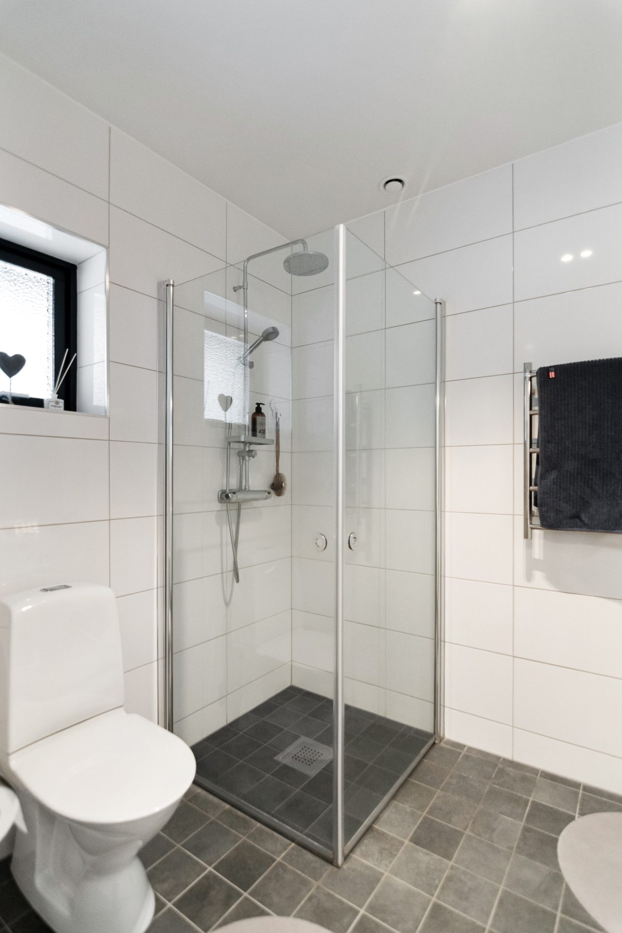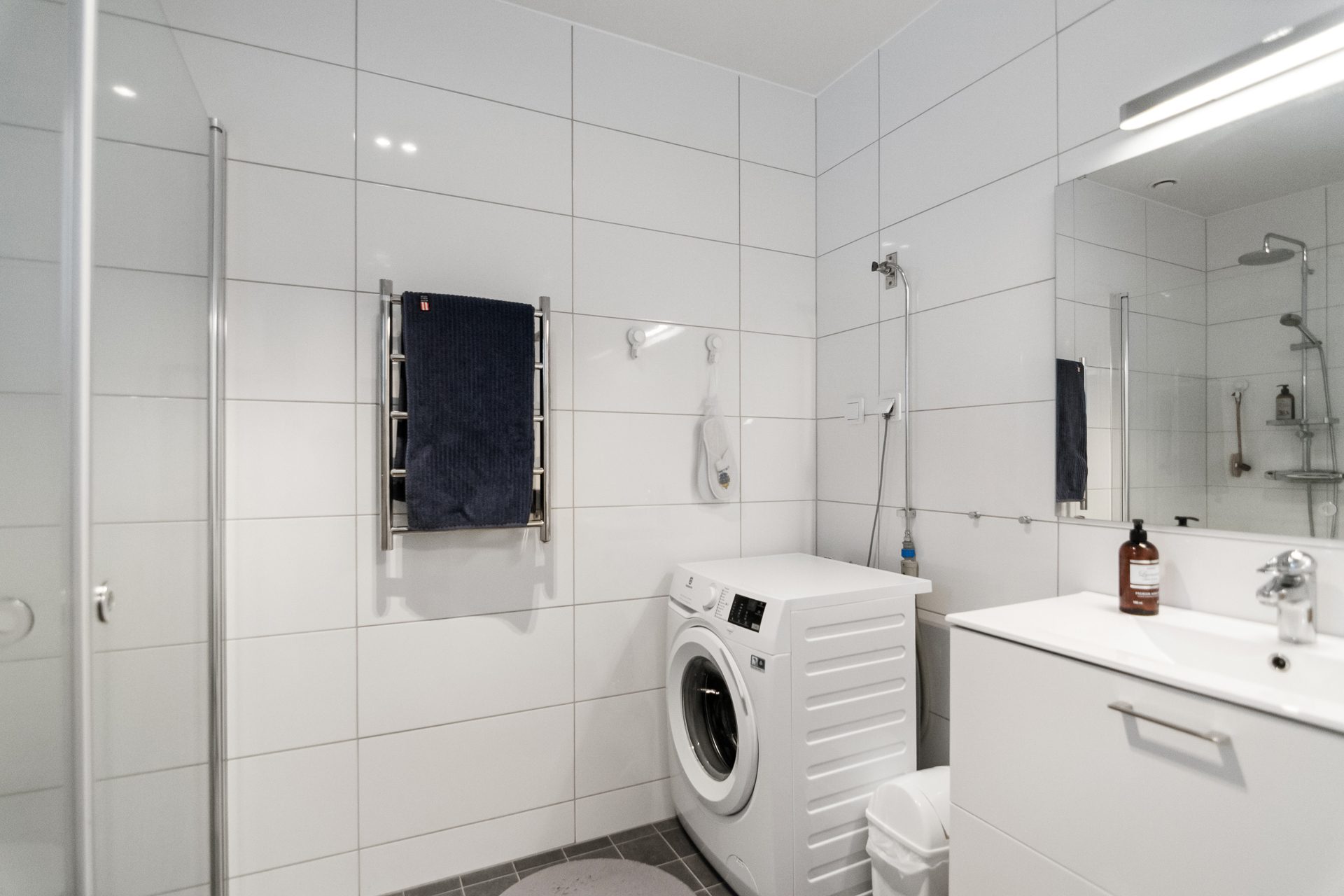 Helkaklat badrum invid hallen inrett med handfat med kommod, spegel, wc, dusch och tvättmaskin.