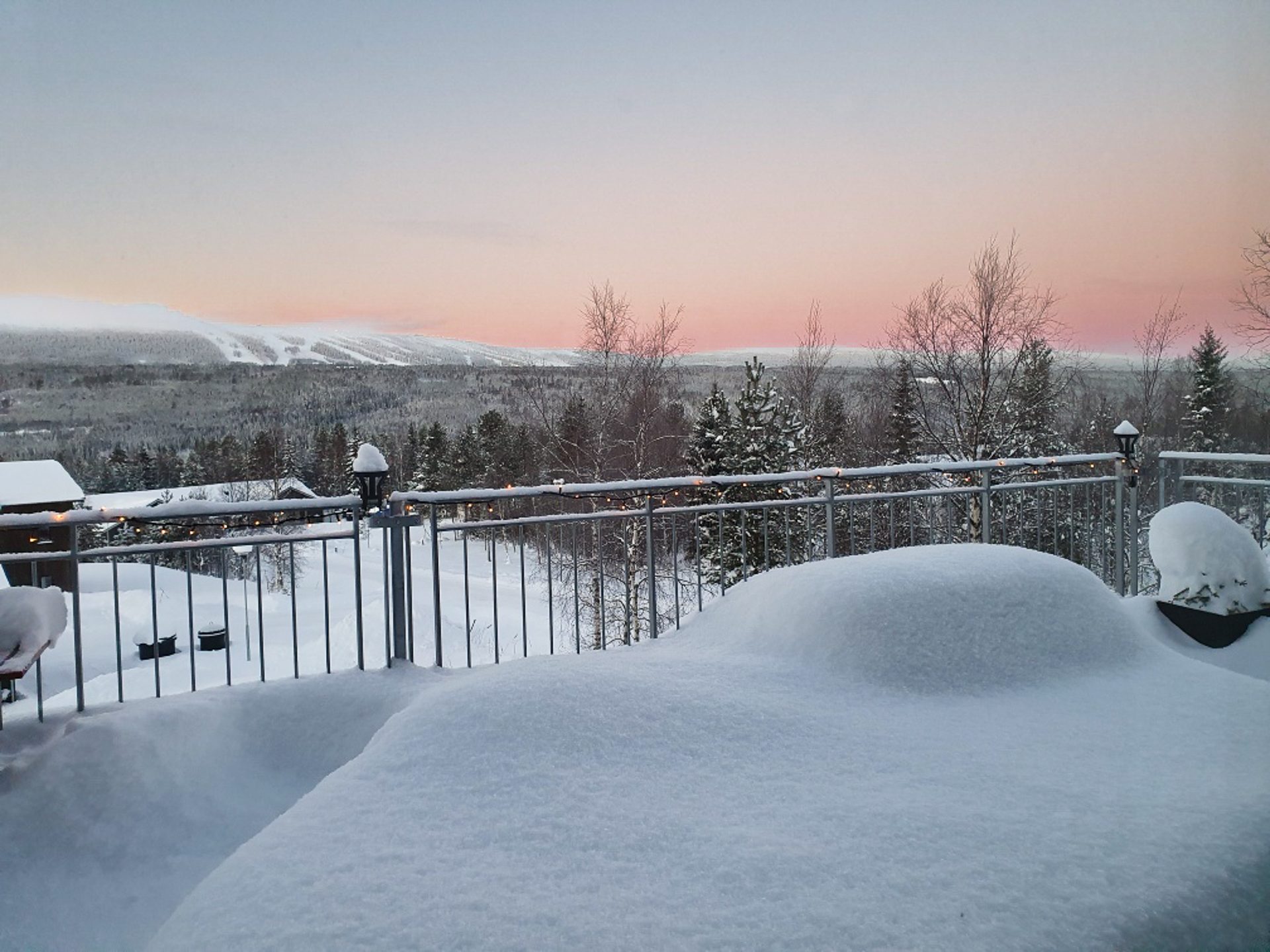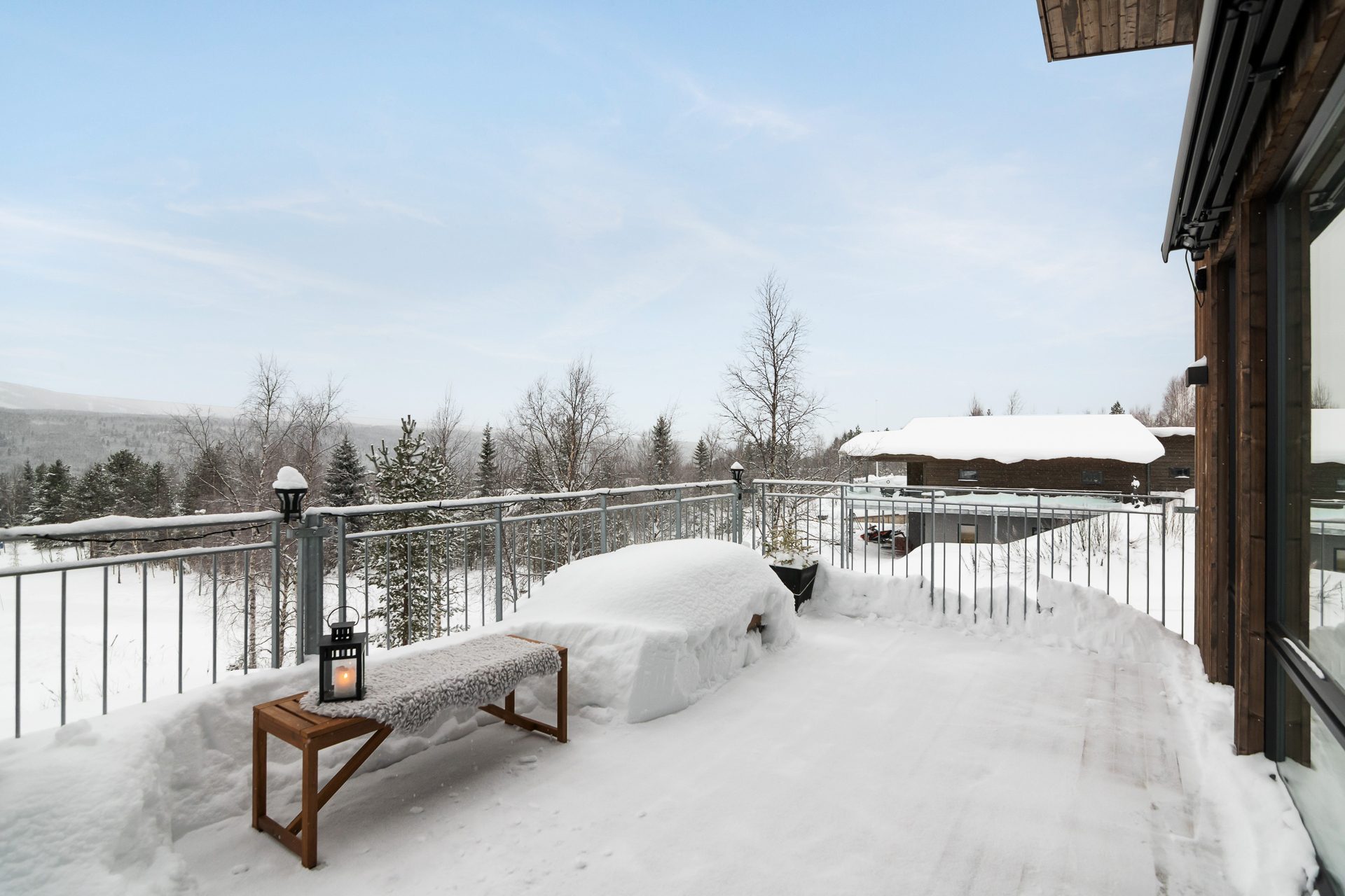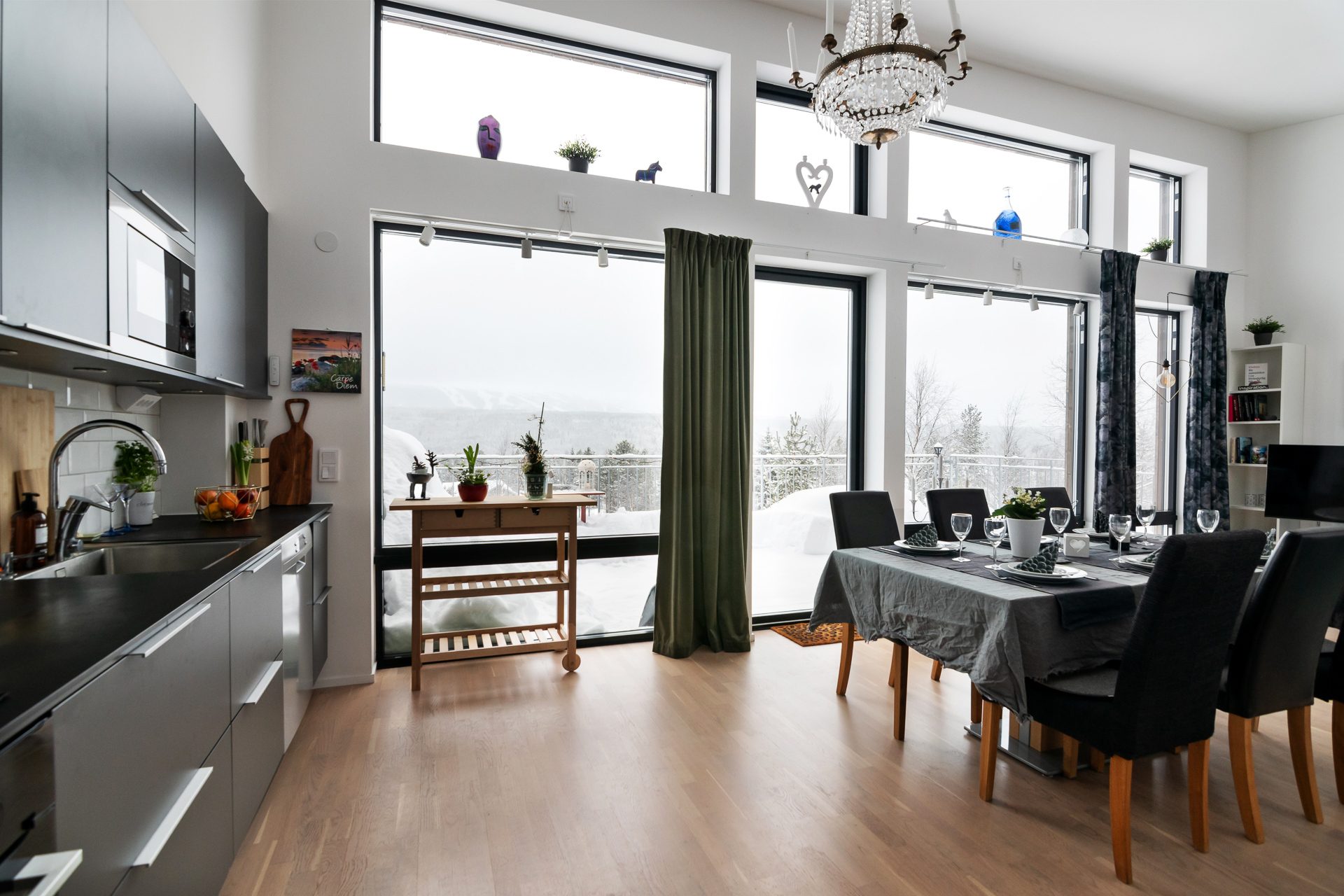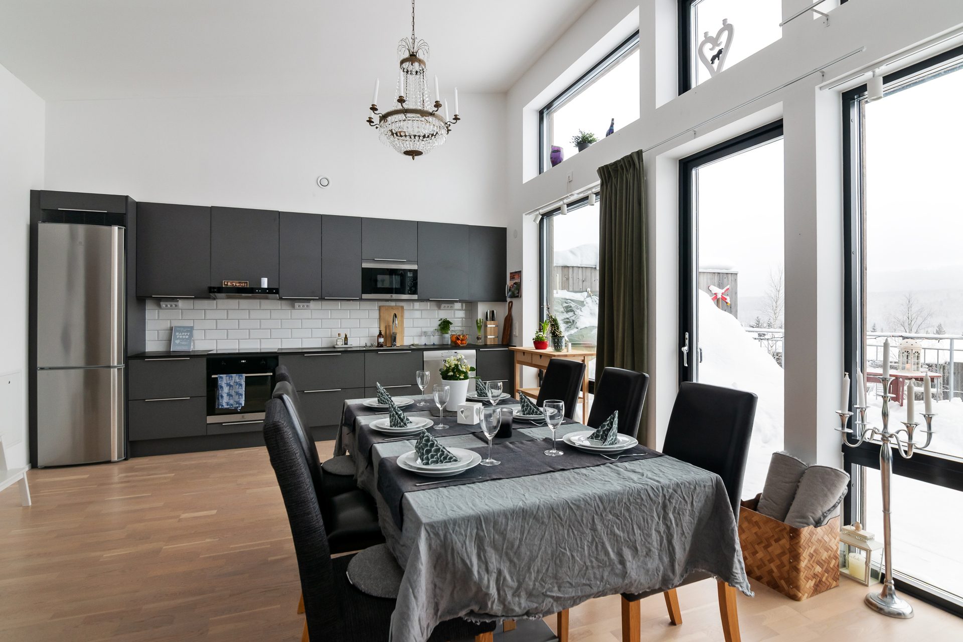 Köksdelen är fullt utrustat med spis, kyl/frys, mikro och diskmaskin vilket gör att du kan laga alla måltider här om så önskas. Allrummet erbjuder även utgång till en stor altan med trädäck och en fantastisk vy mot backarna.