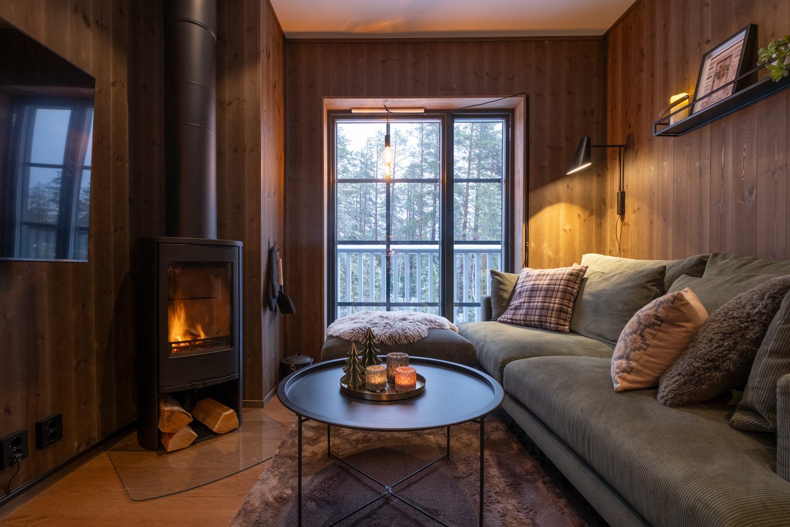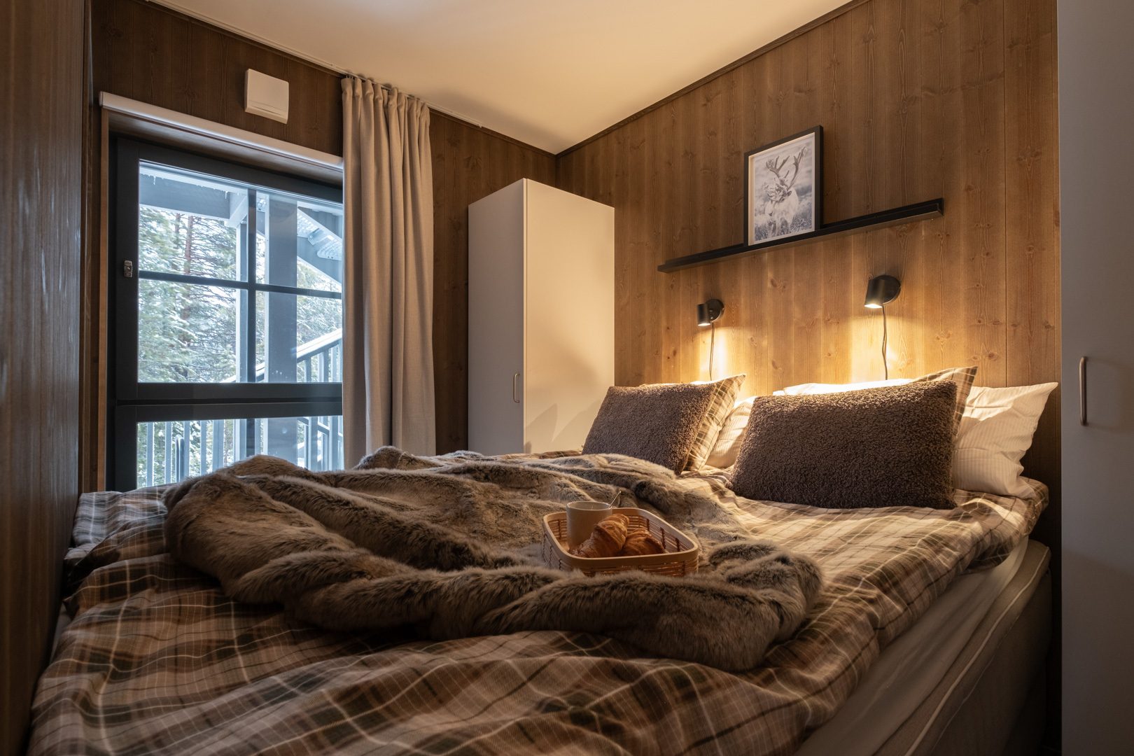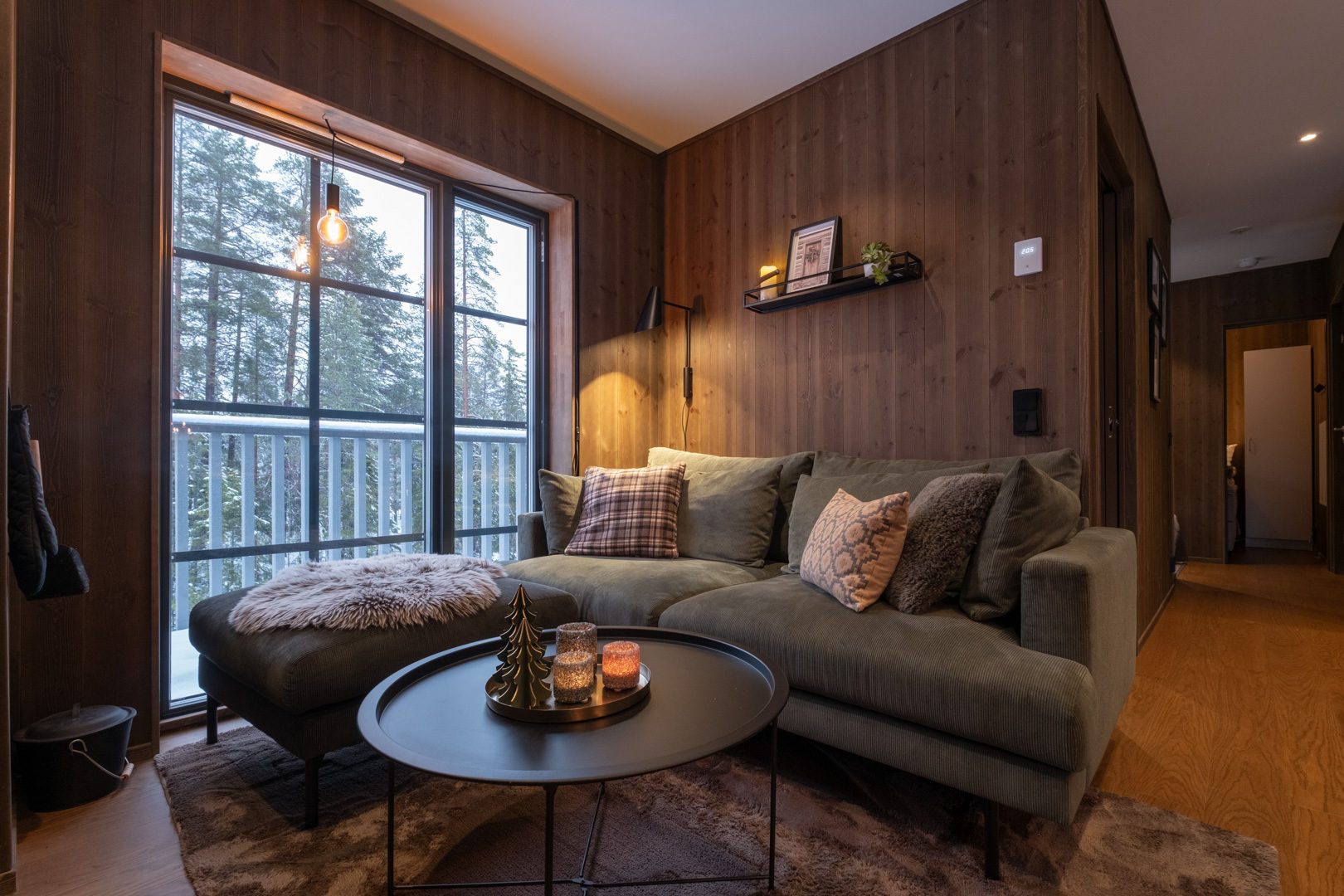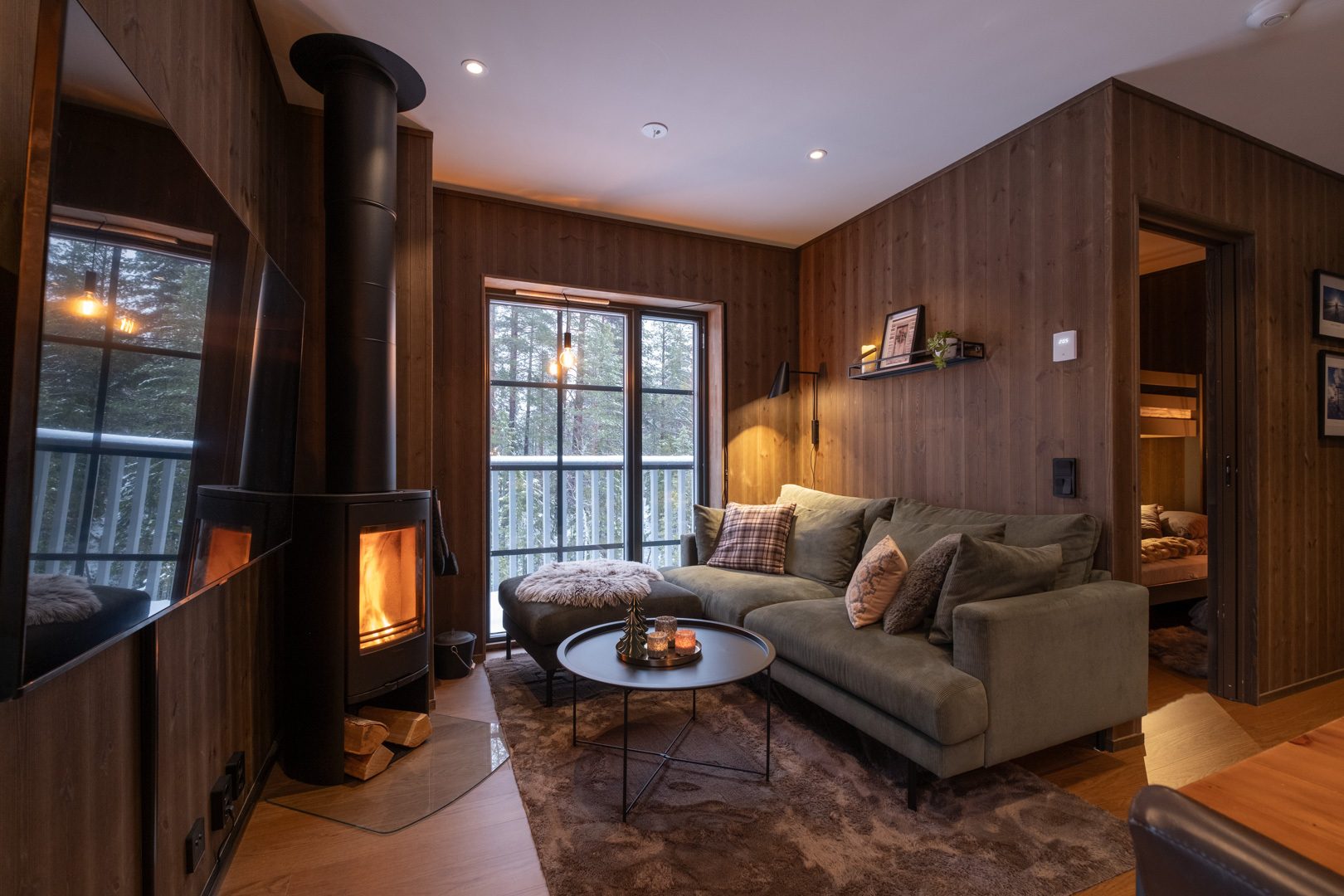 Vardagsrumsdelen är mysig med braskamin samt plats för soffa och mer därtill. Här spenderar man gärna lite extra tid efter en lång dag i backen. Mittemot köksdelen hittar du lägenhetens andra sovrum. Detta sovrum är inrett med våningssäng med enkelbädd i överslafen och en större 120 cm bred säng nere.