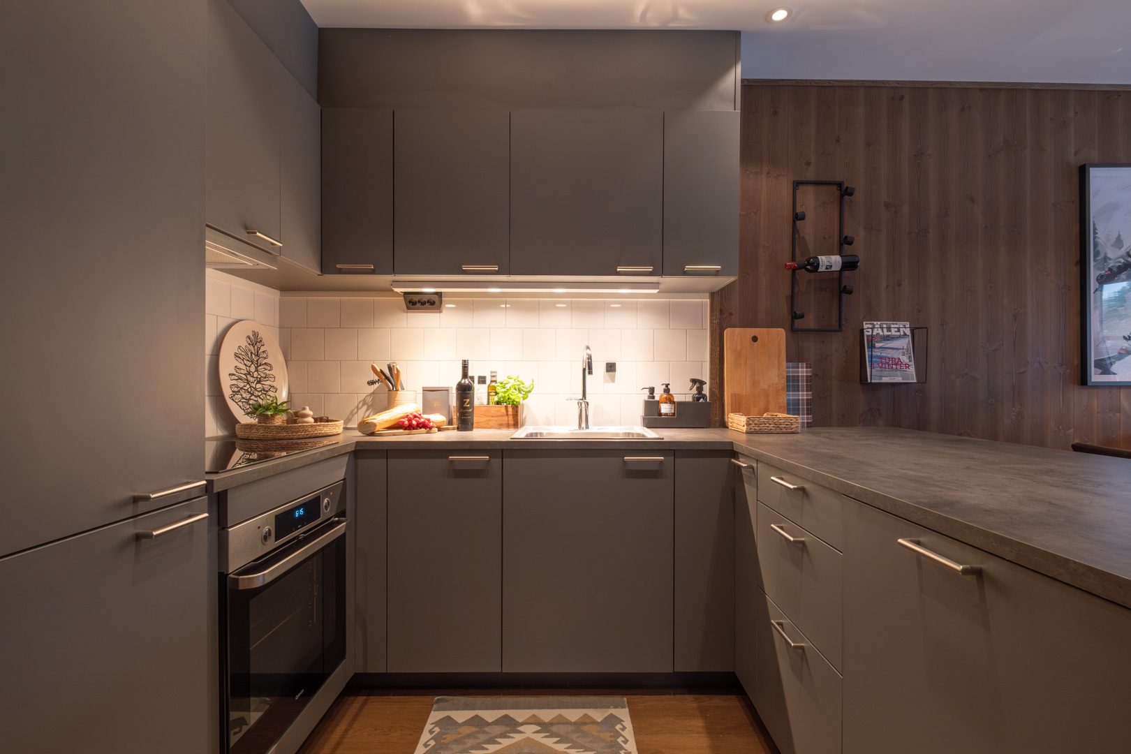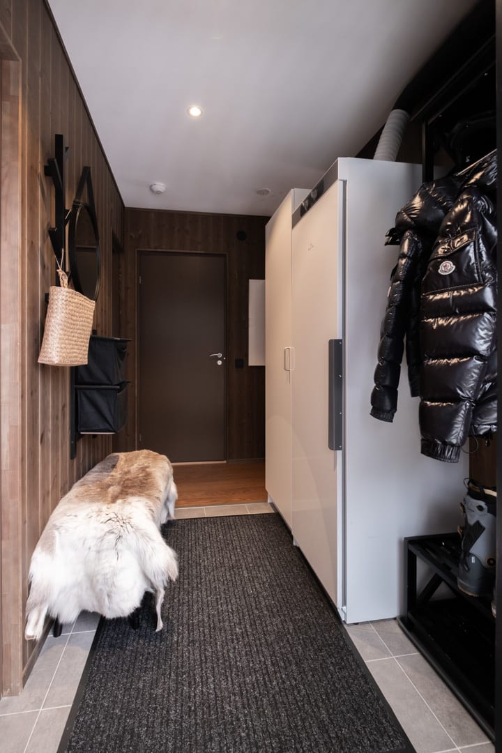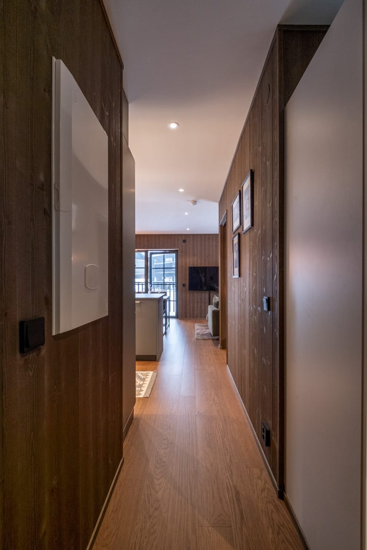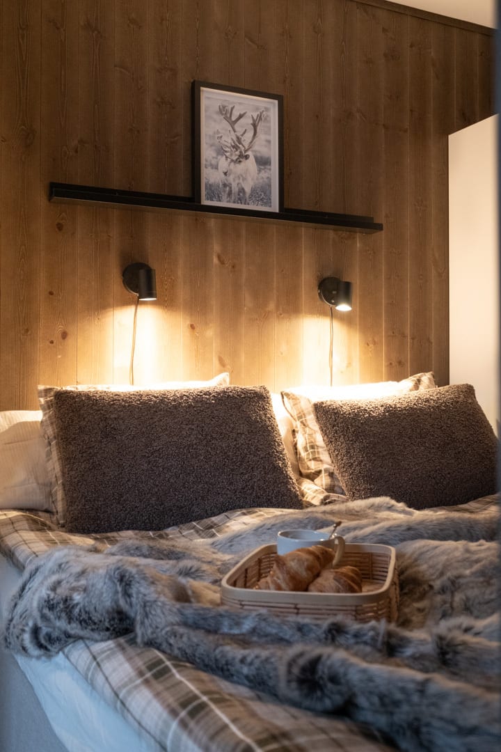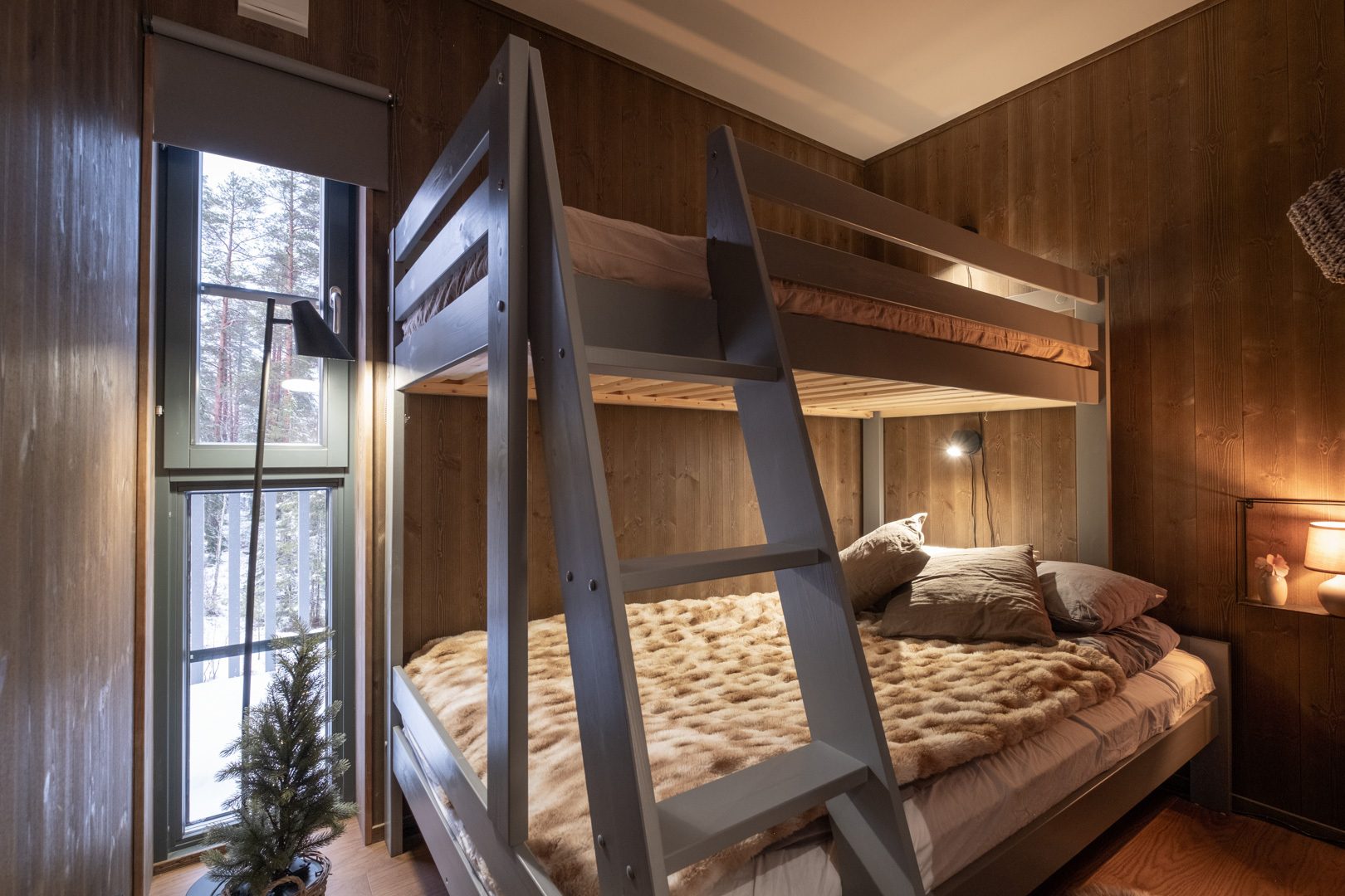 Vardagsrumsdelen är mysig med braskamin samt plats för soffa och mer därtill. Här spenderar man gärna lite extra tid efter en lång dag i backen. Mittemot köksdelen hittar du lägenhetens andra sovrum. Detta sovrum är inrett med våningssäng med enkelbädd i överslafen och en större 120 cm bred säng nere.