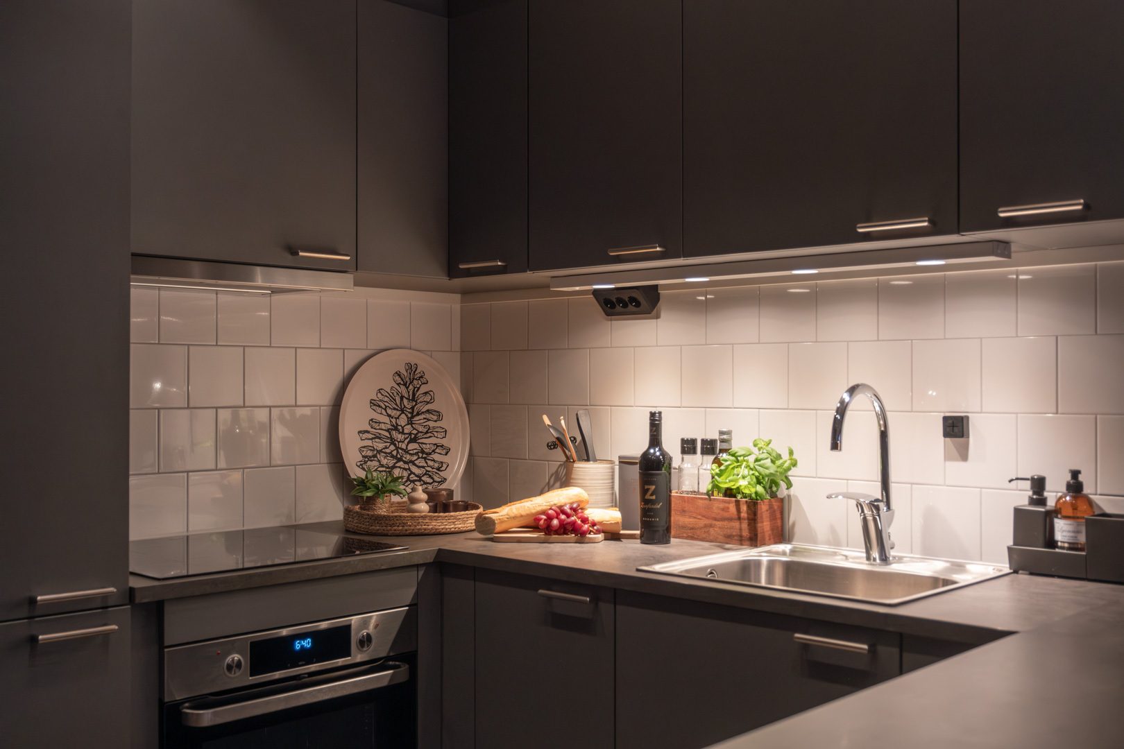 Modern design med öppen planlösning, välutrustad köksdel och vardagsrumsdel med utgång till terrass i vinkel med soligt läge.