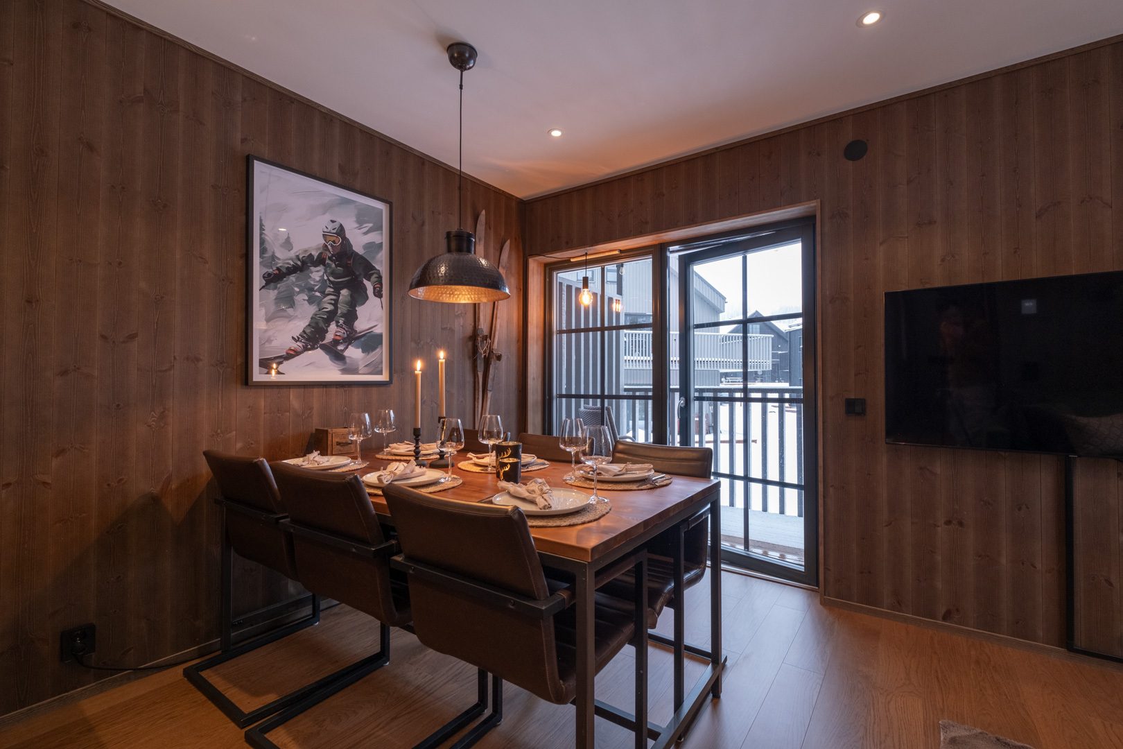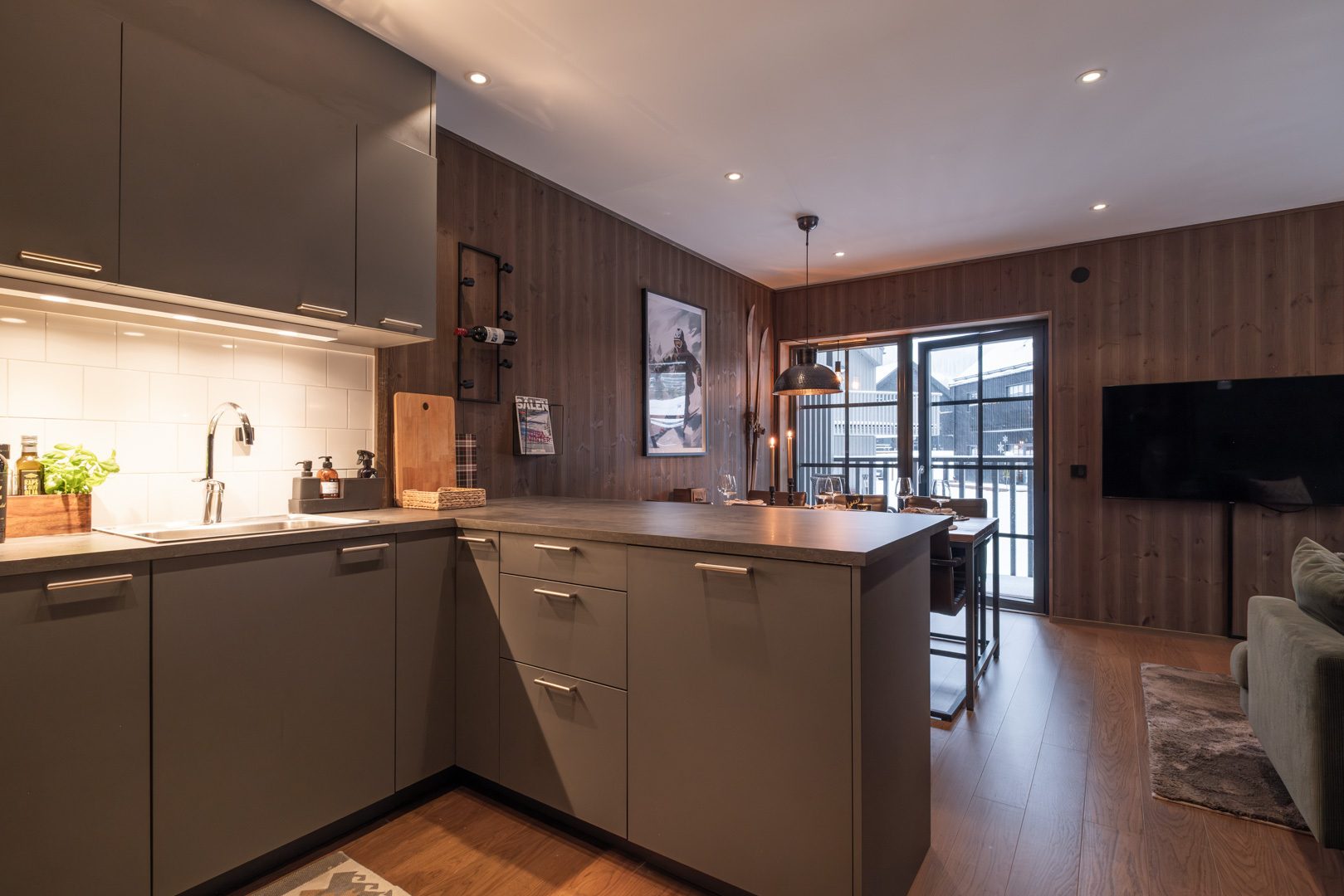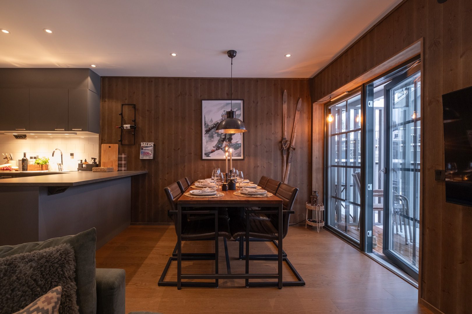 Vidare in från hallen hittar du köket och vardagsrummet i öppen planlösning. Köksdelen har bra arbetsytor med direktkontakt till både matplatsen och vardagsrummet. Köket har full maskinell utrustning i form av spis, kyl/frys, diskmaskin och mikrovågsugn. Separat matplats i anslutning för 6 personer och möjlighet till sittplats mot köksbänken med barstolar. Från matplatsen finns det stora fönsterpartier med utsikt mot fjället och dörr ut mot balkongen.