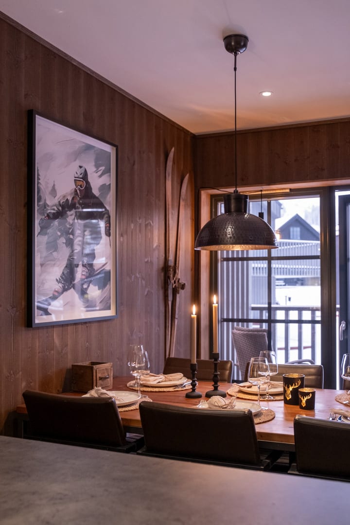 Inredningen håller genomgående hög klass med spröjsade glaspartier, vedeldad kamin och infällda spotlights som pricken över "I". Färgsättningen går i en naturnära färgskala. Väggarna är klädda med mörkbetsad träpanel och köksinredningen i skiffergrått. Enhetligt trägolv i kök, vardagsrum och sovrum. Vidare är det klinker i hallen och badrummen.