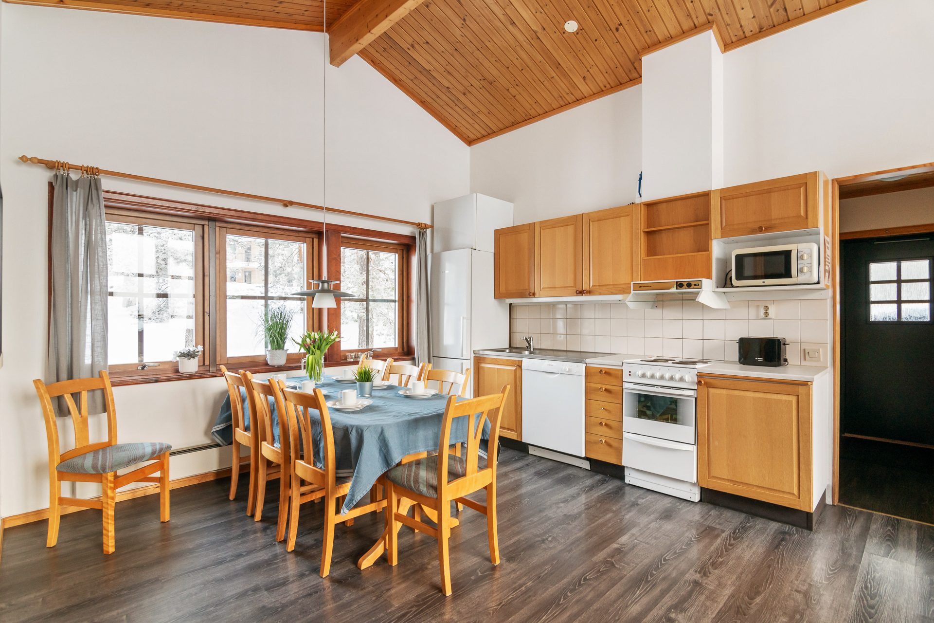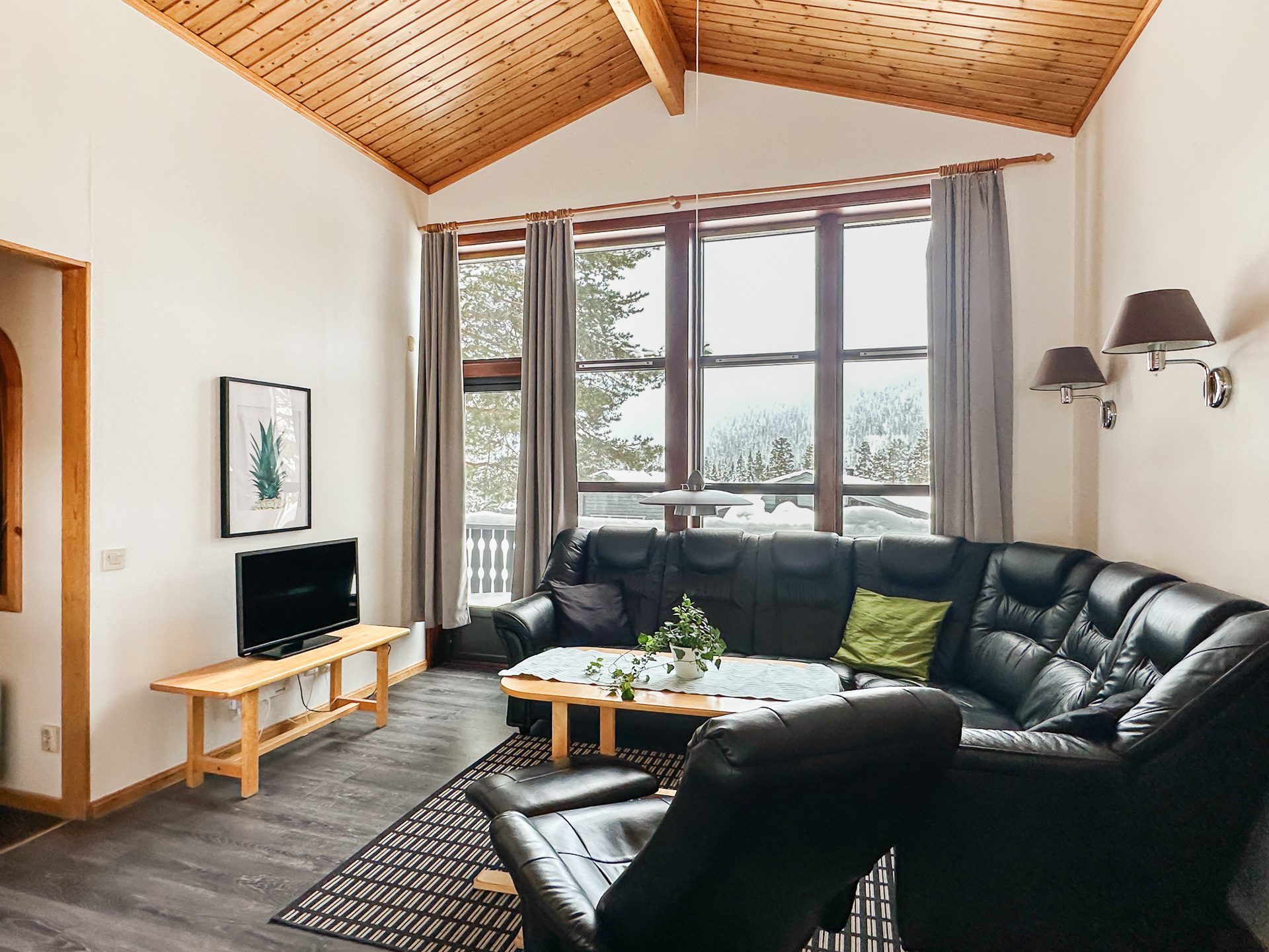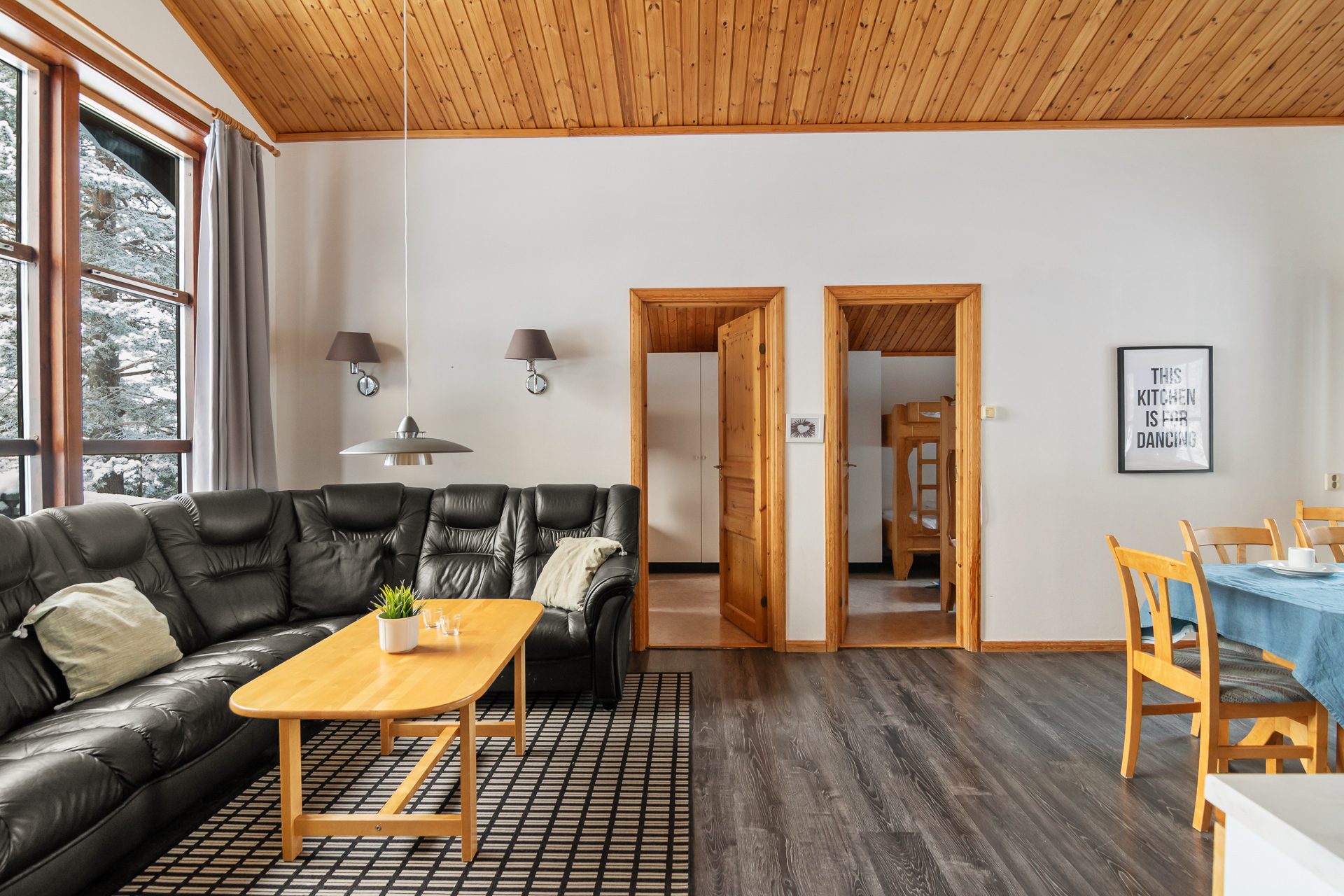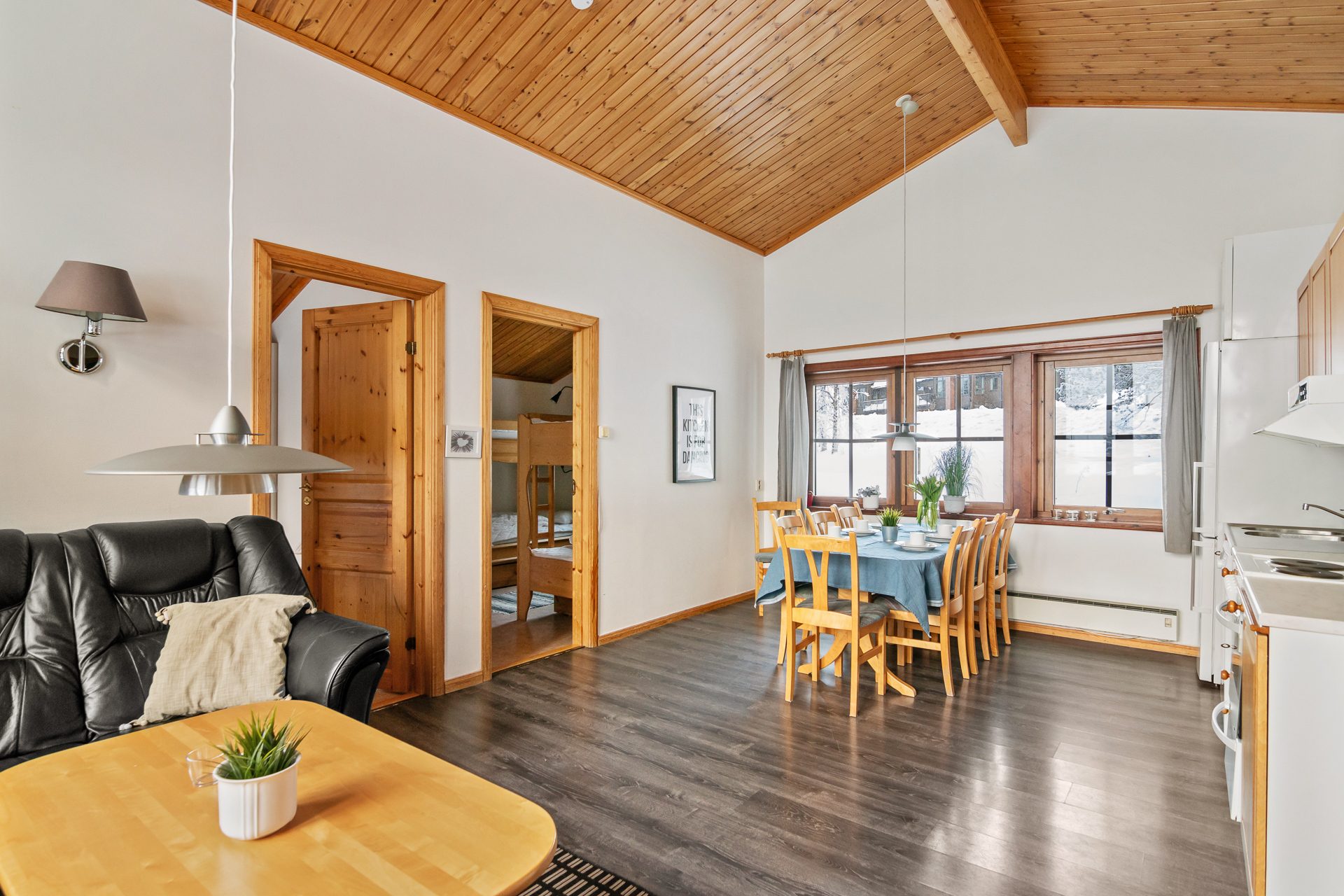Rummet har en fin rymd med öppet upp till nock och vidare utgång till altanen med utsikt mot fjället. Köksdelen är fullt utrustad med spis, diskmaskin, mikro, kyl/frys och matplats för 6-8 personer. Från vardagsrummet når du även sovrummen som båda är inredda med två våningssängar vardera.