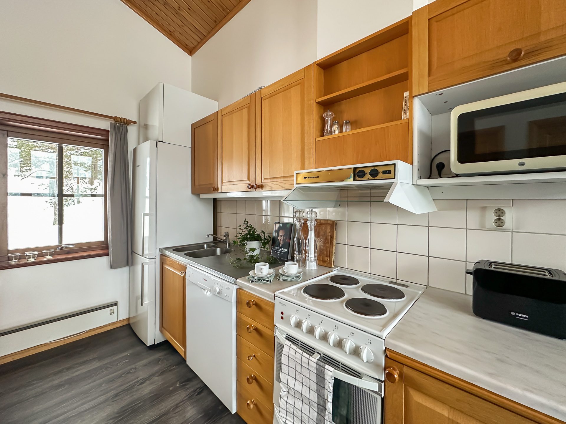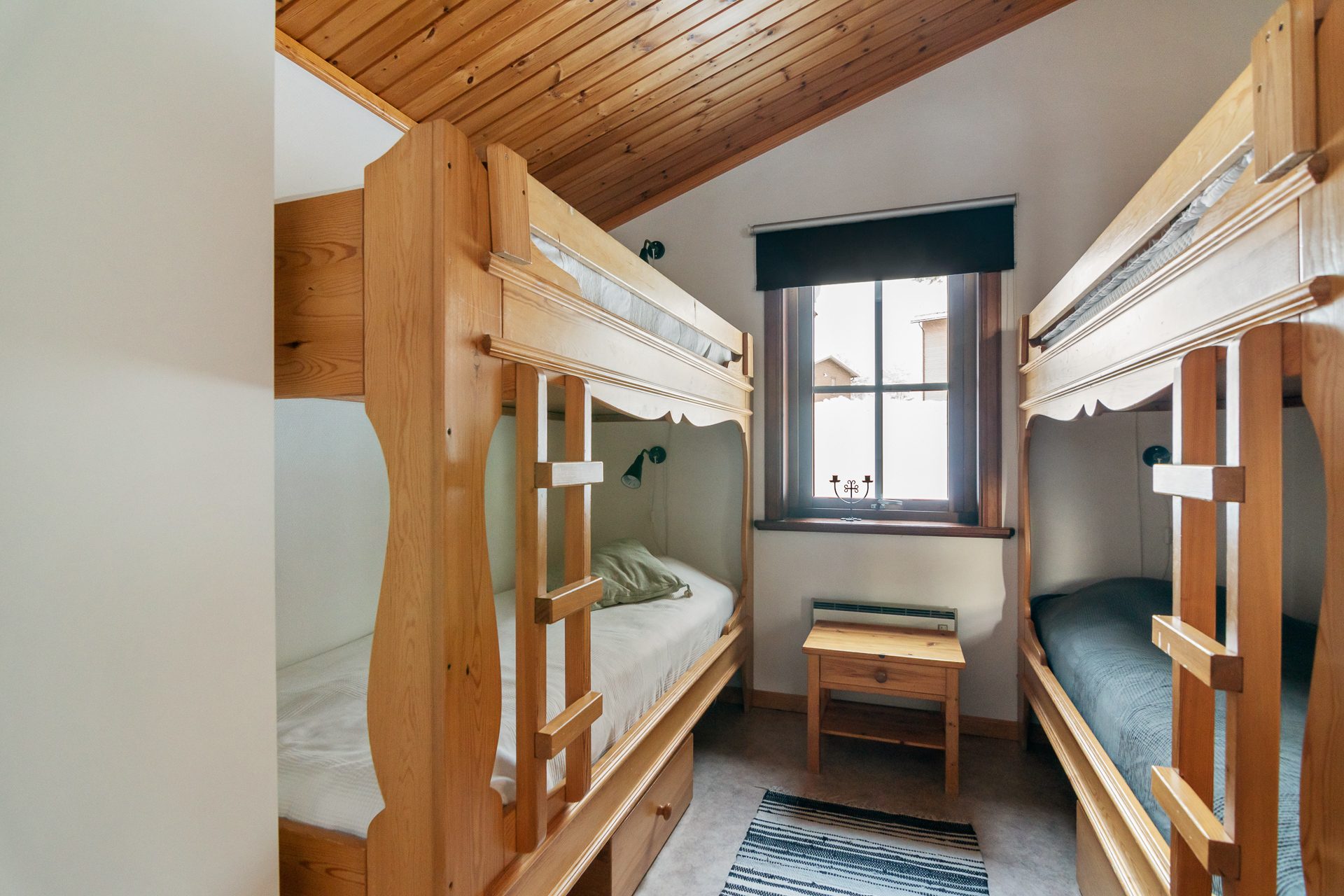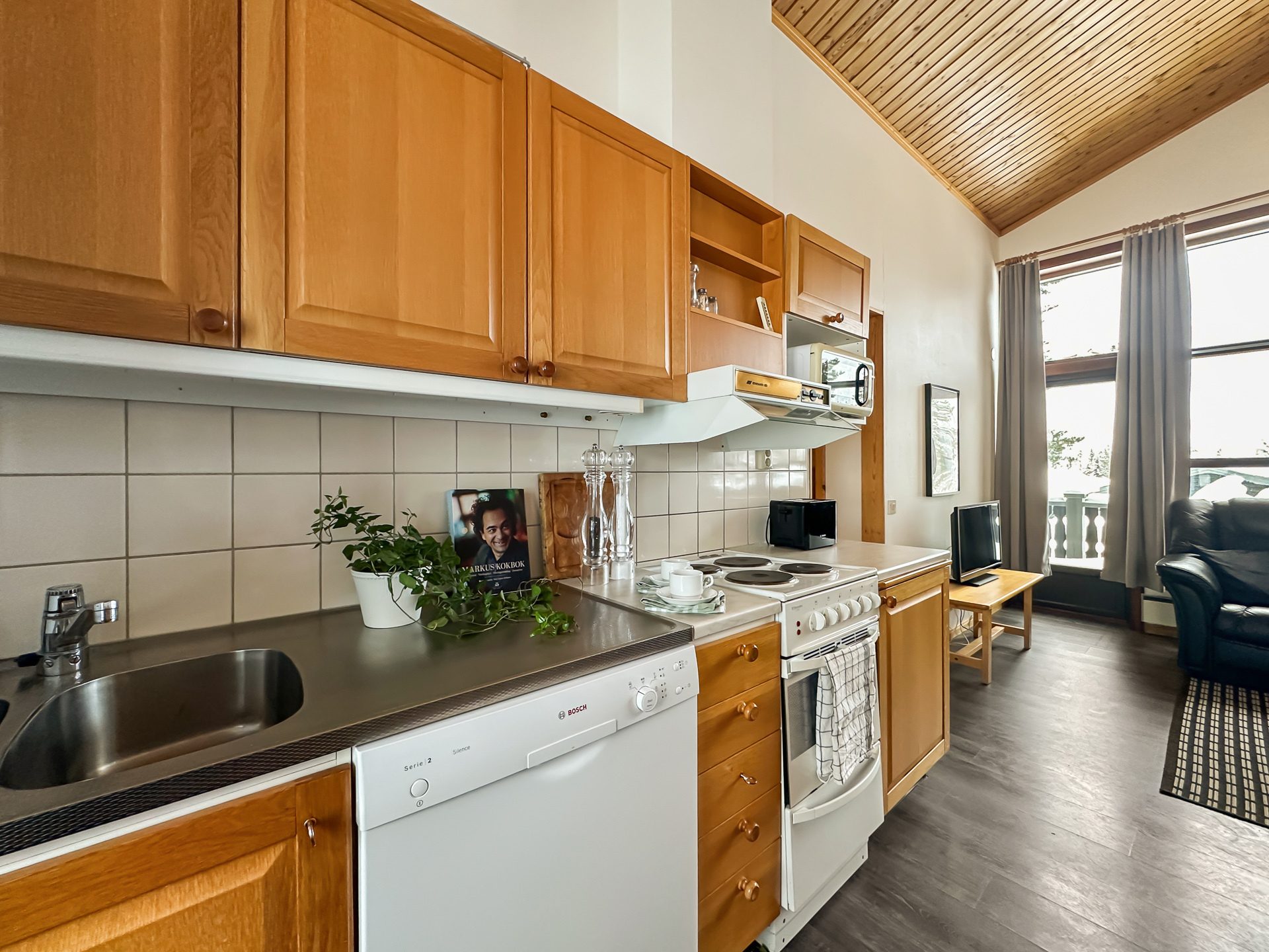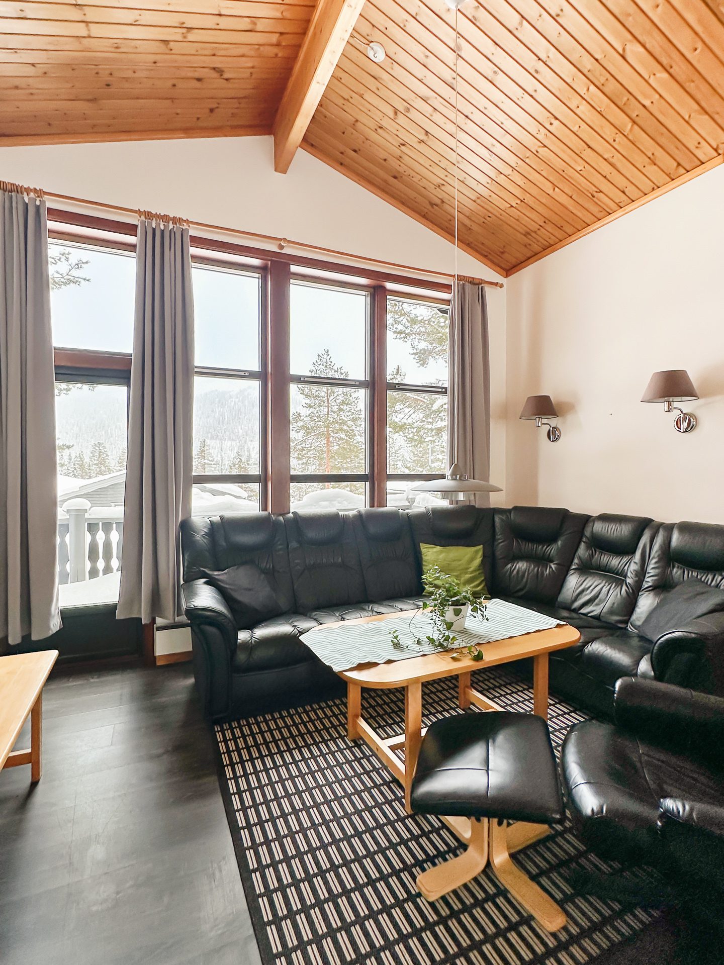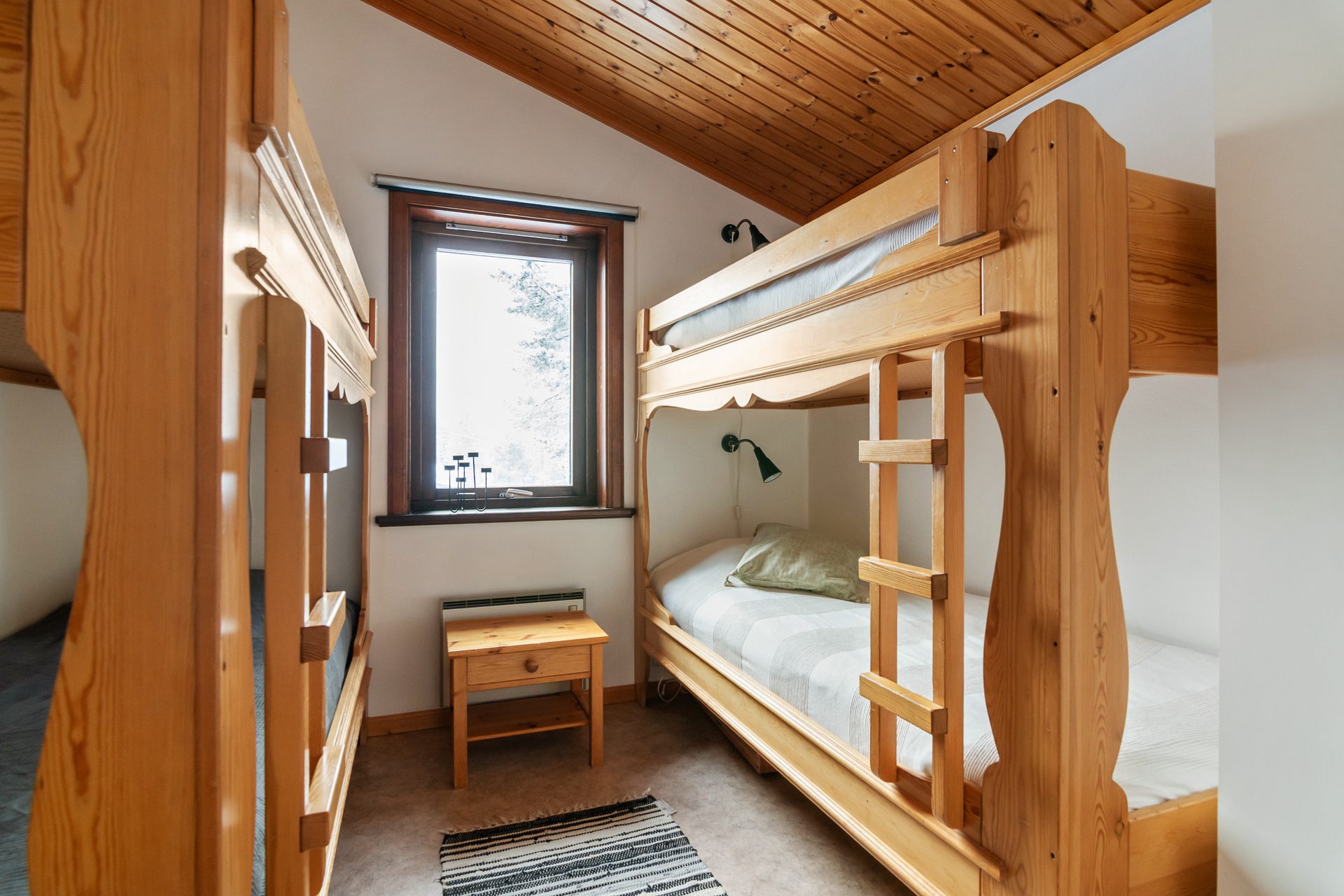 Rummet har en fin rymd med öppet upp till nock och vidare utgång till altanen med utsikt mot fjället. Köksdelen är fullt utrustad med spis, diskmaskin, mikro, kyl/frys och matplats för 6-8 personer. Från vardagsrummet når du även sovrummen som båda är inredda med två våningssängar vardera.