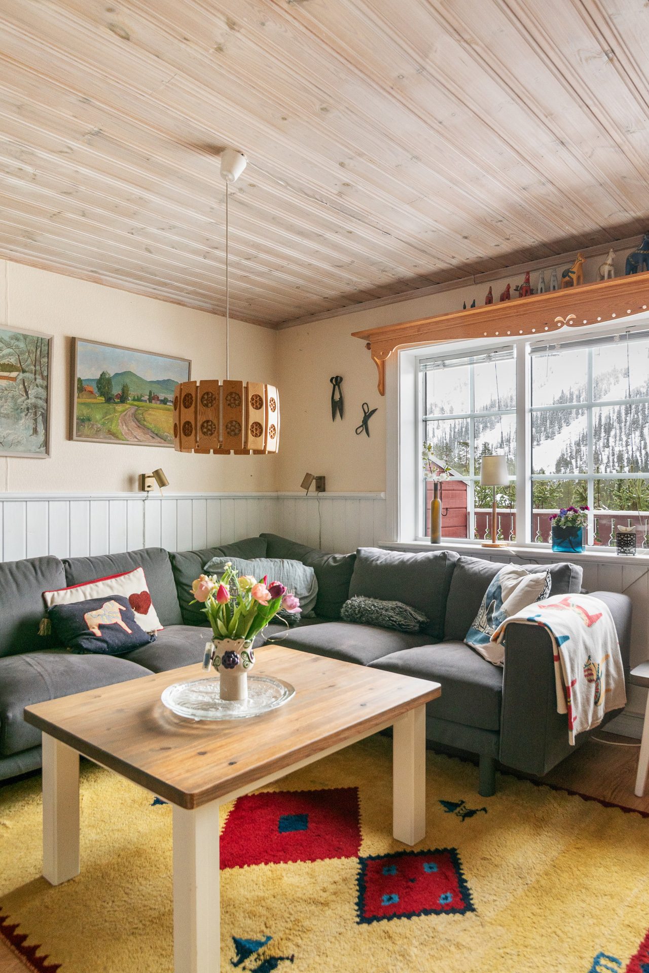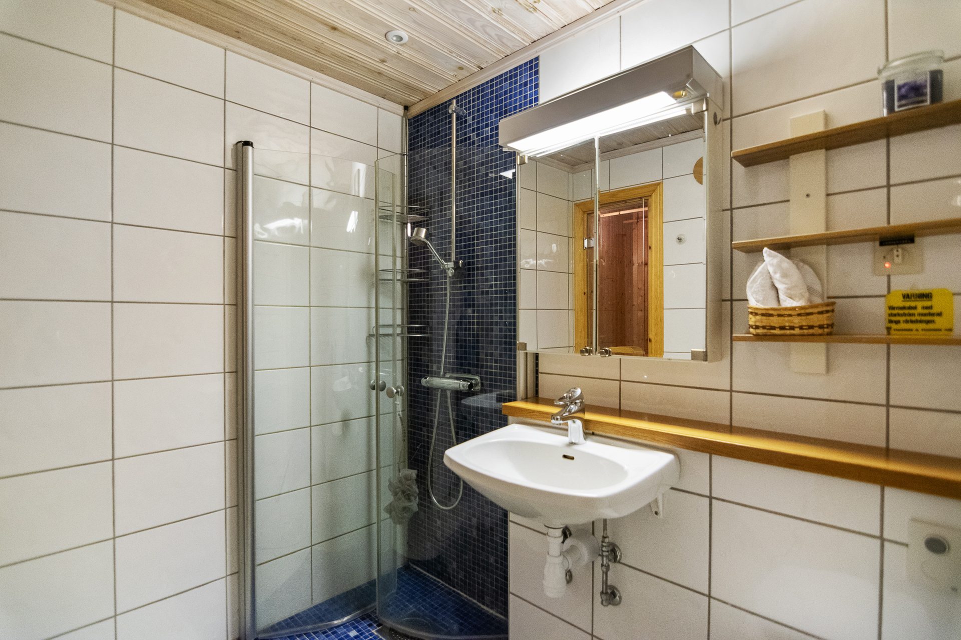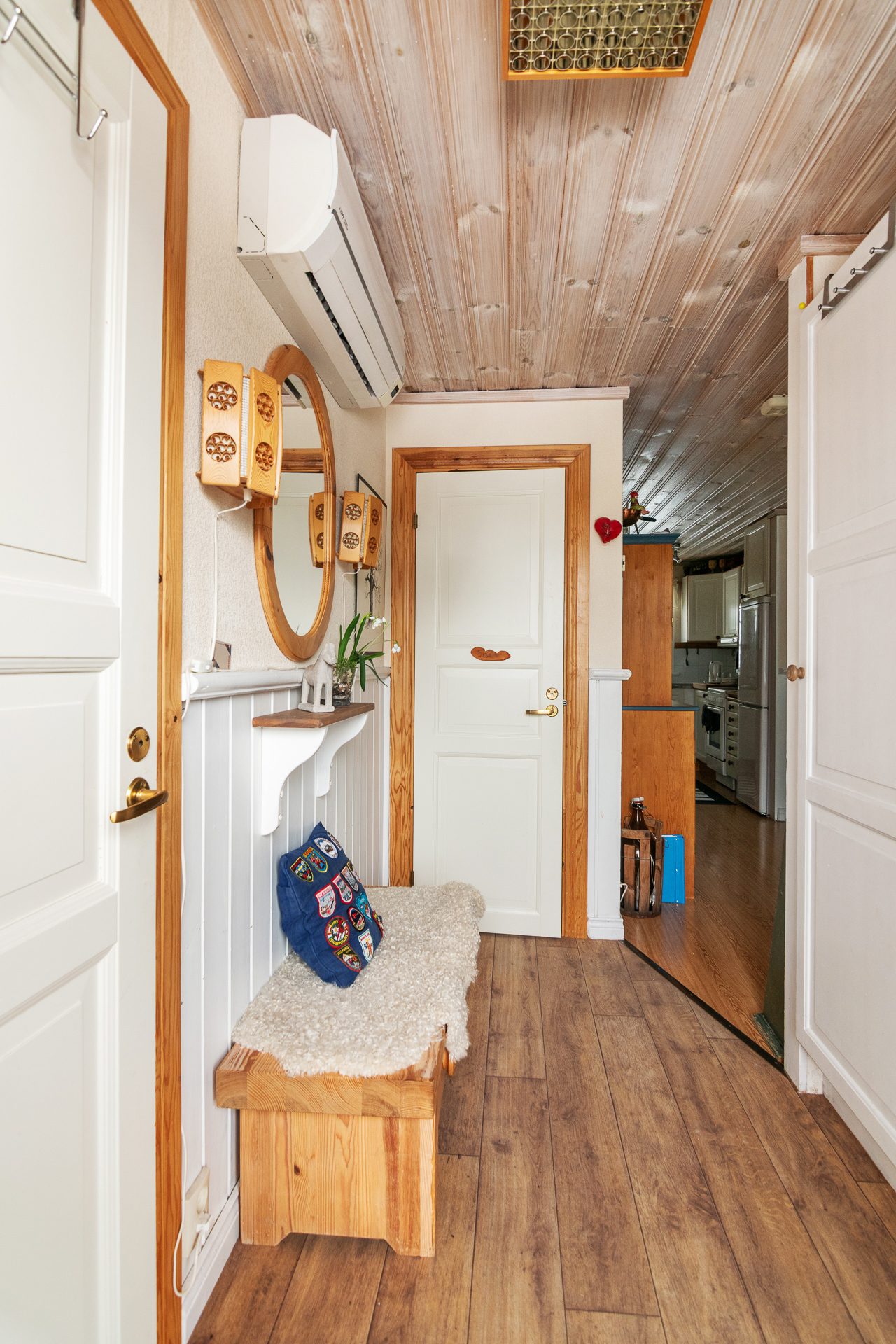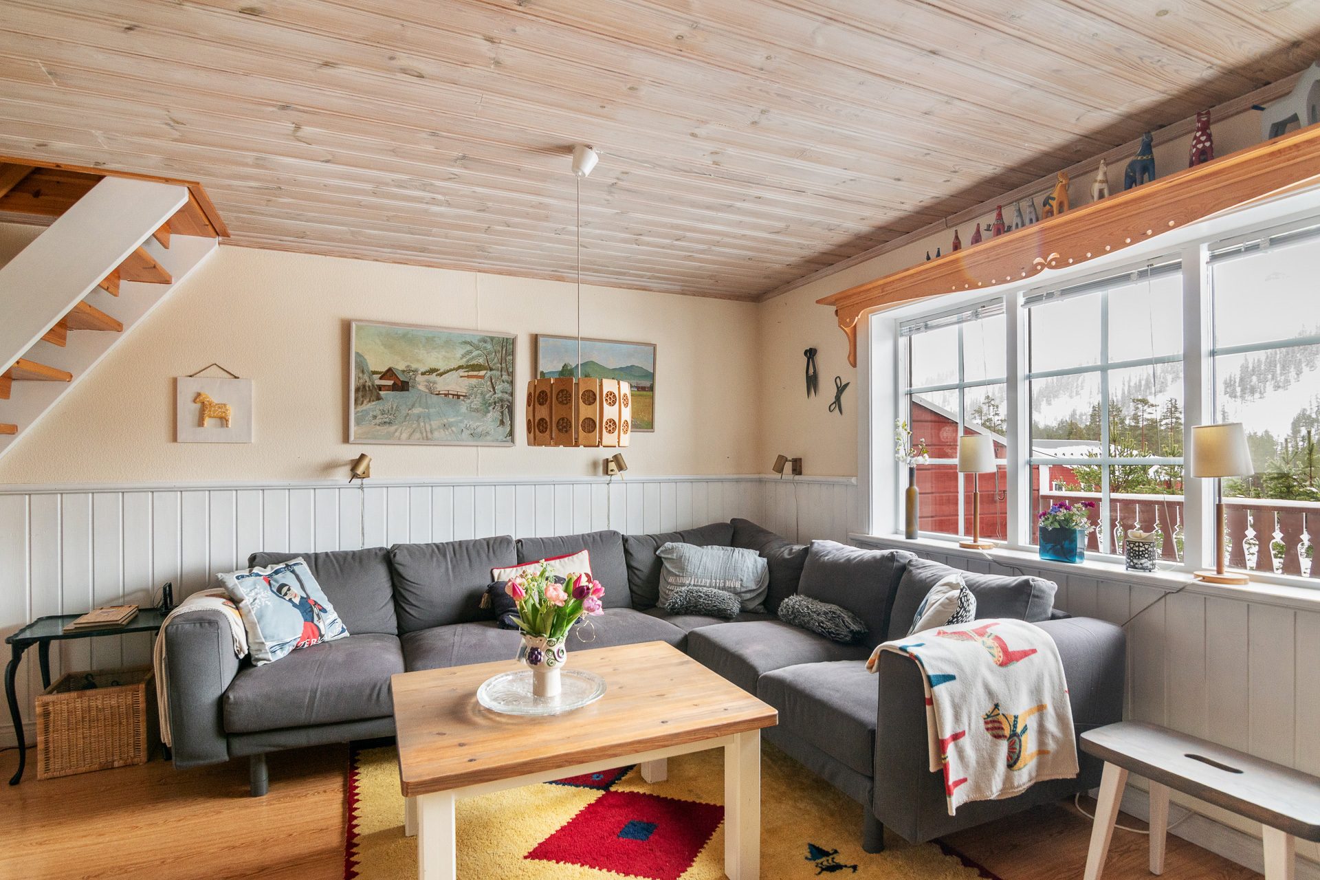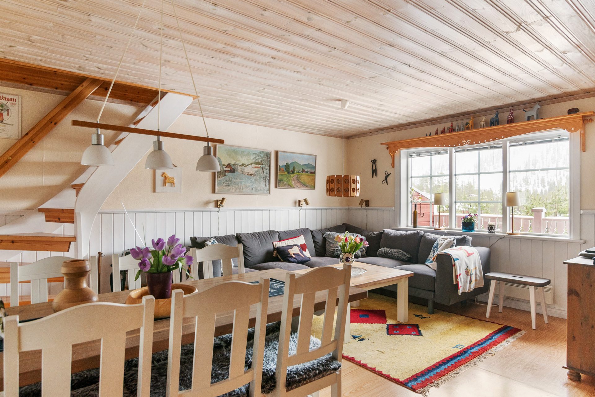 Trevlig hall med ingång från verandan som ligger vänd med utsikt mot backarna . Direkt till vänster finns ett praktiskt kapprum där du häger av dig ytterkläder och skor. Badrummet ligger rakt fram från hallen. Badrummet är helkaklat med dusch, handfat, spegelskåp med belysning, vägghängd wc, tvättmaskin och bastu. Vidare in i huset hittar vi det generösa vardagsrummet med bra ljusinsläpp samt plats för både soffgrupp och matplats. Fönsterpartiet i vardagsrummet är stort vilket ger gott om dagsljus och vacker utsikt mot backarna. Här finns även trappan upp till loftvåningen.