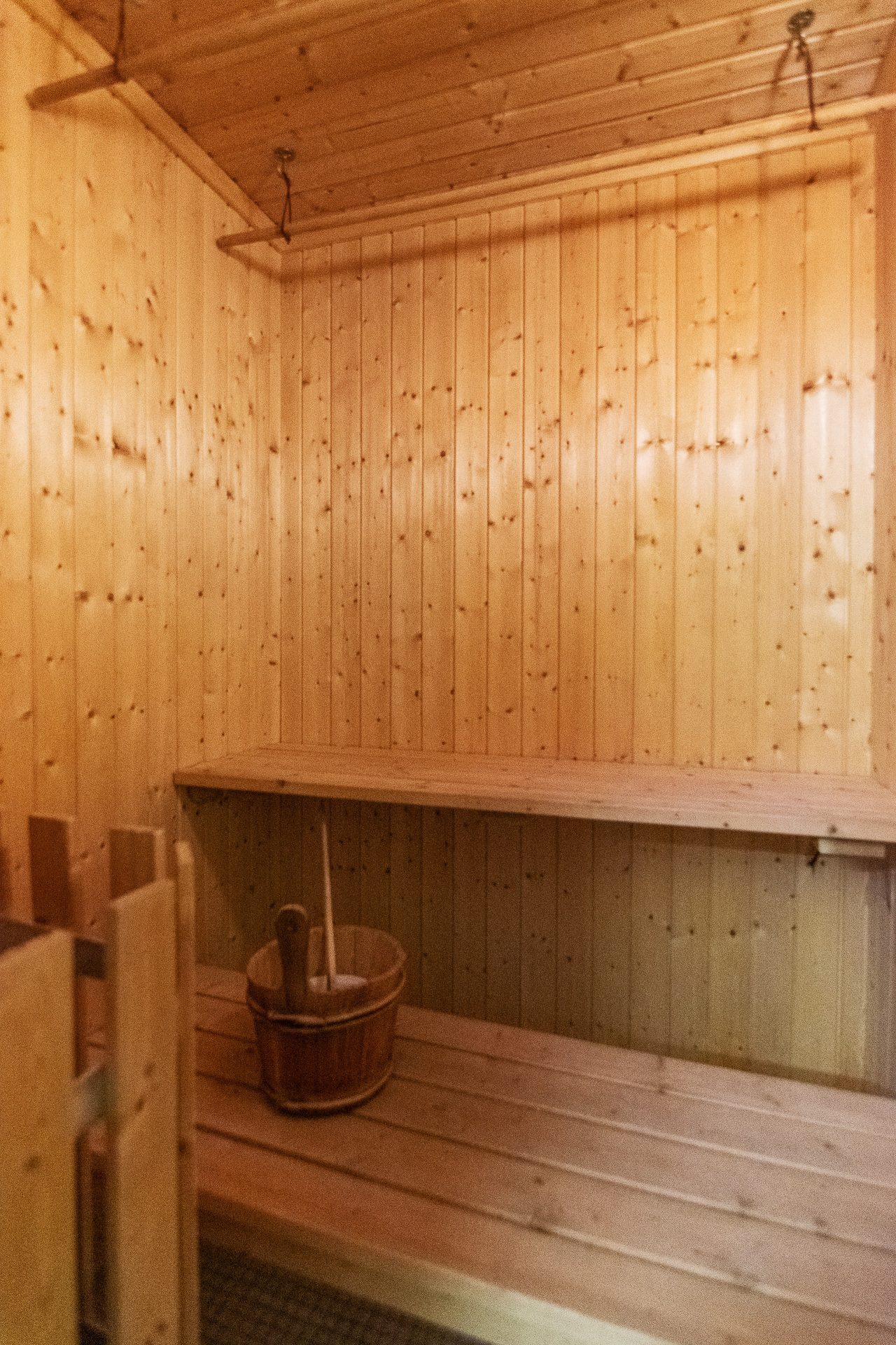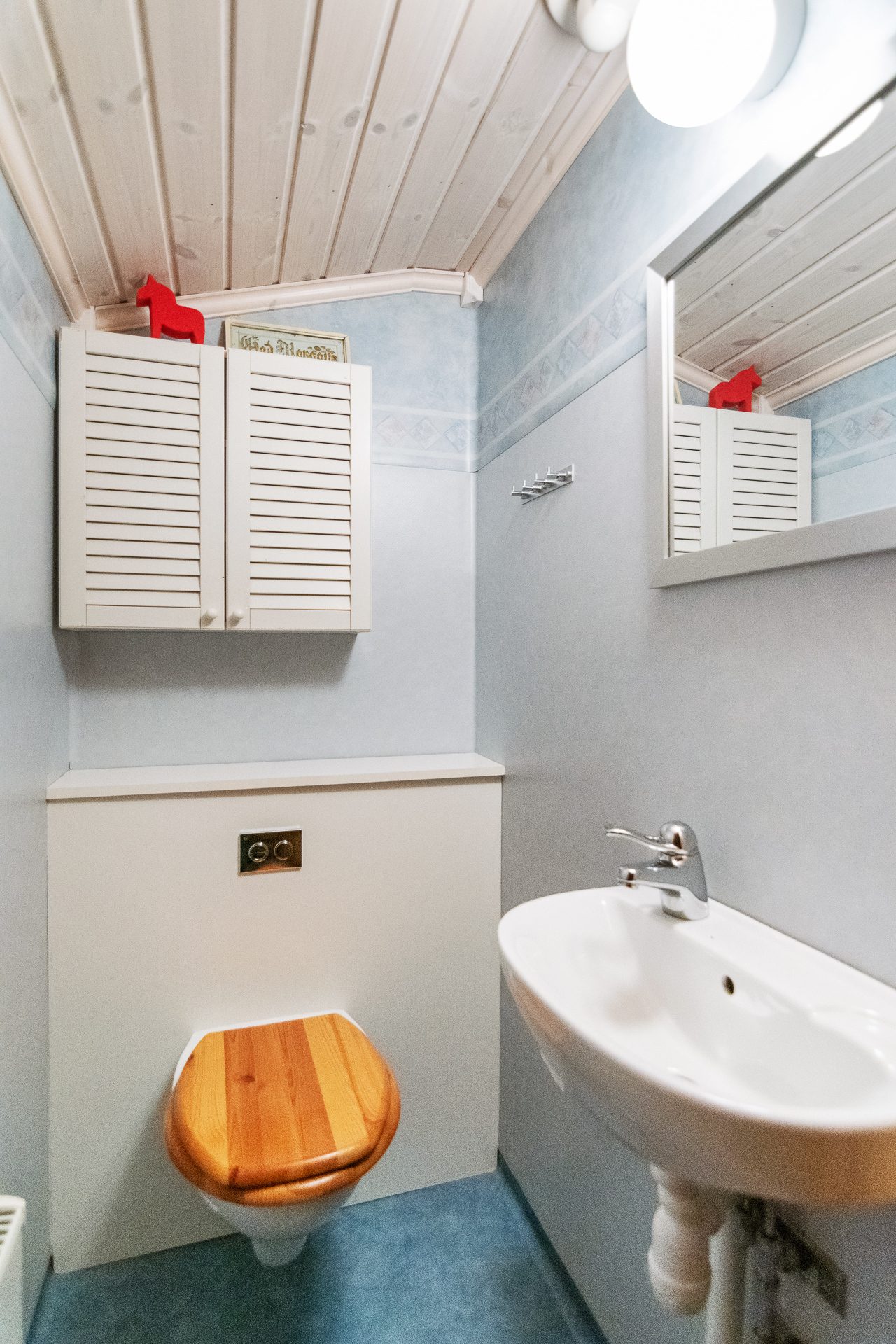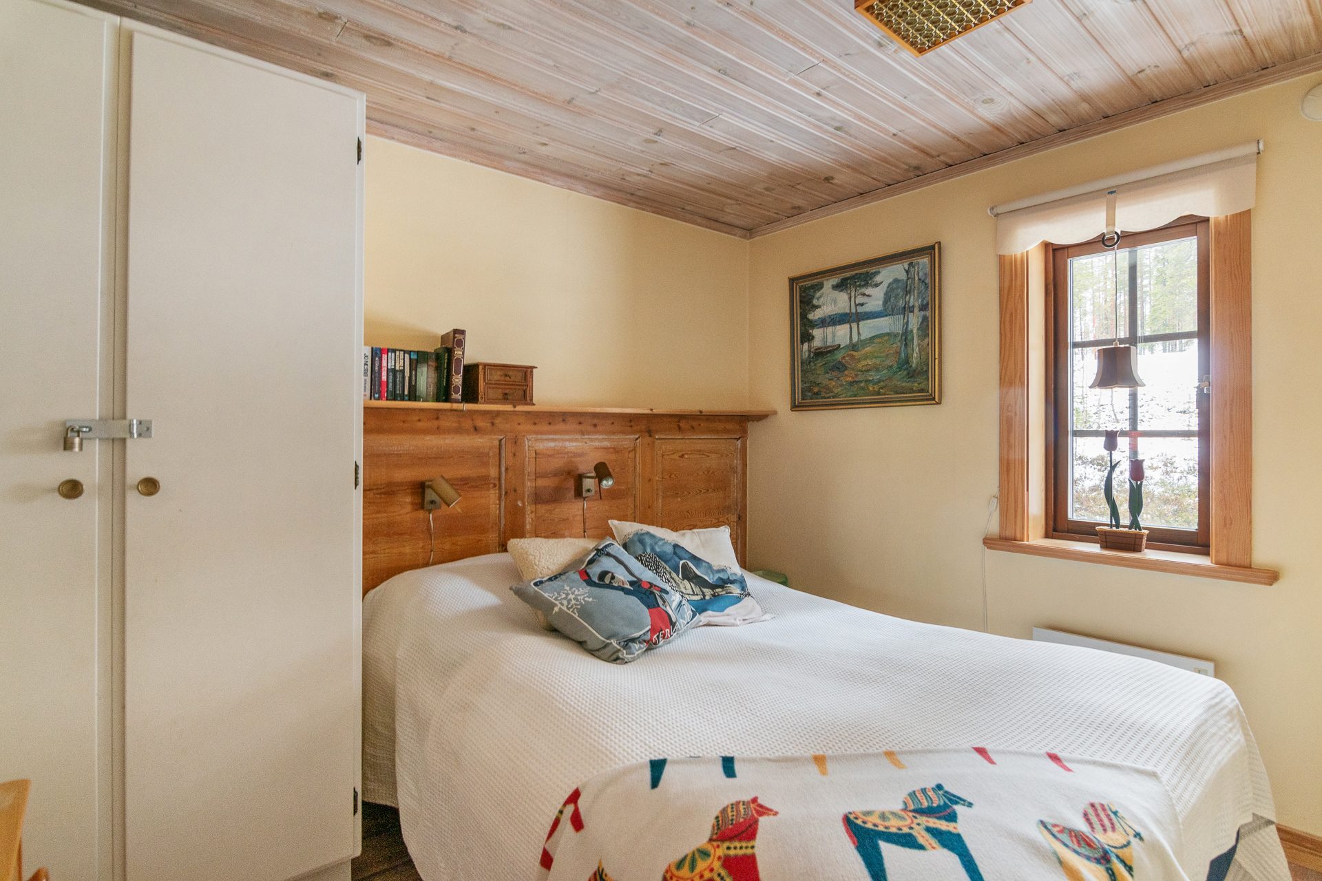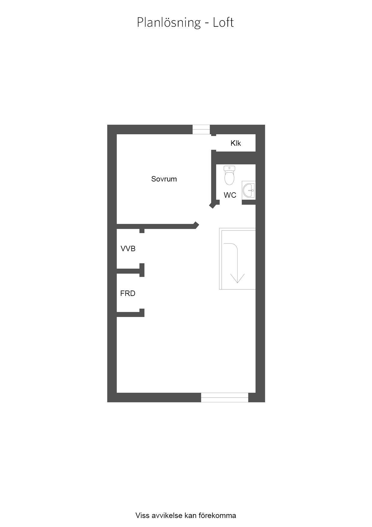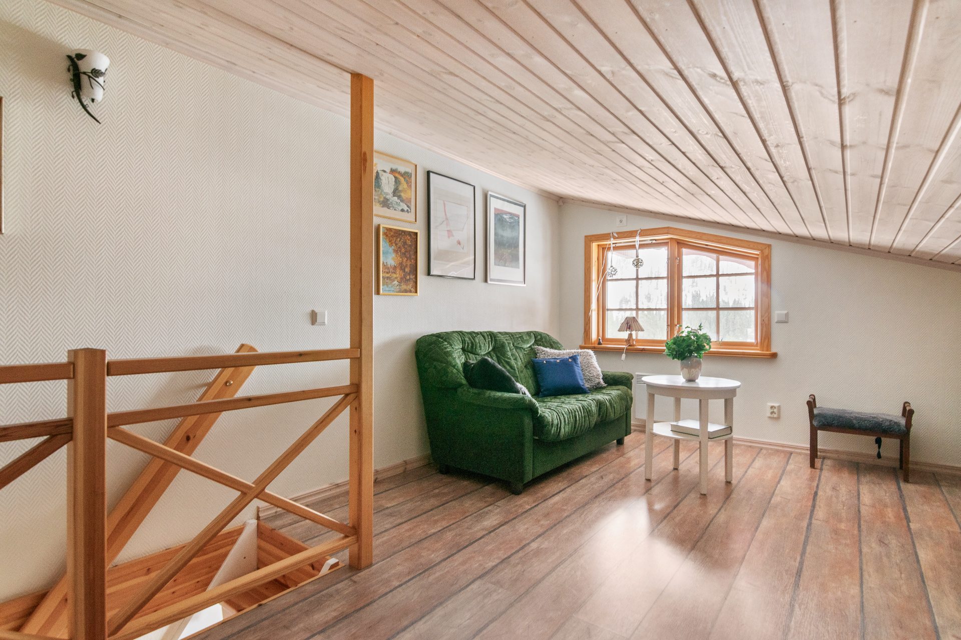 En trappa upp har du loftvåningen med ett stort allrum, sovrum med snedtak med och två enkelsängar. Vidare finns det ett badrum med wc och tvättställ.