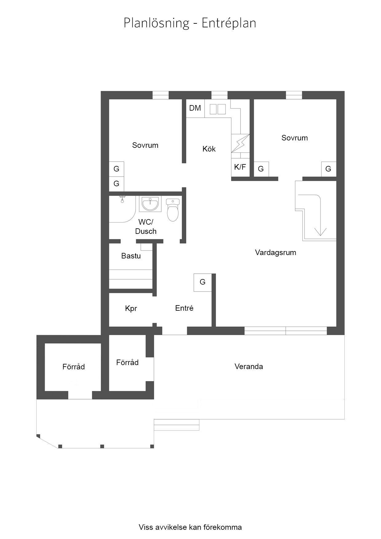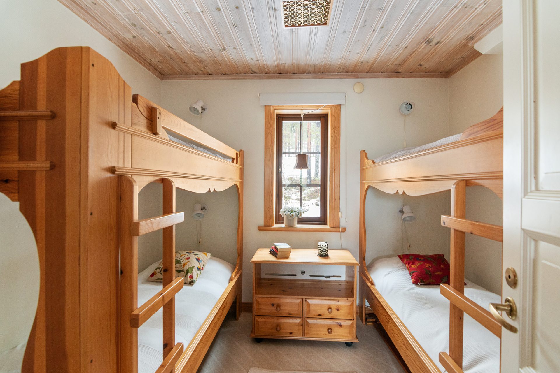 Från vardagsrummet når du köket som är utrustat med spishäll, diskmaskin, mikro samt kyl och frys. Entréplanet erbjuder även två sovrum varav ett med dubbelsäng och garderober samt ett sovrum med två våningssängar och garderober.