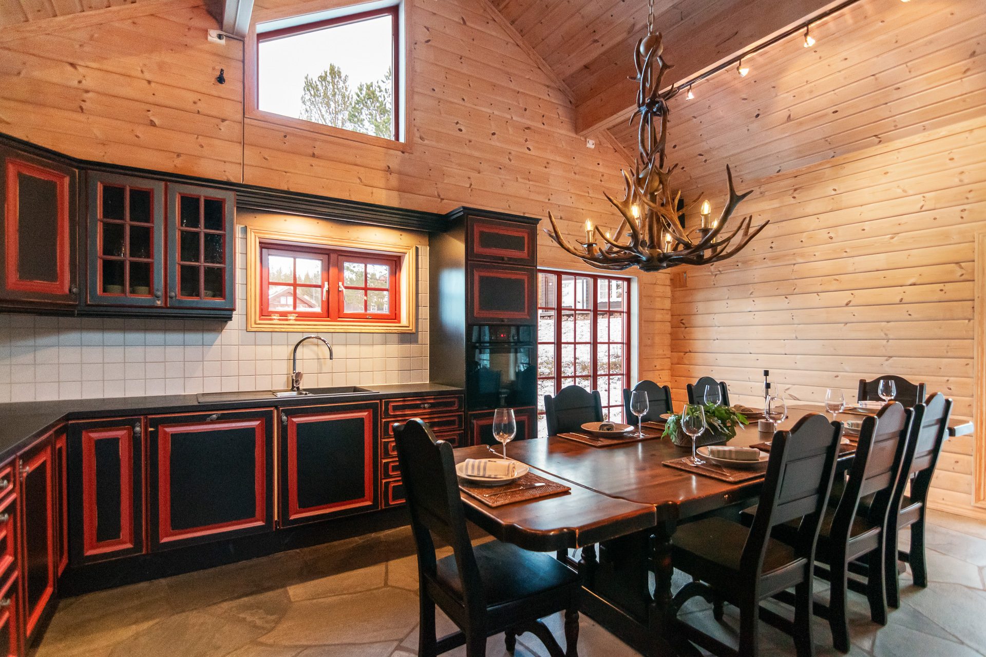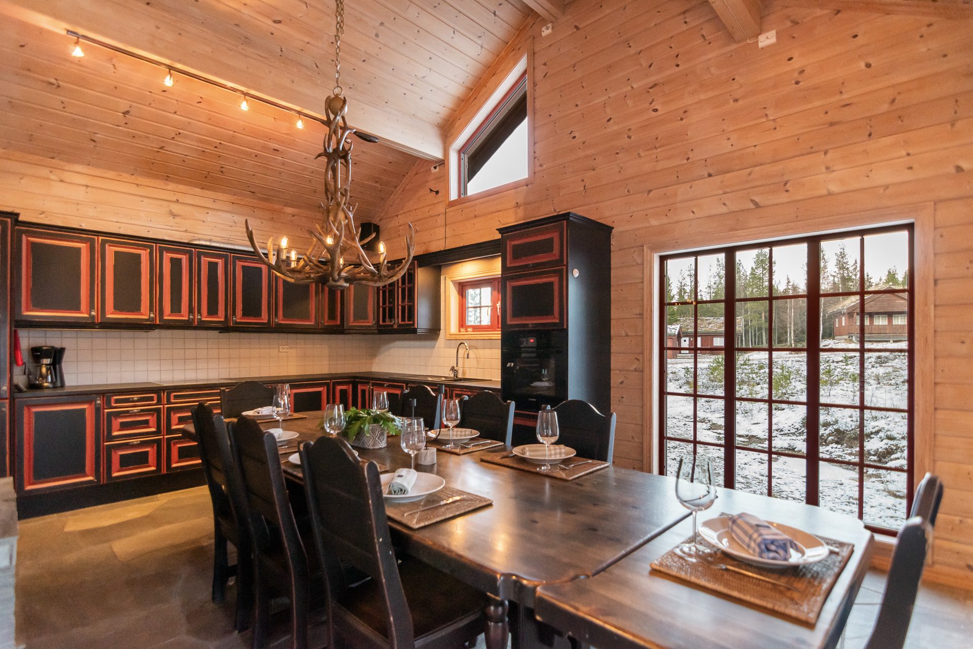 Kök och vardagsrum i öppen planlösning med gott om utrymme för både matplats och soffgrupp. Den generösa takhöjden upp till nock ger en härlig känsla av rymd. Som detta inte vore nog så finns det en stoltserande eldstad med vedinkast från köket och synlig från vardagsrummet med murad skorsten upp till taket. Detta är verkligen en detalj som sätter en fin prägel på rummet. Köket är stort och rymligt med gott om arbetsytor och bra förvaring. Full maskinell utrustning med diskmaskin, kyl/frys , spishäll, ugn och mikro. Matplatsen rymmer 14 personer.