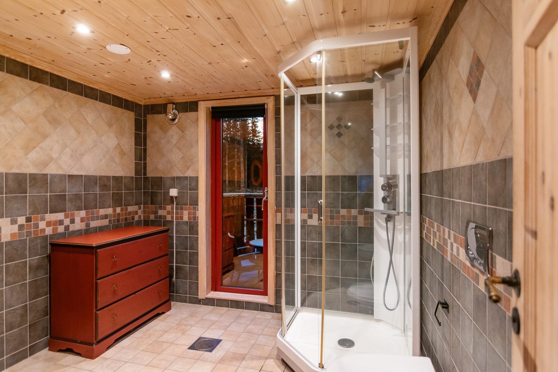 Vidare finns i detta hus ett stort helkaklat badrum på entrévåningen med dusch, wc tvättställ med kommod och dörr ut mot altanen och bastun. Separat wc med tvättställ med ingång från den inre hallen. Källarvåningen har wc, dusch, tvättställ och tvättmaskin.