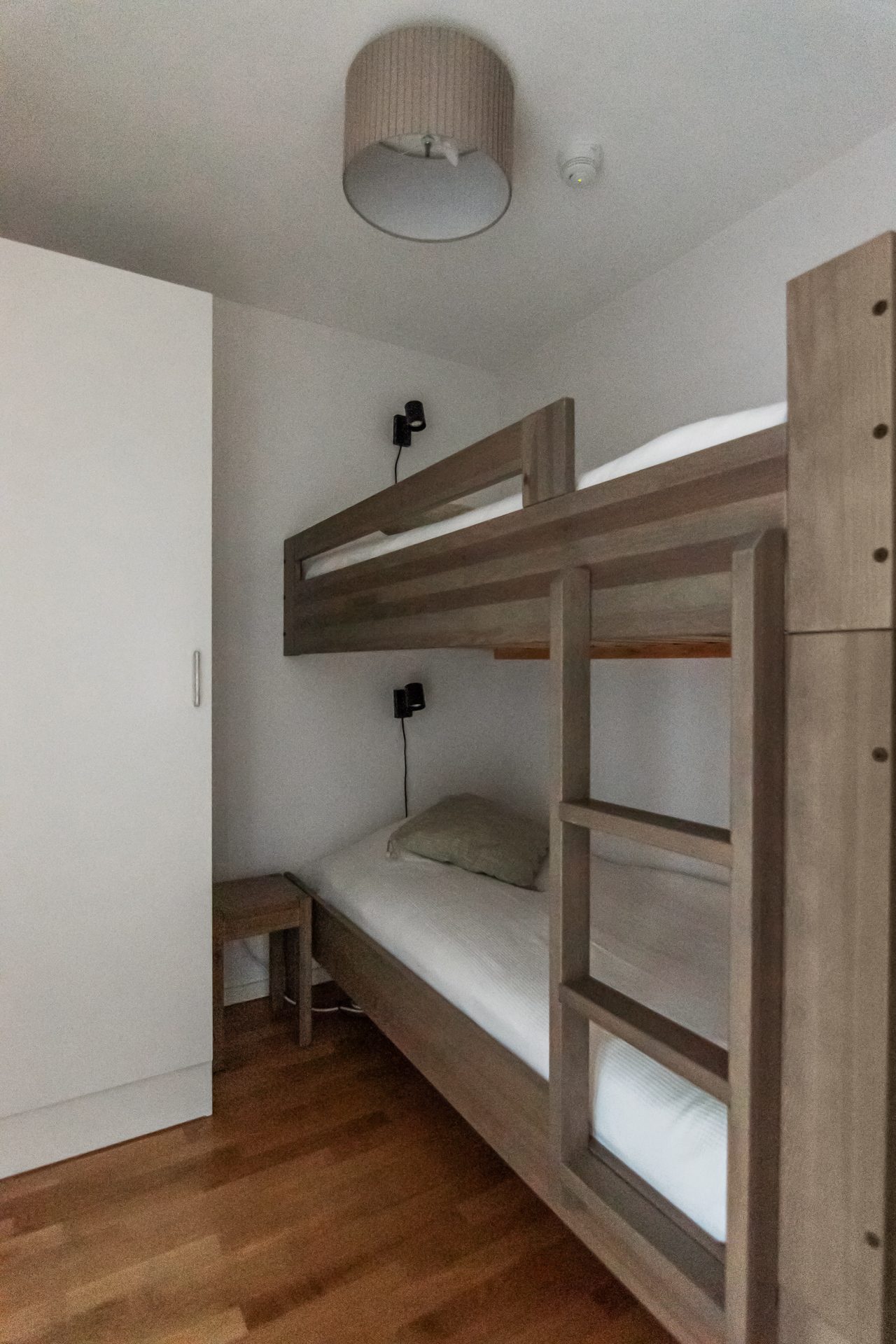 Vid den ena sidan i hallen ligger samtliga tre sovrum i fil, varav det första är inrett med en familjevåningssäng och det andra har våningssäng samt garderob. Masterbedroom är beläget längst in i lägenheten och har dubbla ingångar från vardagsrummet samt en fin utsikt mot backarna.