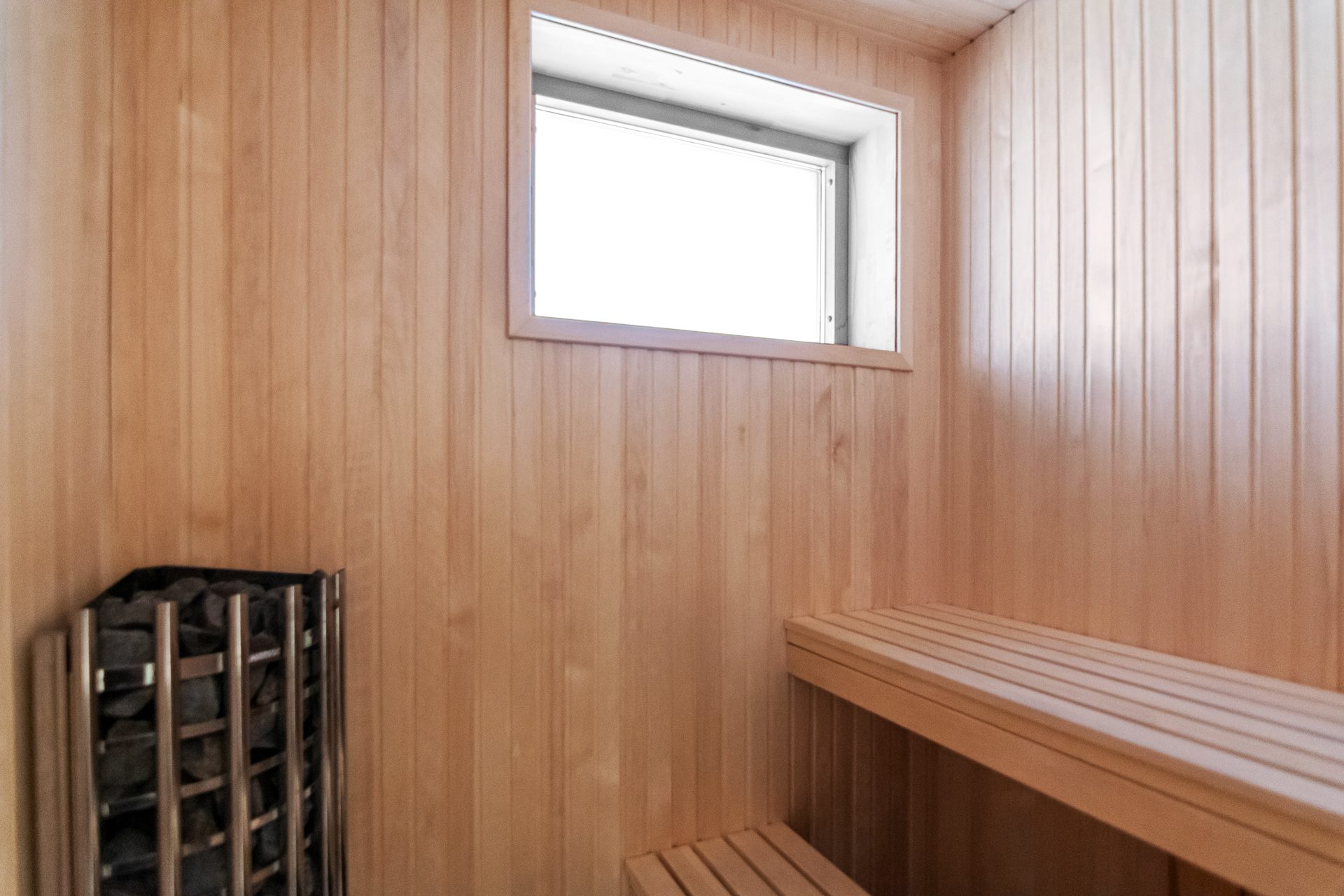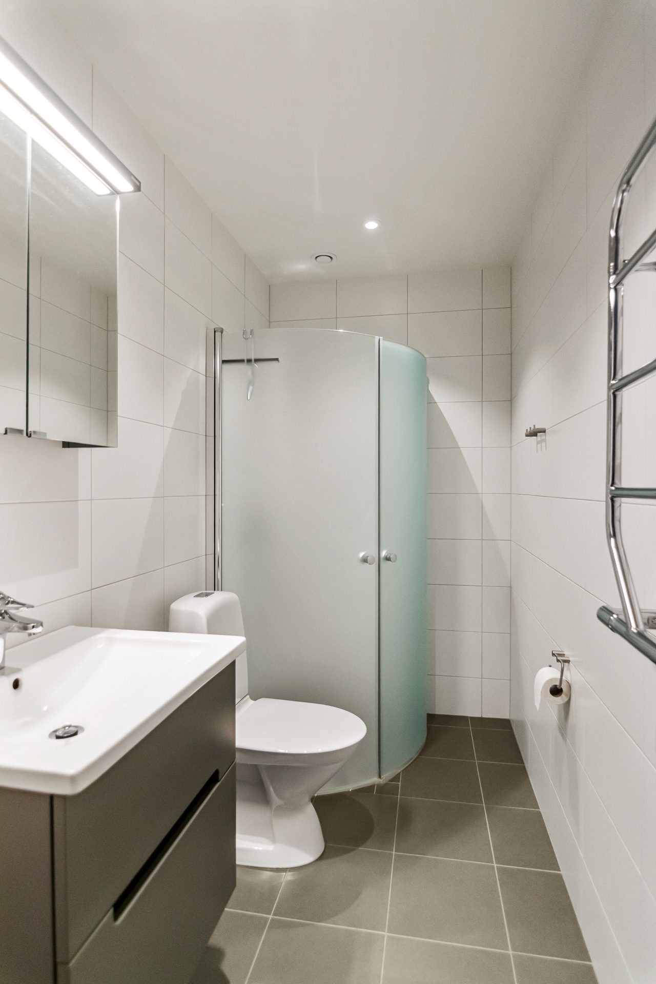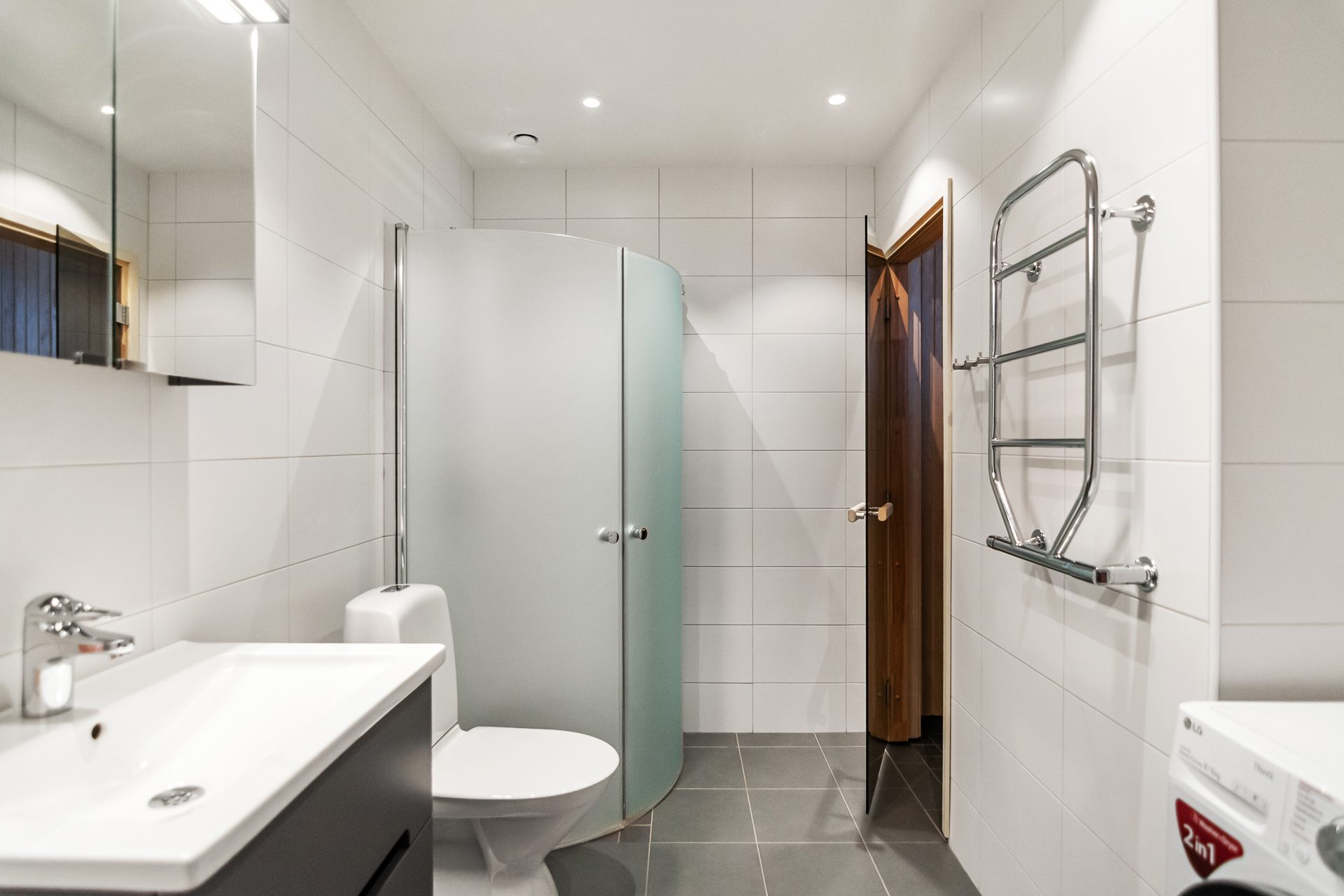 Till höger i hallen hittar du ett helkaklat badrum inrett med handfat med kommod, wc, dusch med glasdörr, handdukstork samt bastu för 4 personer. Vid sidan av badrummet ligger ytterligare ett badrum med wc, tvättställ och dusch.