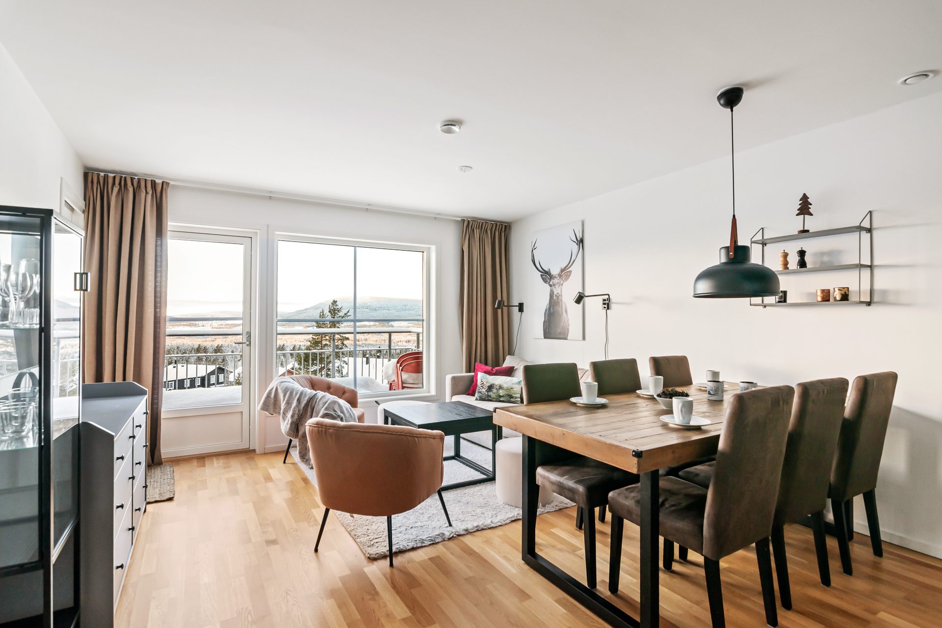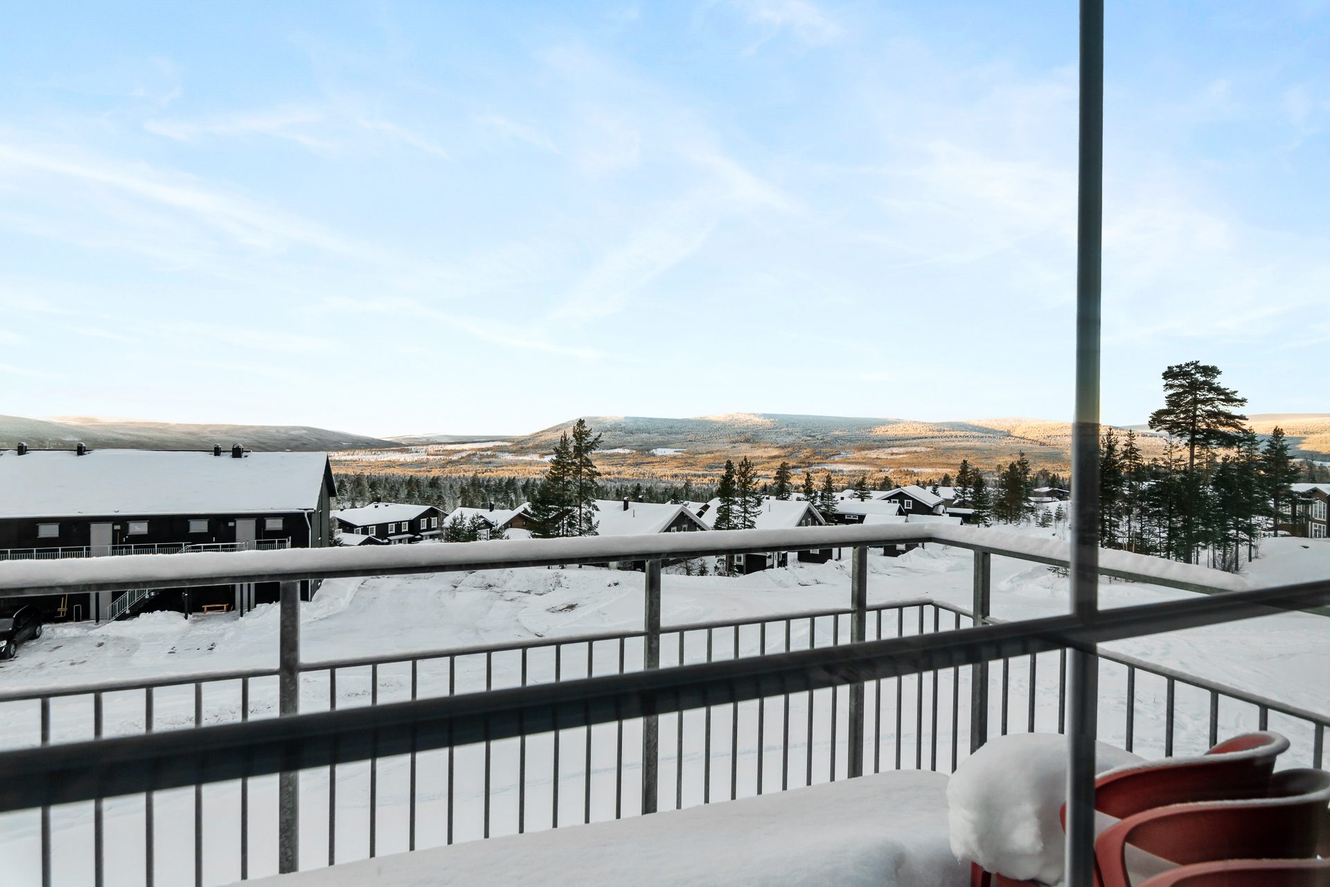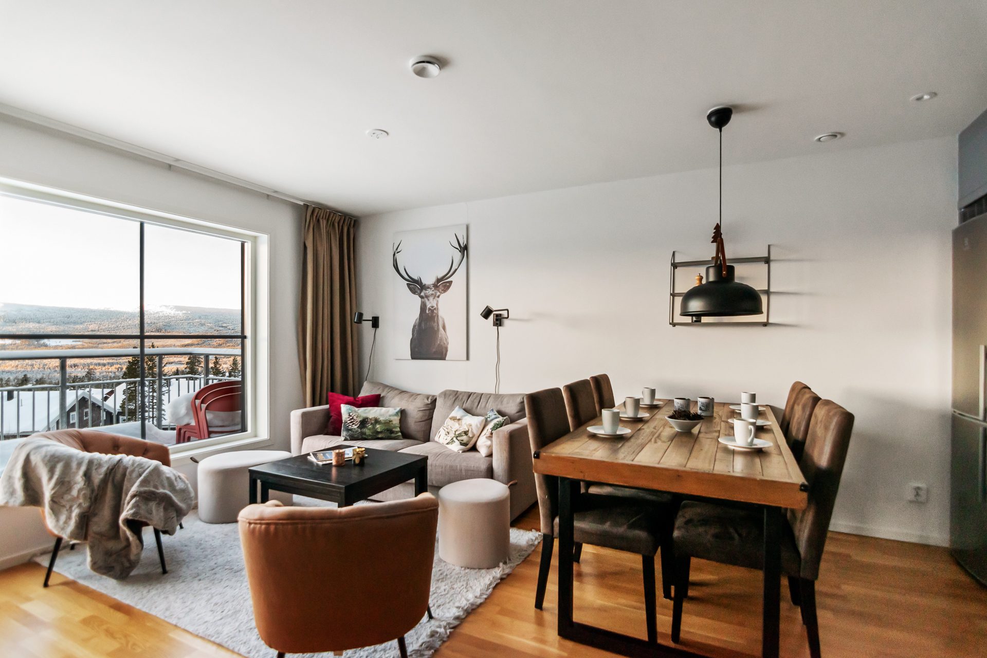 Köksdelen är fullt utrustad med spishäll med ugn, spisfläkt, mikro, nedsänkt diskho, diskmaskin samt kyl/frys. Matplats för 6 personer. Vardagsrumsdelen har stort fönsterparti samt utgång till balkong med fantastisk utsikt över fjället.