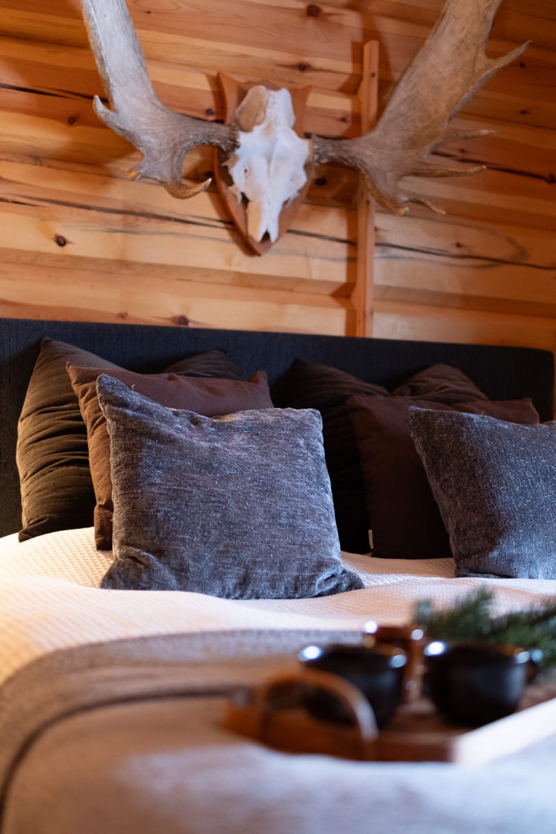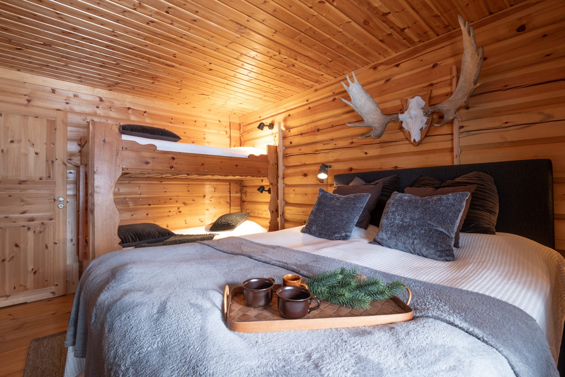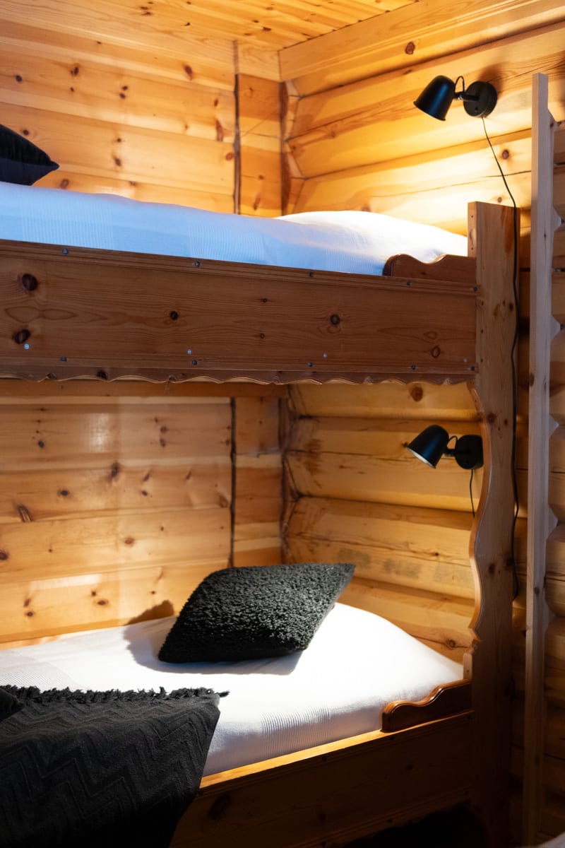 Timrad och varmbonad gäststuga med prydande grästak. Stugan är inredd med två våningssängar varav den ena sängen har en familjesäng längst ner.