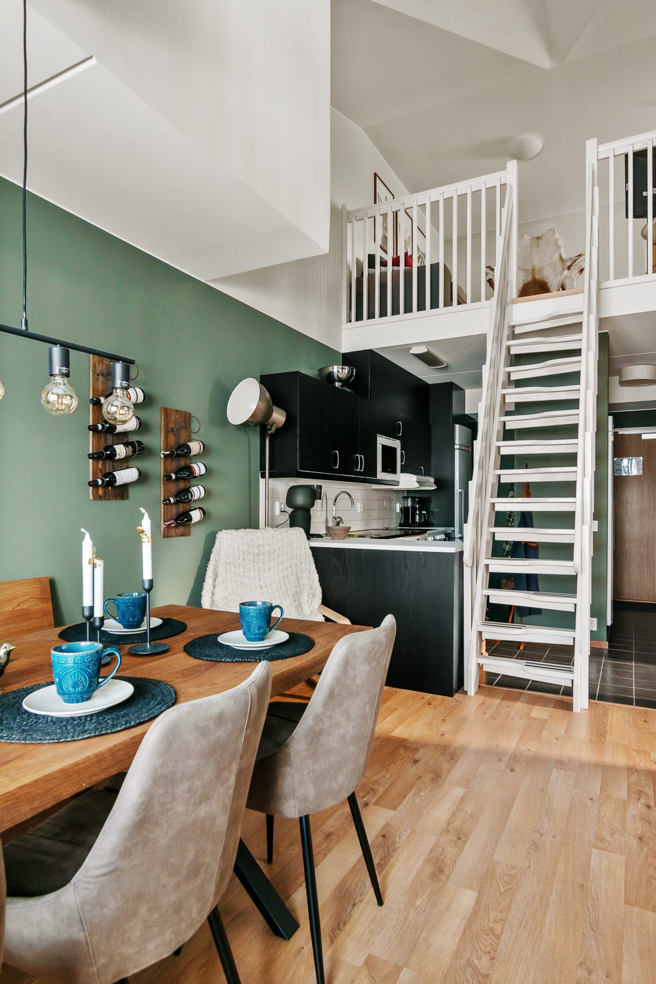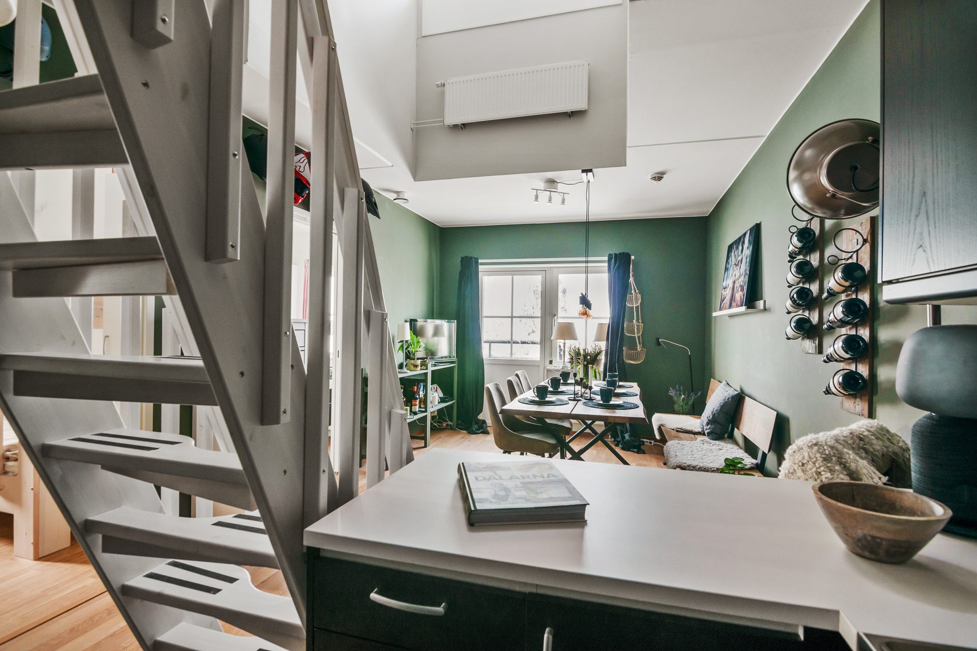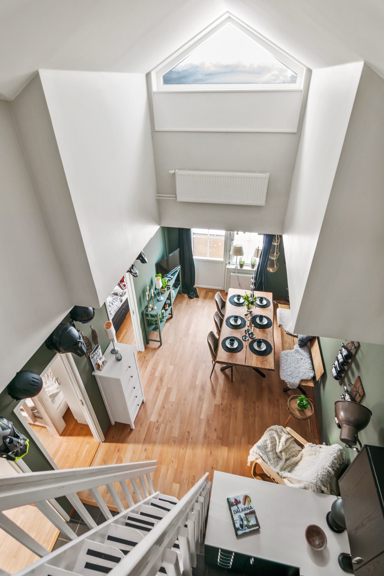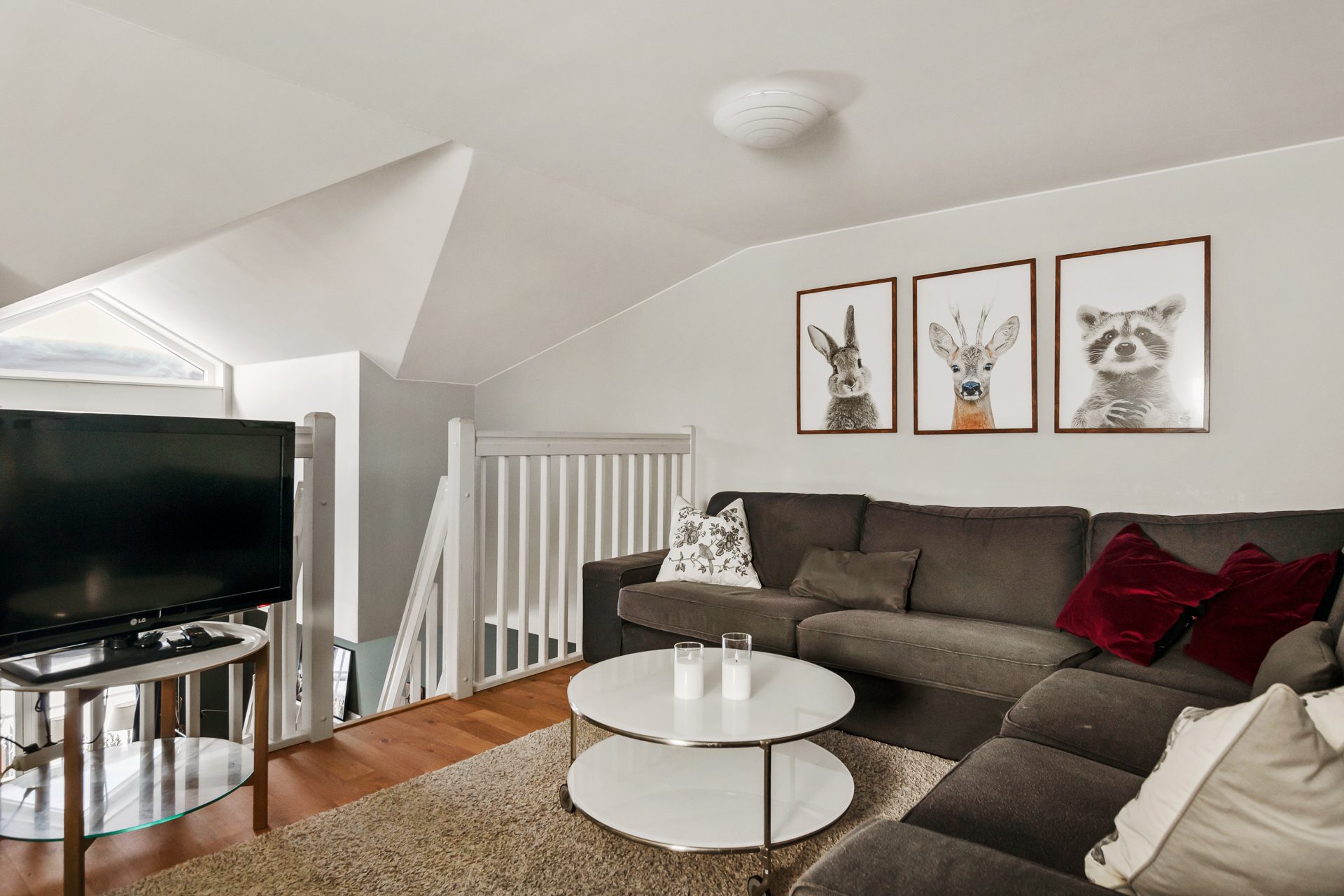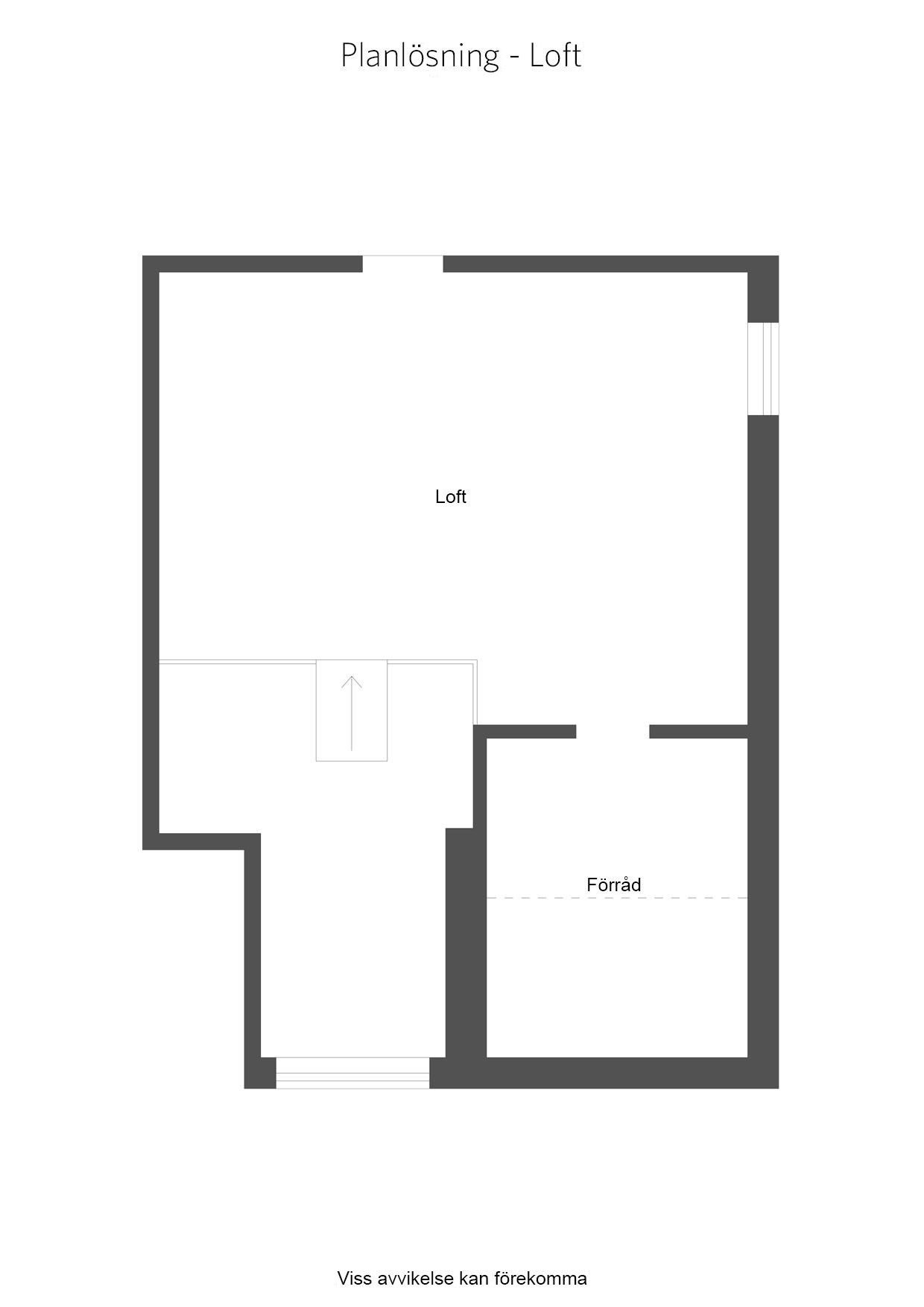 Från vardagsrummet finns trappan upp till loftet som kan inredas till sällskapsrum eller ett extra sovrum. Loftet har en separat ingång utvändigt från det övre våningsplanet samt ett stort förrådsutrymme.