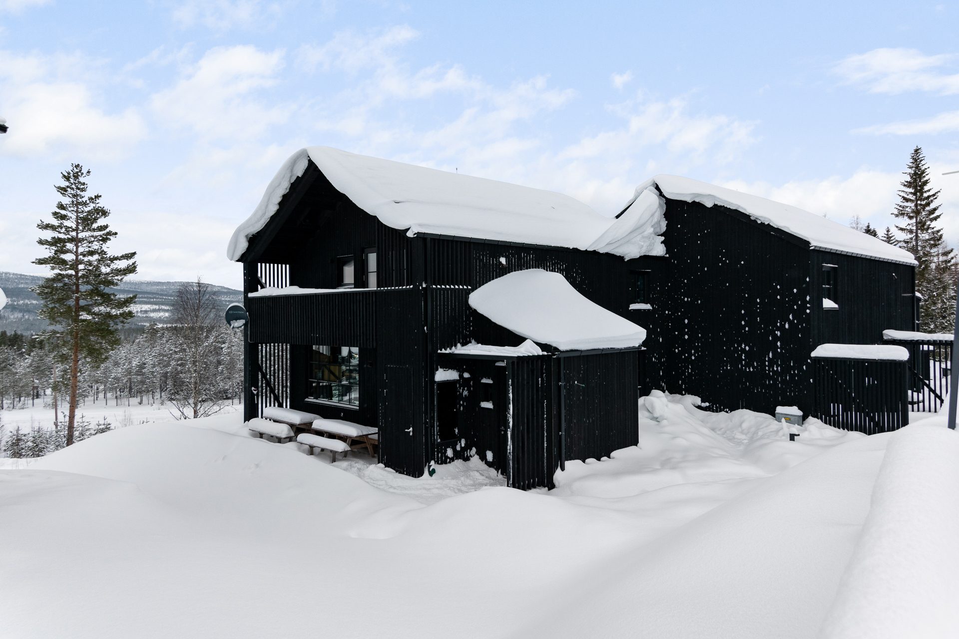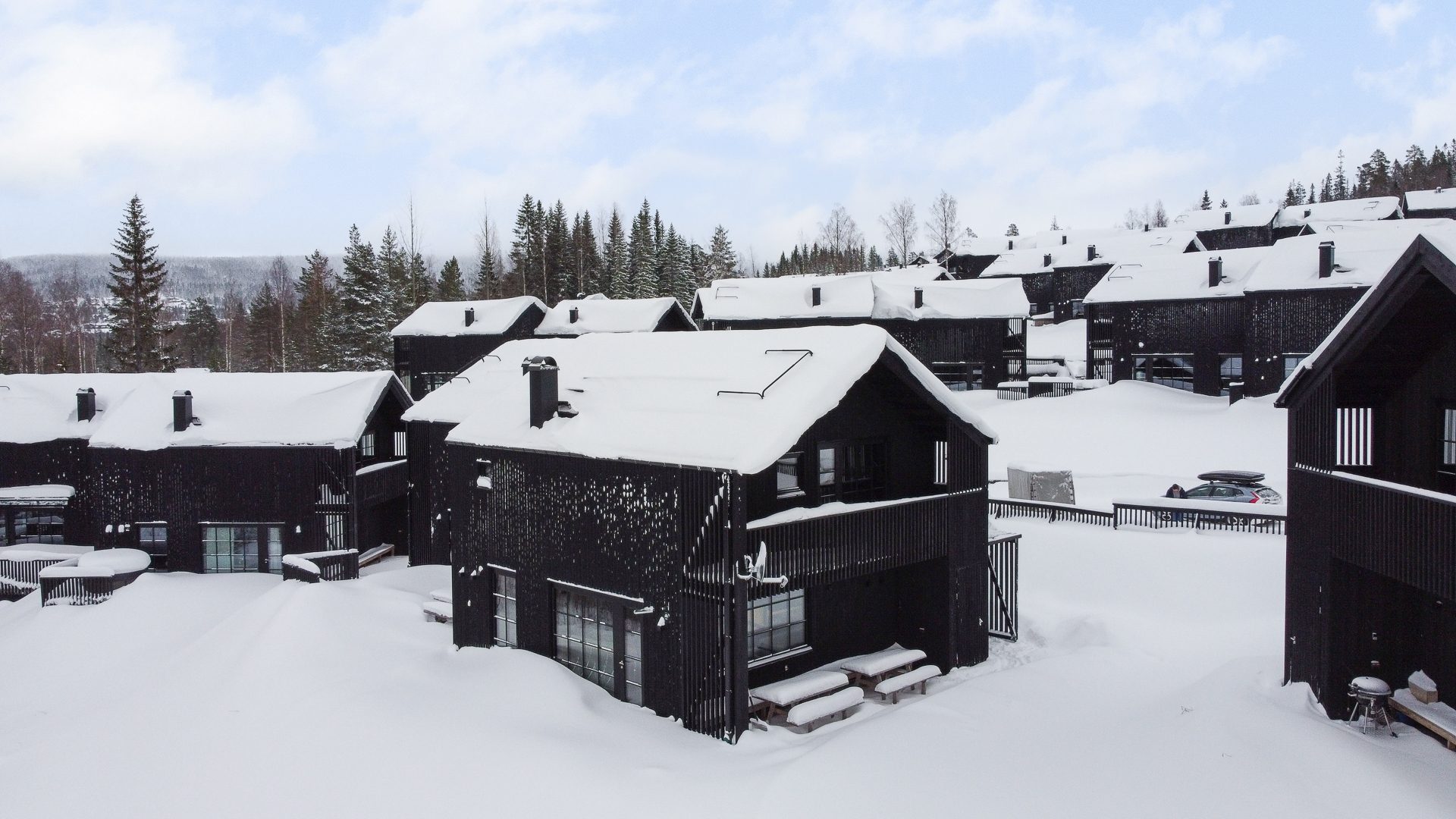 Med ski in- ski out läge i levande vildmarksmiljö, ligger detta skräddarsydda boende med sina anspråksfulla huskroppar. Vackert harmoniserande med sin omgivning. Tanken med husens utformning är att varje hörn ska nyttjas, där de olika rumsligheterna flyter ihop till en helhet med många funktioner. Samtliga inventarier ingår. Detta är ett boende utöver det vanliga. Välkommen på visning!