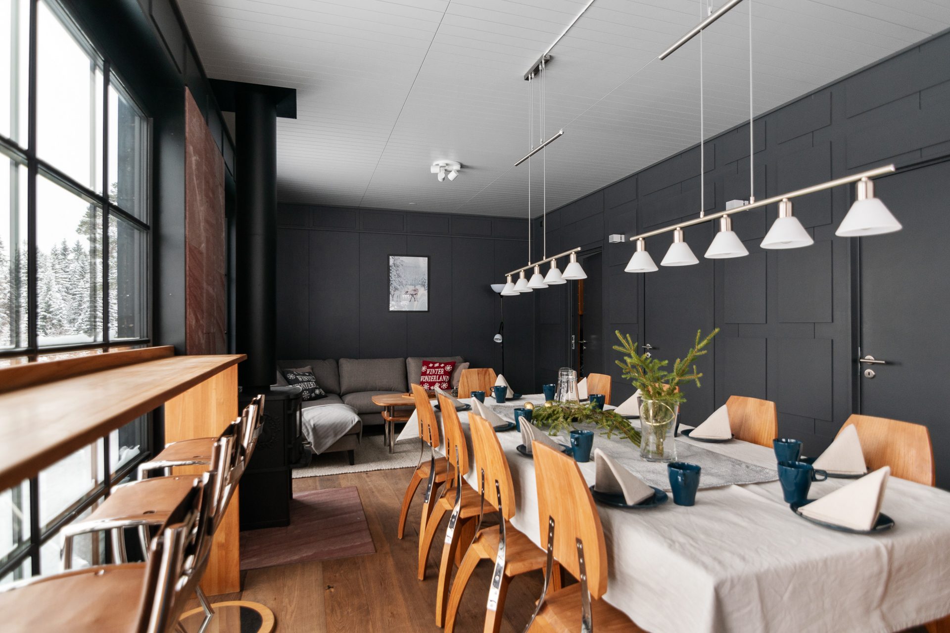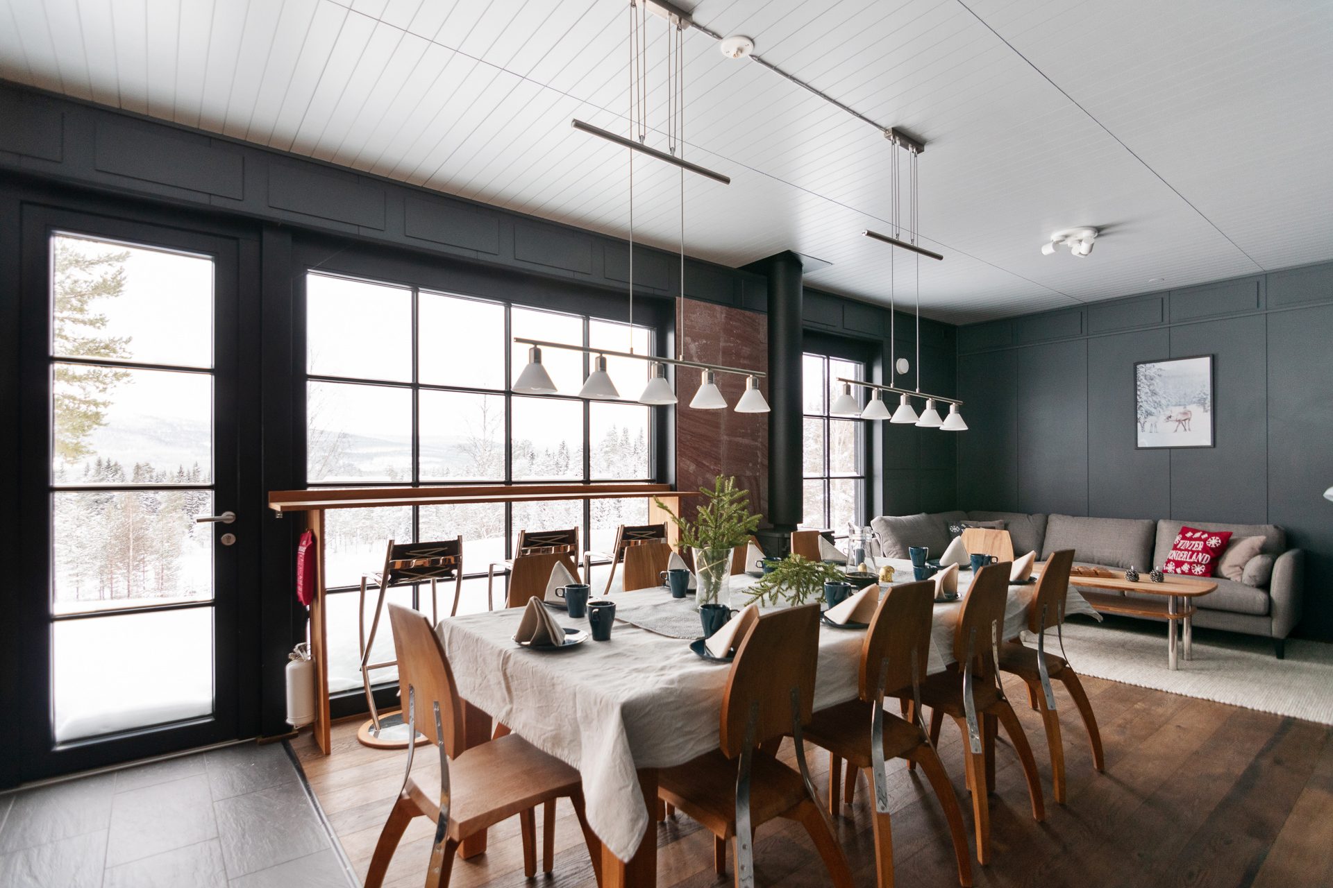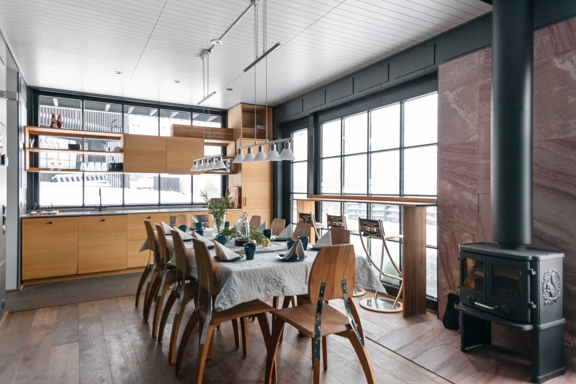 - Allmän beskrivning: Generös hall med golvvärme och pjäxtork. Den tillbyggda hallen öppnar upp mot den inre hallen med sittplatser för av- och påklädning. Det finns både torkskåp och pjäxvärmare. Båda hallarna är synnerligen praktiska när du varit ute backarna och behöver torka blöta kläder. Köket är välutrustat i eleganta och tåliga material som rostfri bänkskiva, släta luckor i träfaner och genomgående svarta detaljer, induktionshäll och integrerade vitvaror. Öppnas hyllor släpper in dagsljus och ger en skön karaktär och personlighet åt köket. Huset hjärta, vardagsrummet ligger med öppen planlösning med köket. Modernt spröjsade fönsterpartier med svartmålat trä tillsammans med en takhöjd på ca 7 meter till nocken och synliga bjälkar skapar detta en underbar känsla av rymd. Omsluten av klädda väggpaneler och omsorgsfulla detaljer i mörk kulör, skapas en känsla av trygghet. I denna miljö möts aktiviteterna kring matlagning, after-ski med sällskapspel eller en stunds avkoppling framför brasan.
