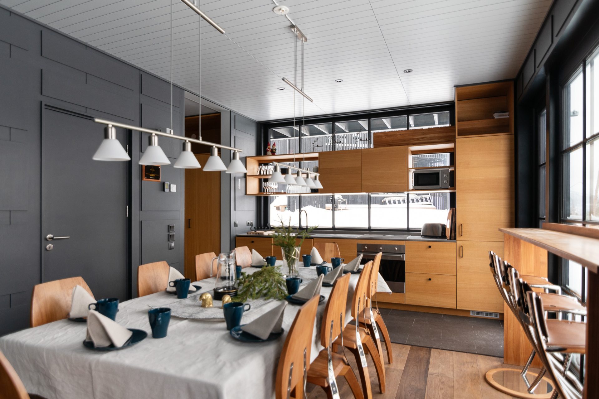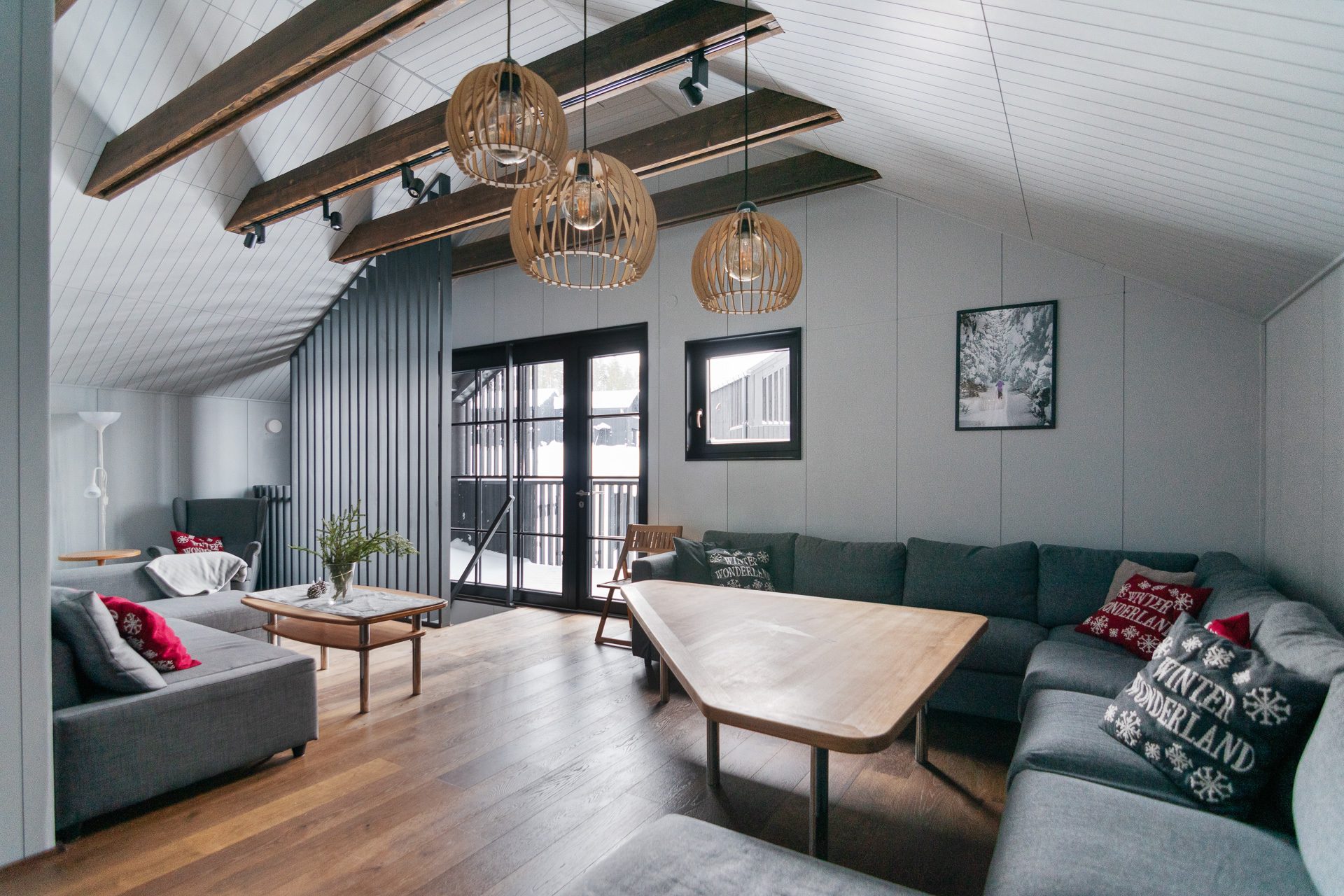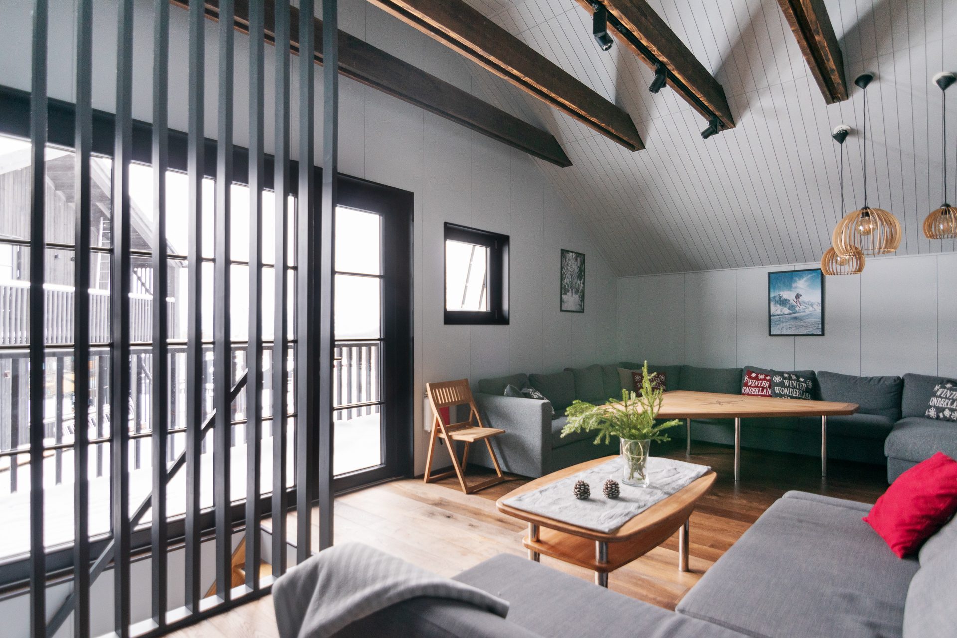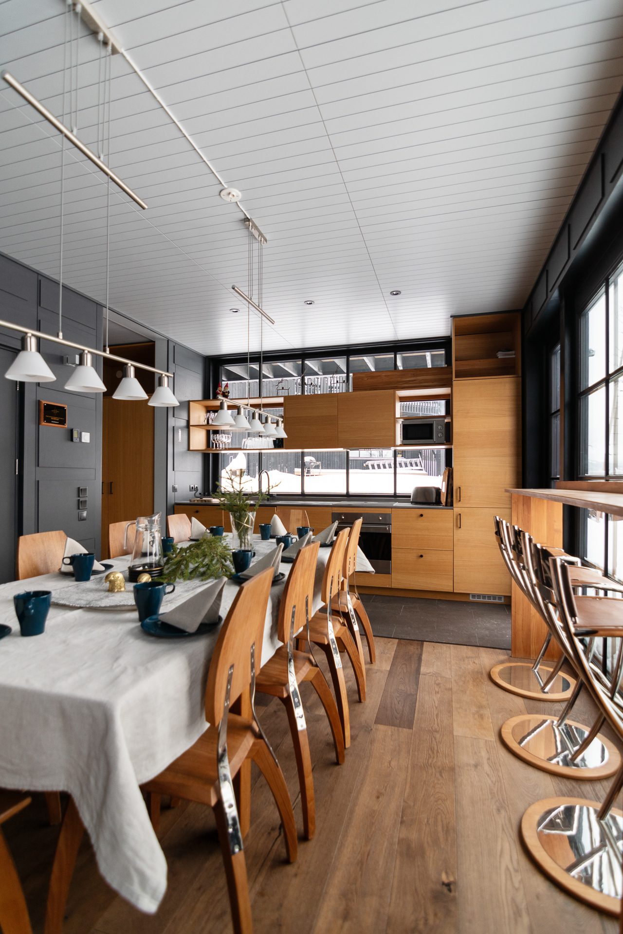 - Allmän beskrivning: Generös hall med golvvärme och pjäxtork. Den tillbyggda hallen öppnar upp mot den inre hallen med sittplatser för av- och påklädning. Det finns både torkskåp och pjäxvärmare. Båda hallarna är synnerligen praktiska när du varit ute backarna och behöver torka blöta kläder. Köket är välutrustat i eleganta och tåliga material som rostfri bänkskiva, släta luckor i träfaner och genomgående svarta detaljer, induktionshäll och integrerade vitvaror. Öppnas hyllor släpper in dagsljus och ger en skön karaktär och personlighet åt köket. Huset hjärta, vardagsrummet ligger med öppen planlösning med köket. Modernt spröjsade fönsterpartier med svartmålat trä tillsammans med en takhöjd på ca 7 meter till nocken och synliga bjälkar skapar detta en underbar känsla av rymd. Omsluten av klädda väggpaneler och omsorgsfulla detaljer i mörk kulör, skapas en känsla av trygghet. I denna miljö möts aktiviteterna kring matlagning, after-ski med sällskapspel eller en stunds avkoppling framför brasan.