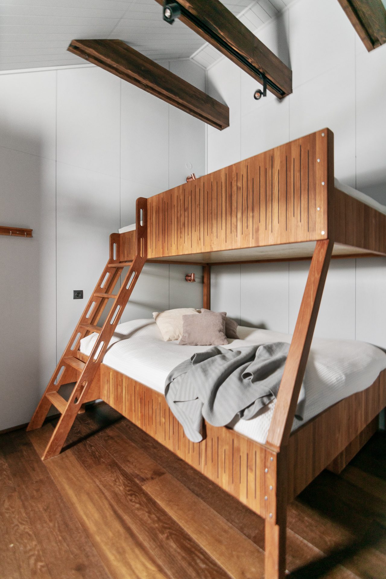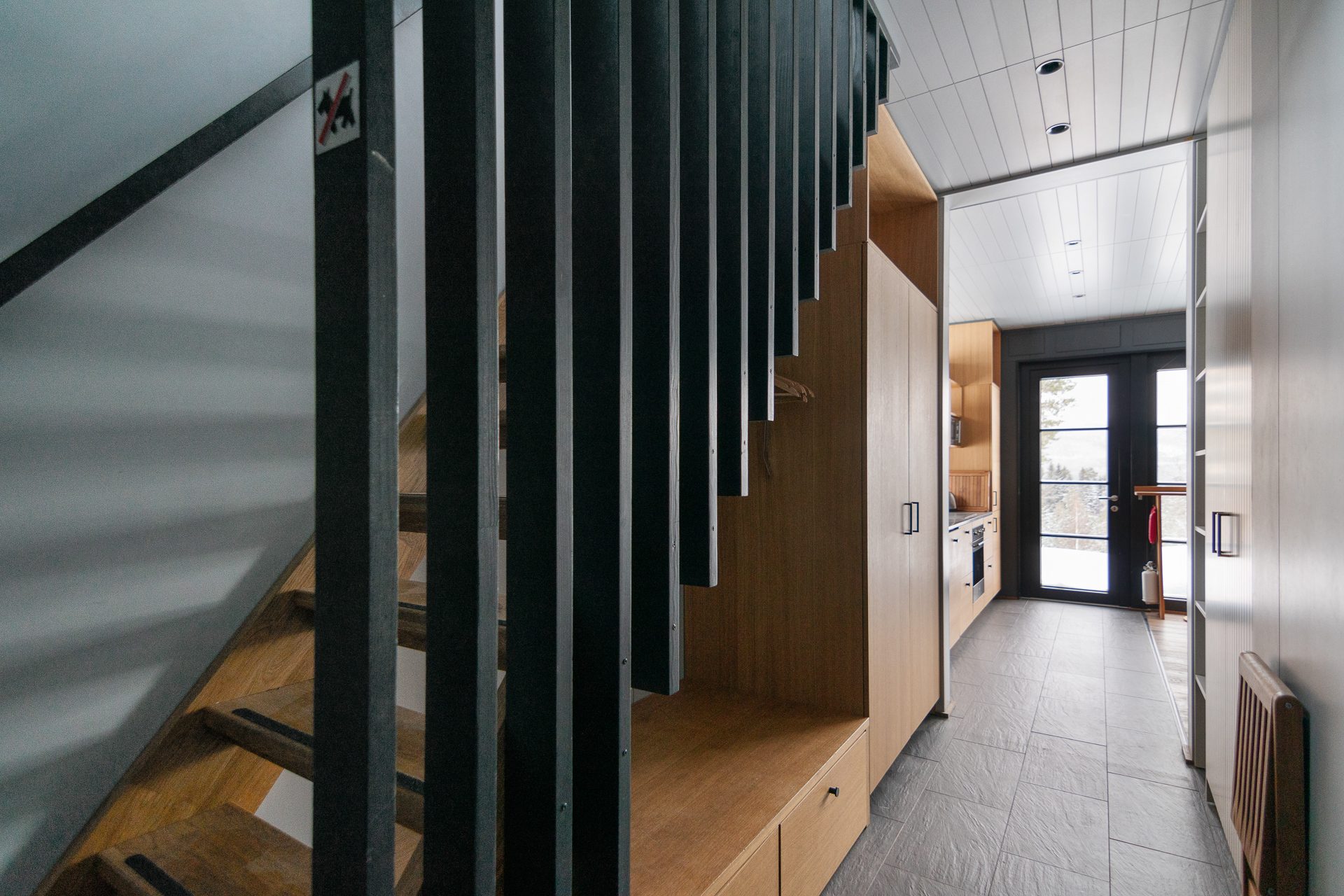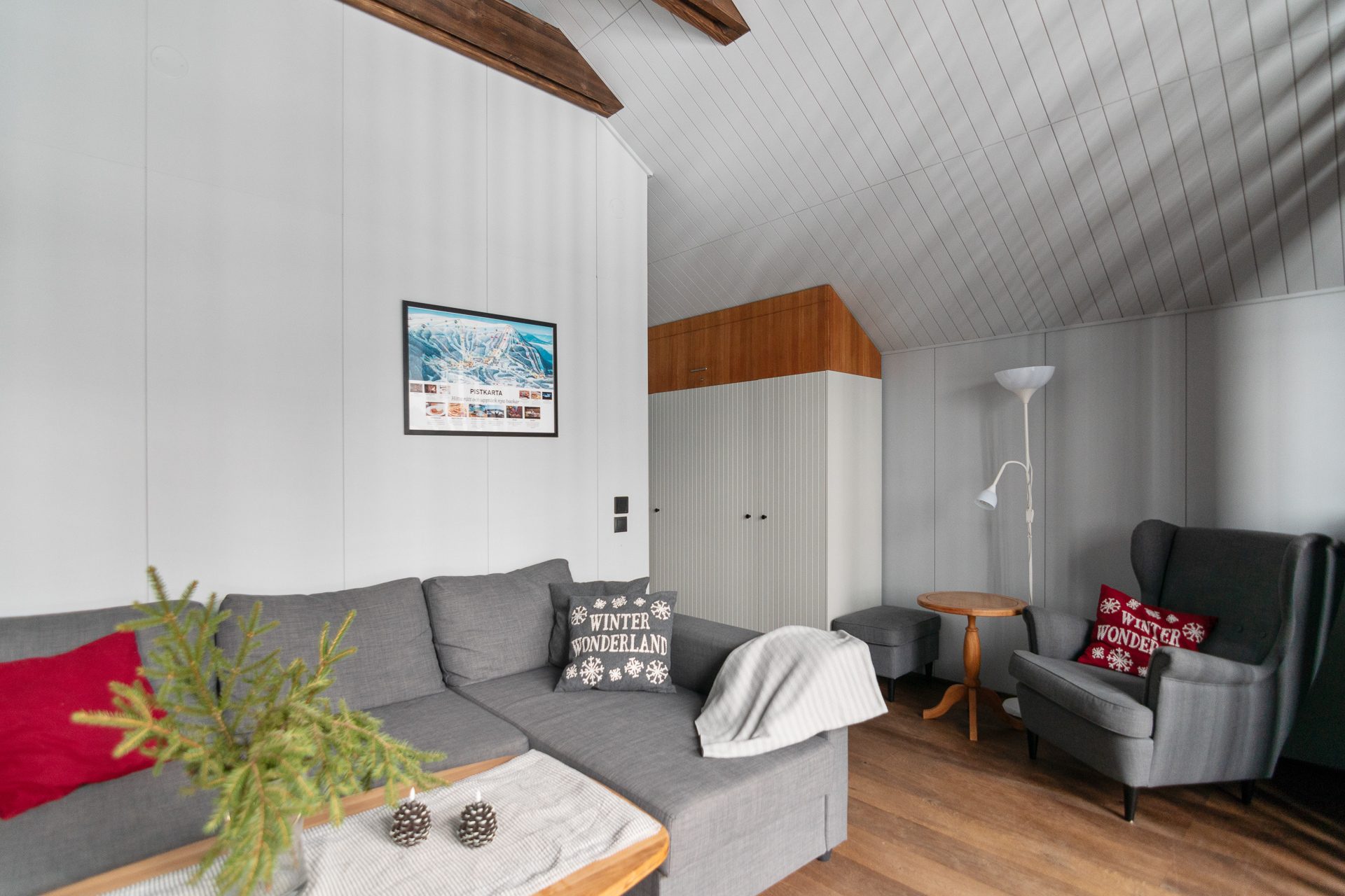 På entréplan finner du även två ombonade sovrum, båda inredda med våningssängar klädda med panel i dova färger. Här hittar du även rymliga garderober som ger bra förvaring samt ett förråd/teknikrum med tvättmaskin vilket gör din vistelse här bekväm och trivsam. Den nybyggda hallen med golvvärme skapar en fin rymd och det blir enkelt att få av sig pjäxorna efter en dag i backarna. Utvändigt intill entrén finns ett skidförråd samt en altan i vinkel.