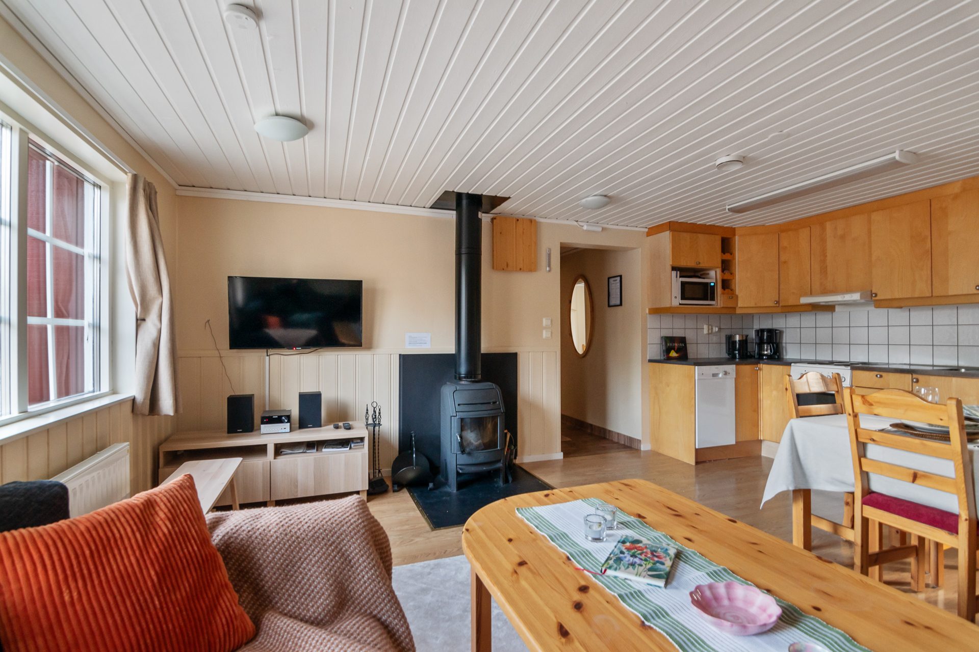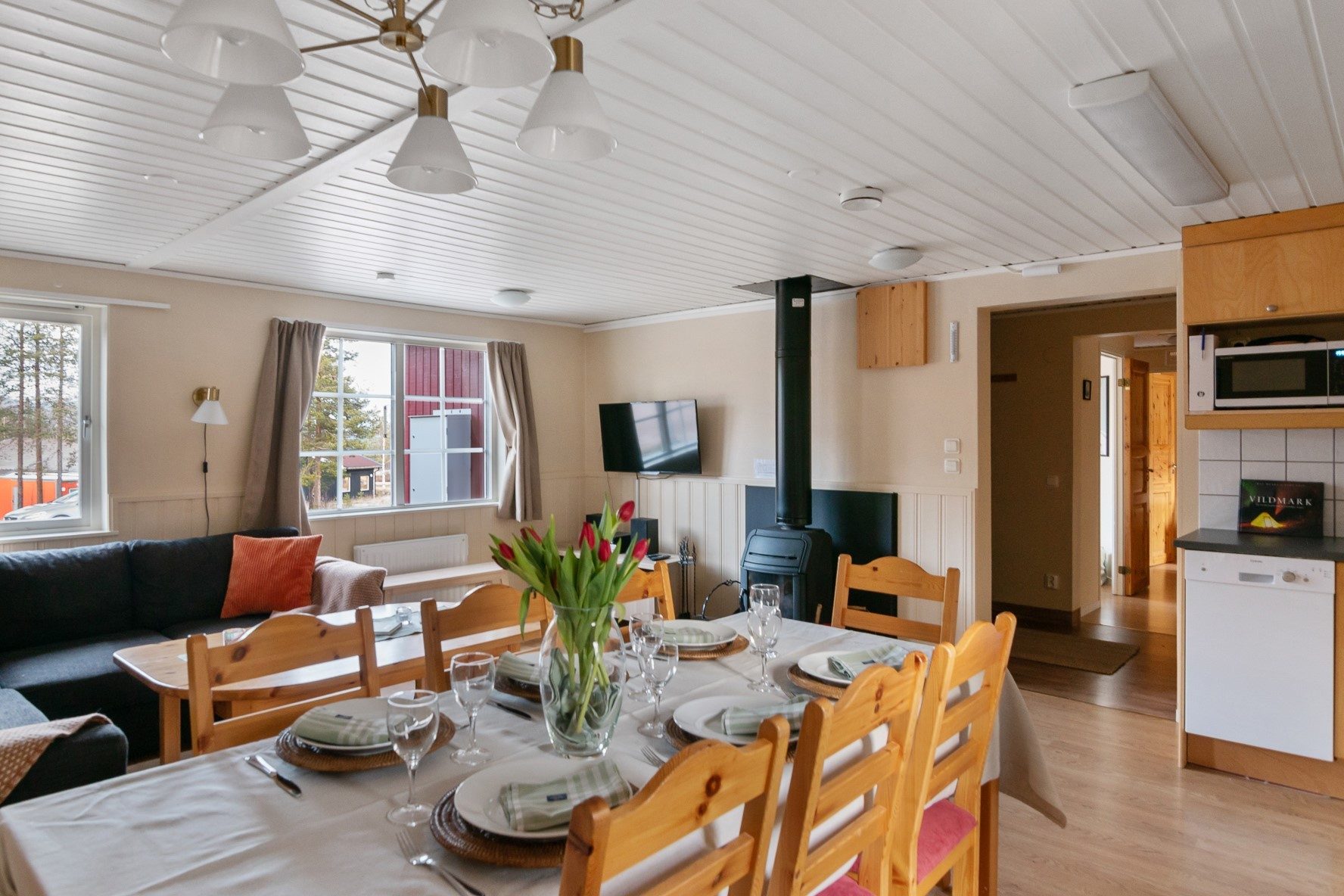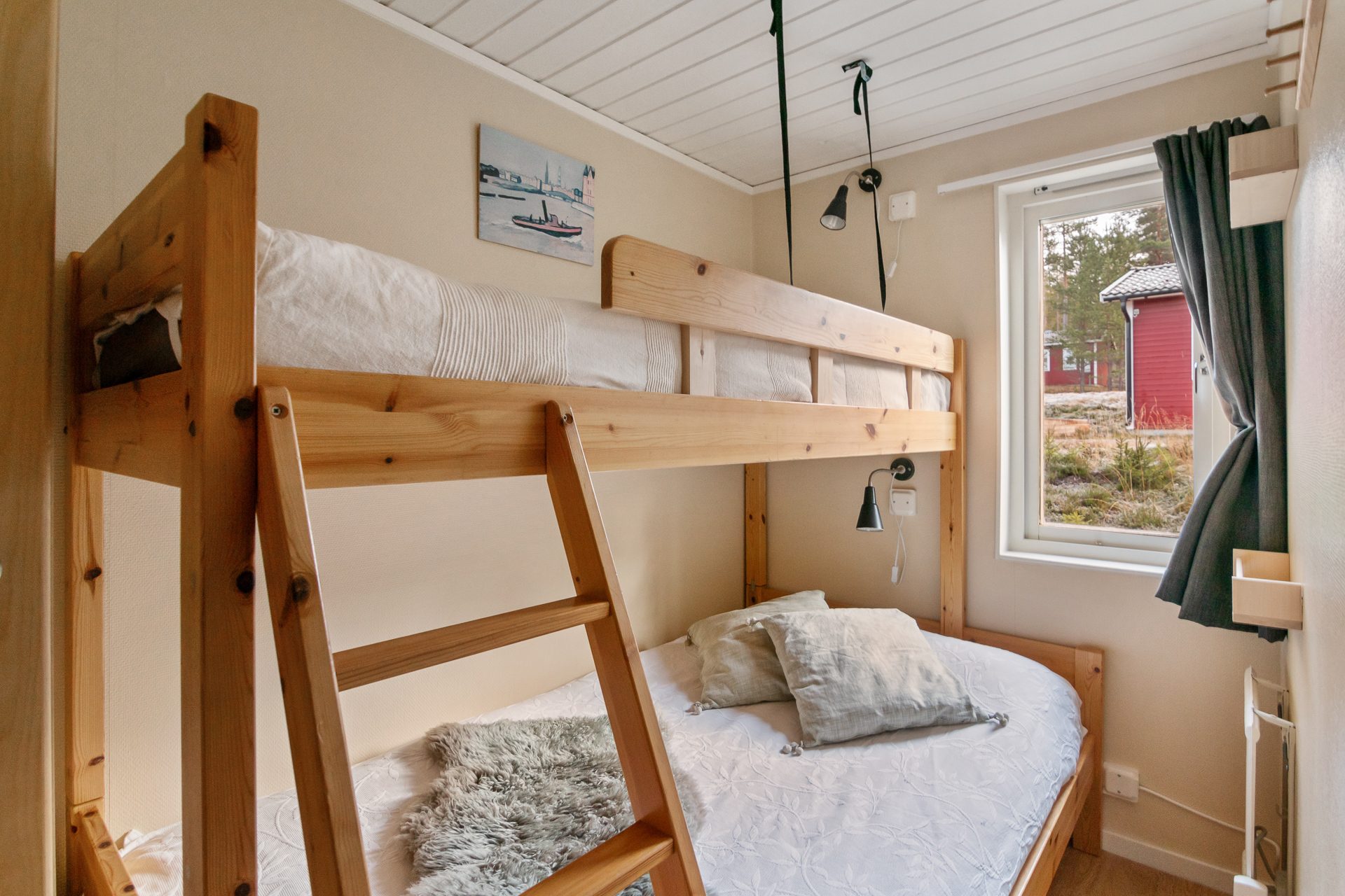 - Allmän beskrivning: Välkomnande och funktionell hall med avhängningsdel, torkskåp och sittbänk. Hallen öppnar upp mot vardagsrummet och köket med öppen planlösning. Vardagsrummet är generöst med fönster i två väderstreck, vedeldad kamin och matplats för 8-10 personer. Köket har bra arbetsytor och full, maskinell utrustning med spis, spisfläkt, kyl, frys och diskmaskin. Privat sovrumsavdelning med totalt tre sovrum. Två av sovrummen håller något mindre storlek med garderober samt plats för en större säng nere och enkelsäng upptill (2+1). Det större sovrummet. master bedroom har dubbelsäng samt garderober. Fint och välhållet badrum i anslutning till sovrummen med dusch, wc, tvättställ och vidbyggd bastu.