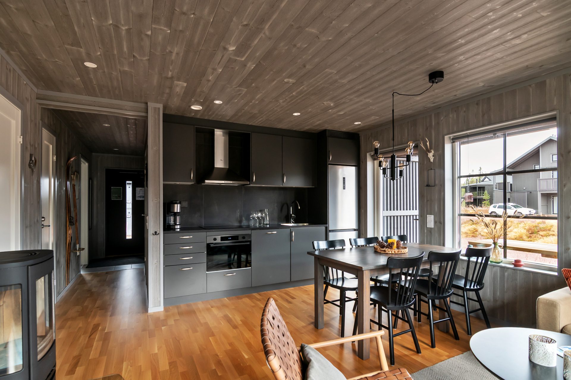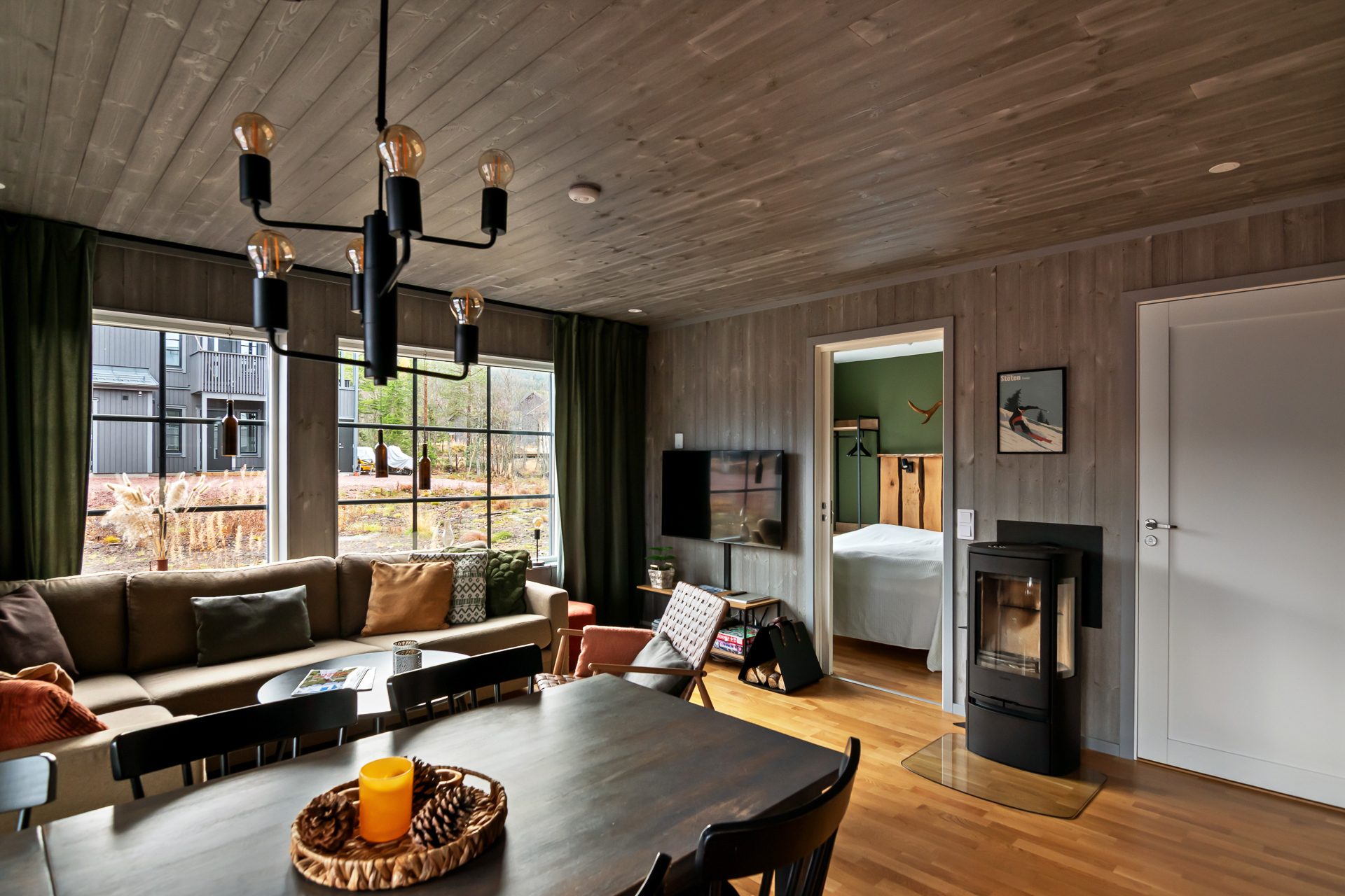 - Allmän beskrivning: Välplanerad lägenhet inredd med smakfulla material och generösa sällskapsytor. Funktionell och synnerligen praktisk hall med sittbänk för 4 personer, klinkergolv och torkskåp. Här är det både enkelt att hålla rent samt torka sina kläder efter en lång dag i backen. Invid hallen ligger ett sovrum med plats för dubbelsäng och mer därtill. Vidare in i lägenheten hittar vi två fullt utrustade badrum med wc, dusch och tvättställ. Ett av badrummen har en vidbyggd bastu och det mindre badrummet är utrustat med tvättmaskin. Vardagsrummet och köket har öppen planlösning. Rummet har generösa fönsterpartier, utgång till altan och en vedeldad kamin med hög mysfaktor. Köket är stilrent och snyggt med full maskinell utrustning bestående av kyl, frys, spishäll, spisfläkt samt diskmaskin.